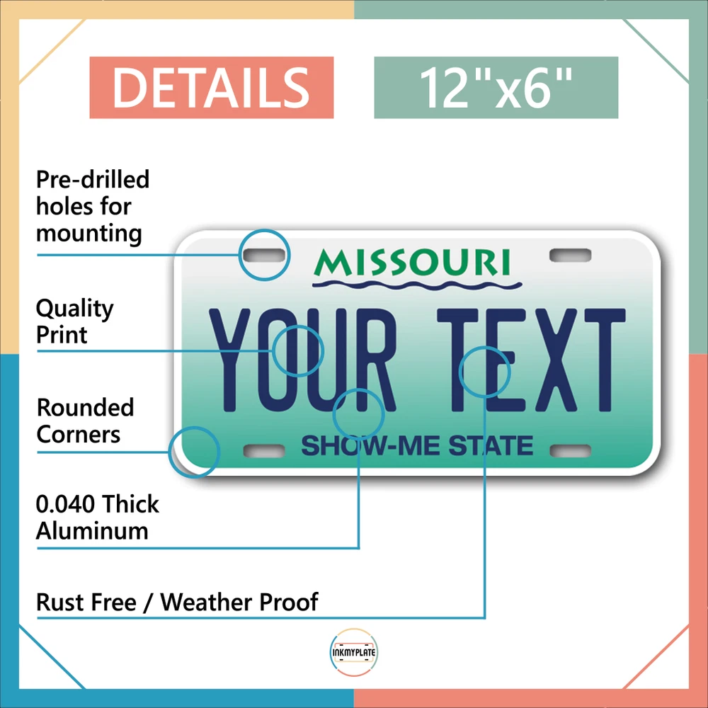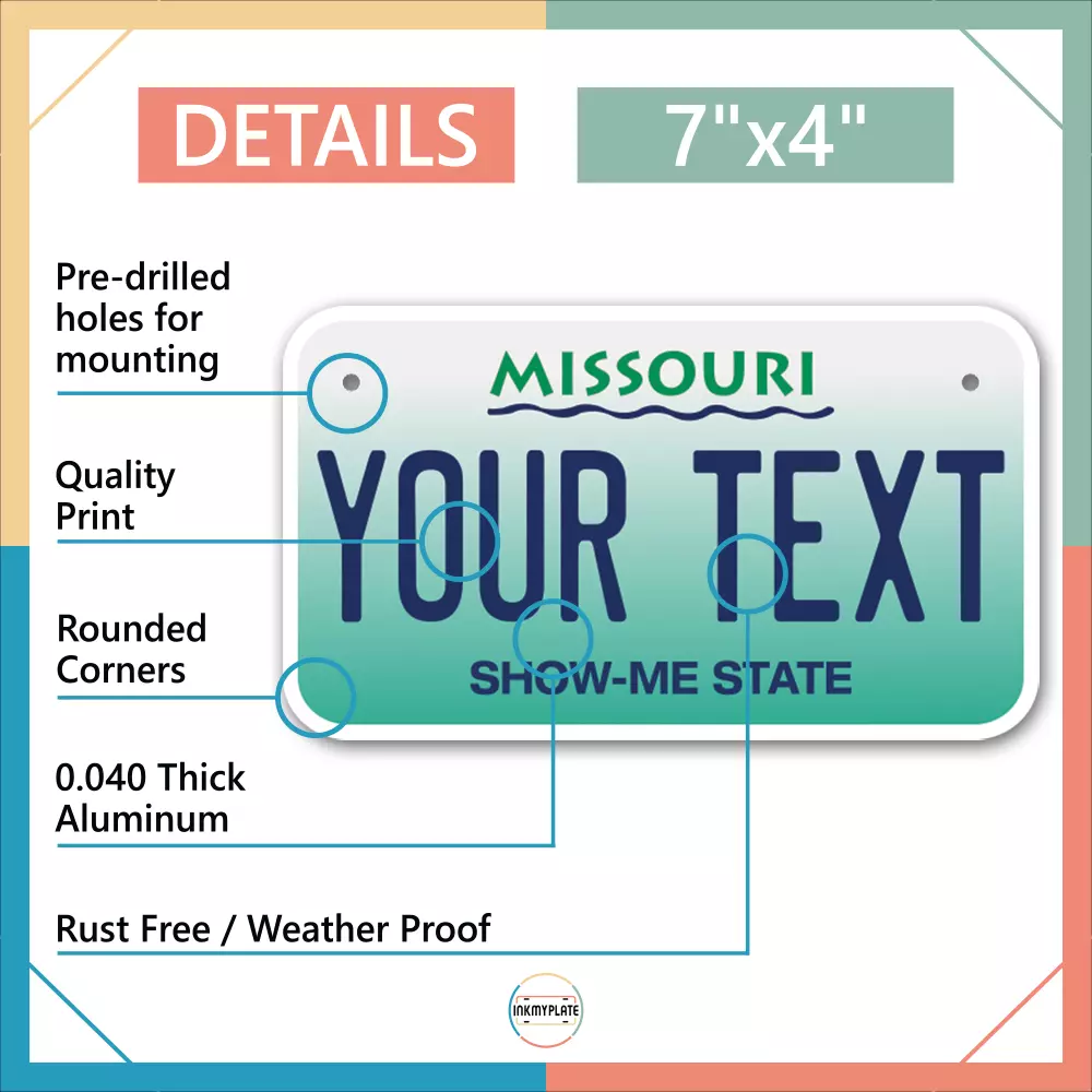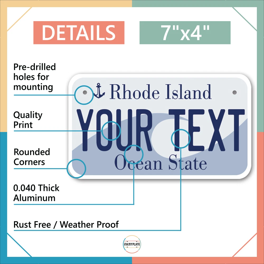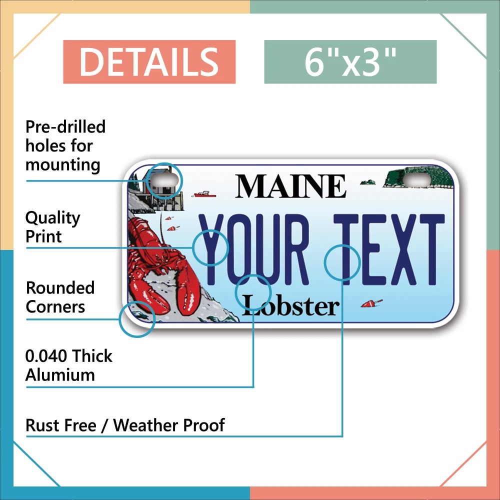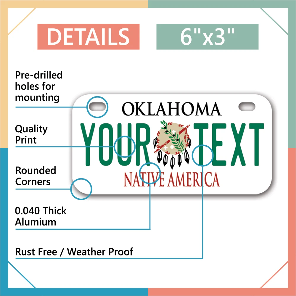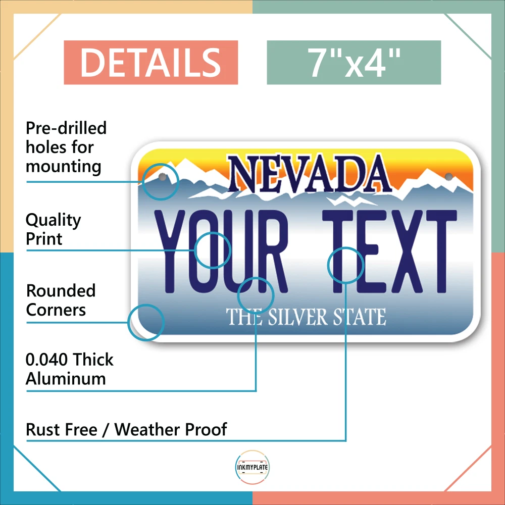 Our LICENSE plates are the most unique souvenirs from the United States, Choose between 50 states and 3 different sizes. Cannot be used in place of a state issued plate. IMPORTANT DESCRIPTION • Plates are made using High quality thick 040 rust free Aluminum. • Our plates are printed flat, not raised. The customizing is done using the latest UV Laser technique for weatherproof and high-quality finish. • 100% made in USA. • Standard car plate has four holes and can be used for trucks, motor homes, and more • M otorcycle plates have 2 holes on top for mounting and can be used on ATVS, Mopeds, Snowmobiles, wheelchairs and golf carts • B ike plates have two holes on top and can also be used for toy cars, wagons, electric toy cars, tricycles and more • Write your text in the personalization section. The text will be copied and pasted on the license plate as sent, so make sure of the spelling, punctuation, capitalization, etc. If you have any question regarding your text or you would like a preview, please let us know by adding a note or contacting Alabama | Alaska | Arizona | Arkansas | California | Colorado | Connecticut | Delaware | Florida | Georgia | Hawaii | Idaho | Illinois | Indiana | Iowa | Kansas | Kentucky | Louisiana | Maine | Maryland | Massachusetts | Michigan | Minnesota | Mississippi | Missouri | Montana | Nebraska | Nevada | New Hampshire | New Jersey | New Mexico | New York | North Carolina | North Dakota | Ohio | Oklahoma | Oregon | Pennsylvania | Puerto Rico | Rhode Island | South Carolina | South Dakota | Tennessee | Texas | Utah | Vermont | Virginia | Washington | West Virginia | Wisconsin | Wyoming
