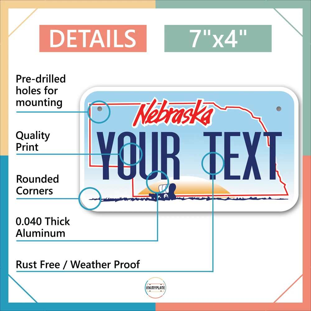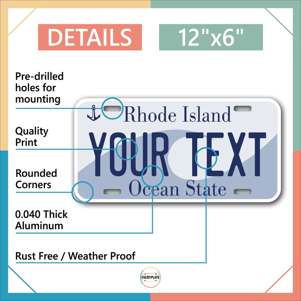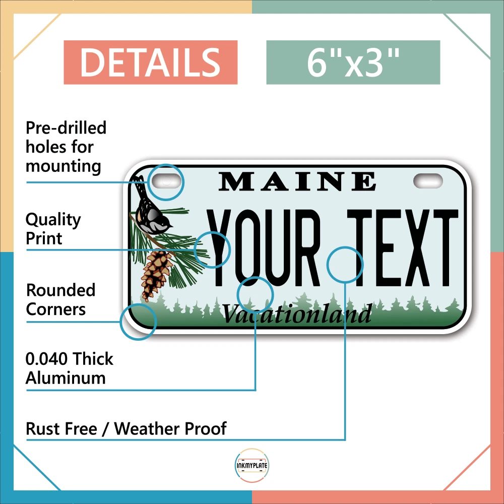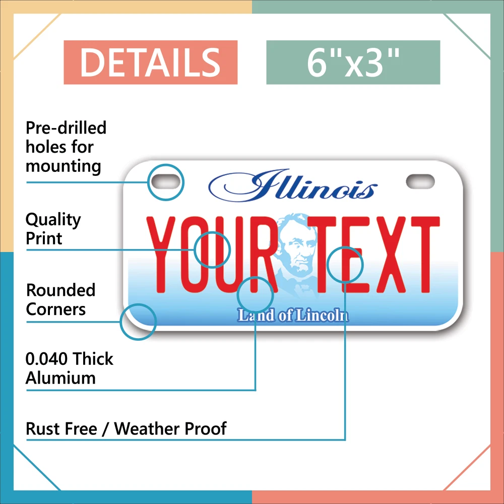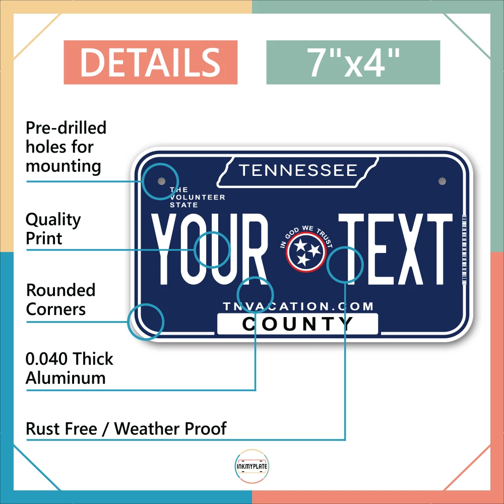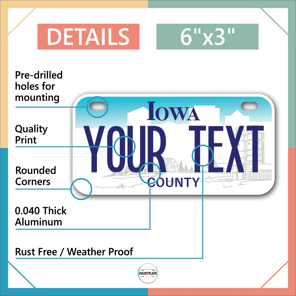 Our LICENSE plates are the most unique souvenirs from the United States, Choose between 50 states and 3 different sizes. Cannot be used in place of a state issued plate. IMPORTANT DESCRIPTION • Plates are made using High quality thick 040 rust free Aluminum. • Our plates are printed flat, not raised. The customizing is done using the latest UV Laser technique for weatherproof and high-quality finish. • 100% made in USA. • Standard car plate has four holes and can be used for trucks, motor homes, and more • M otorcycle plates have 2 holes on top for mounting and can be used on ATVS, Mopeds, Snowmobiles, wheelchairs and golf carts • B ike plates have two holes on top and can also be used for toy cars, wagons, electric toy cars, tricycles and more • Write your text in the personalization section. The text will be copied and pasted on the license plate as sent, so make sure of the spelling, punctuation, capitalization, etc. If you have any question regarding your text or you would like a preview, please let us know by adding a note or contacting Alabama | Alaska | Arizona | Arkansas | California | Colorado | Connecticut | Delaware | Florida | Georgia | Hawaii | Idaho | Illinois | Indiana | Iowa | Kansas | Kentucky | Louisiana | Maine | Maryland | Massachusetts | Michigan | Minnesota | Mississippi | Missouri | Montana | Nebraska | Nevada | New Hampshire | New Jersey | New Mexico | New York | North Carolina | North Dakota | Ohio | Oklahoma | Oregon | Pennsylvania | Puerto Rico | Rhode Island | South Carolina | South Dakota | Tennessee | Texas | Utah | Vermont | Virginia | Washington | West Virginia | Wisconsin | Wyoming
