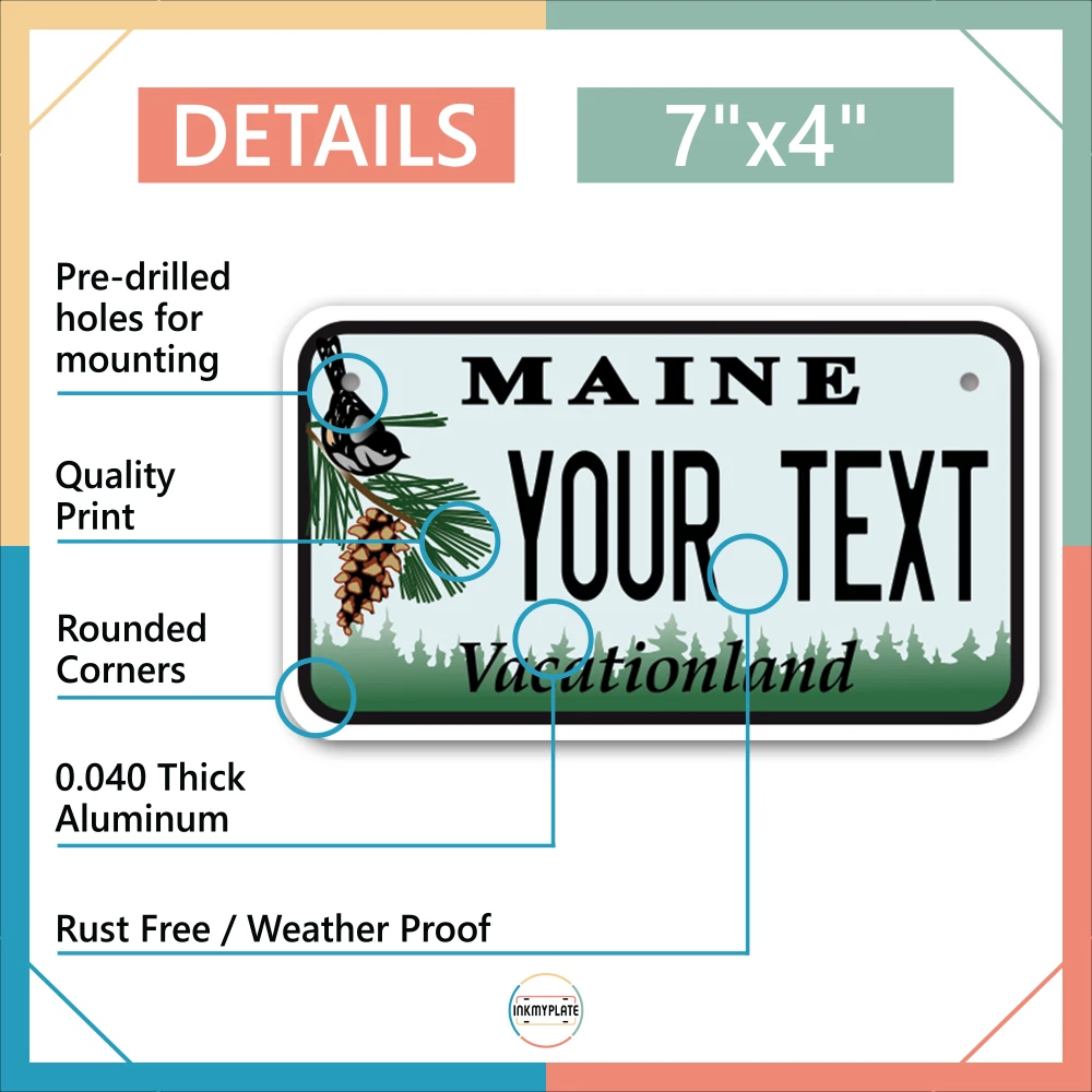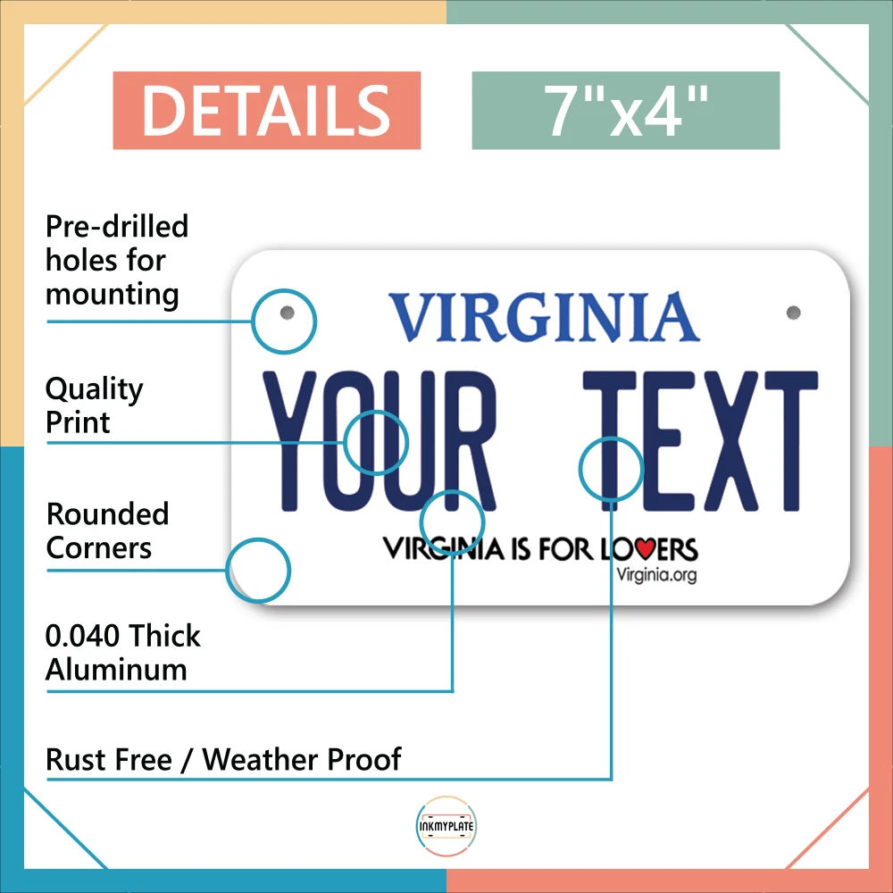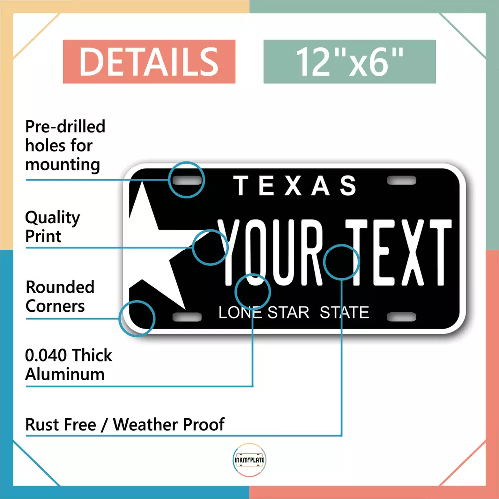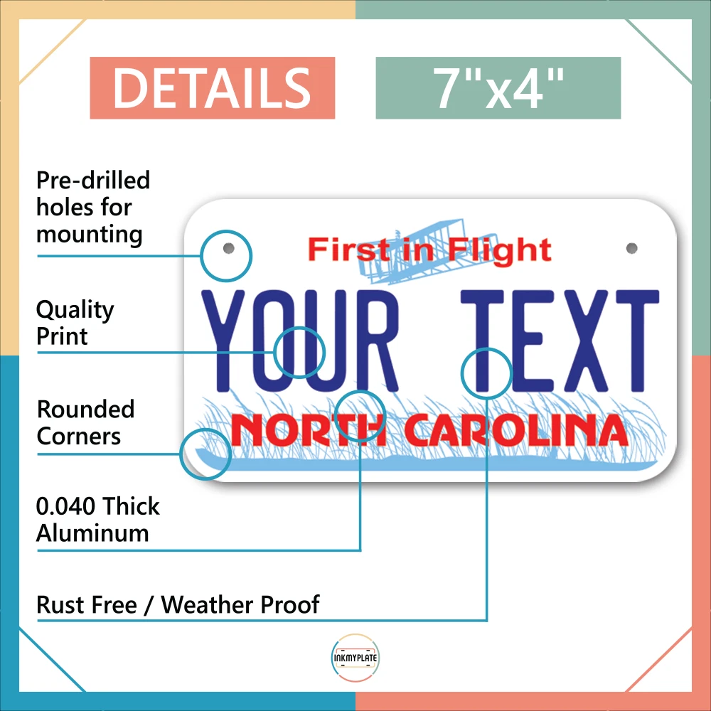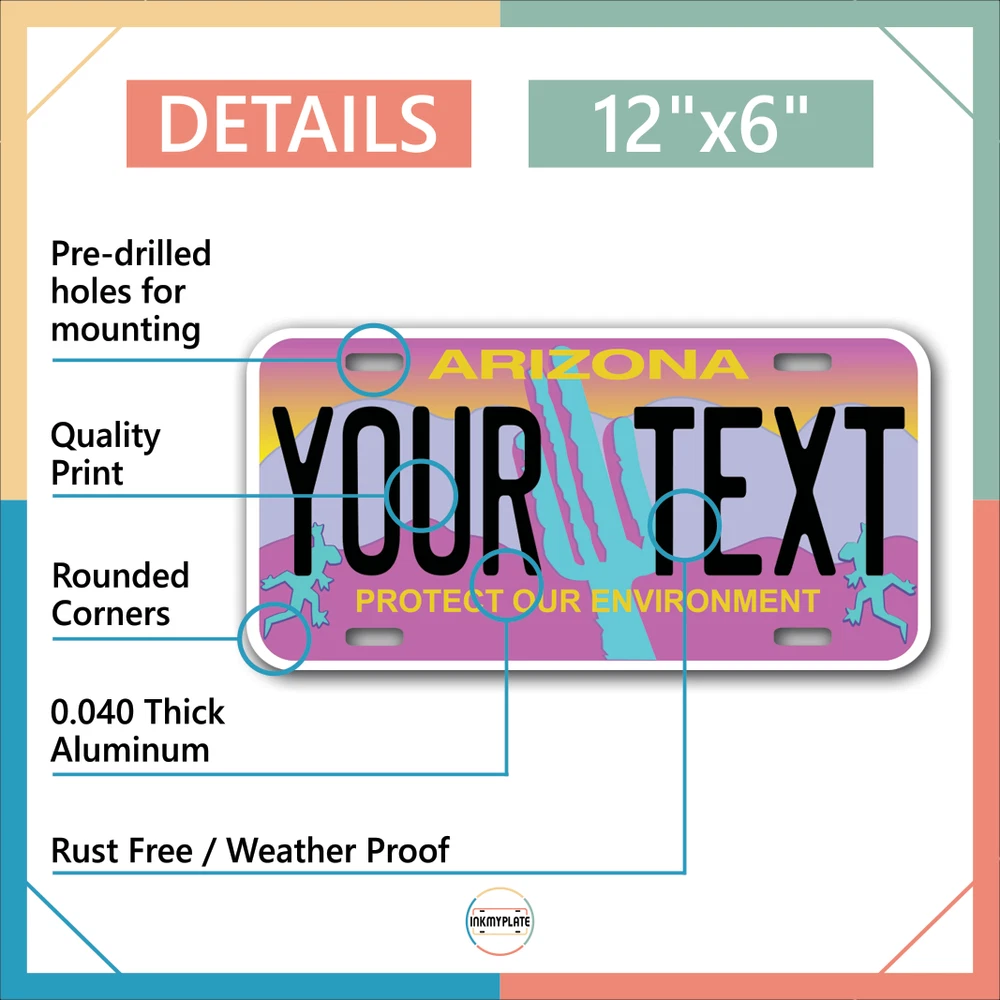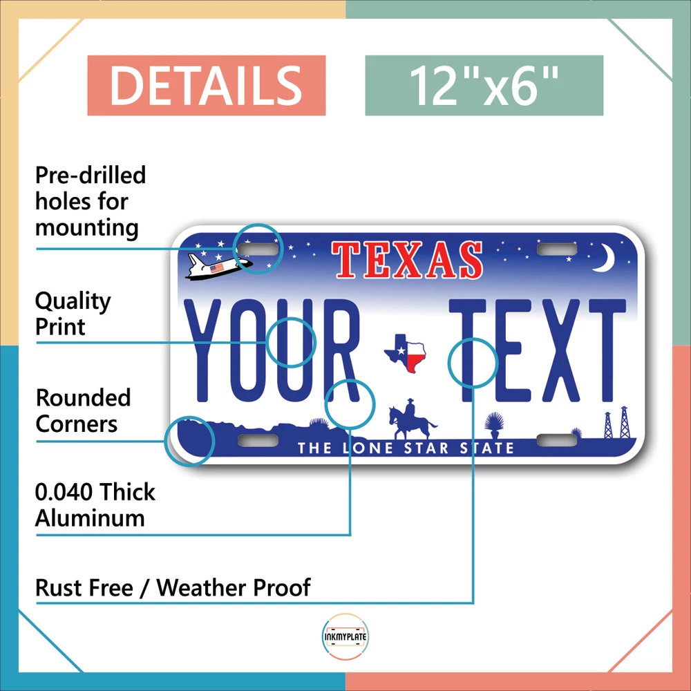 Our LICENSE plates are the most unique souvenirs from the United States, Choose between 50 states and 3 different sizes. Cannot be used in place of a state issued plate. IMPORTANT DESCRIPTION • Plates are made using High quality thick 040 rust free Aluminum. • Our plates are printed flat, not raised. The customizing is done using the latest UV Laser technique for weatherproof and high-quality finish. • 100% made in USA. • Standard car plate has four holes and can be used for trucks, motor homes, and more • M otorcycle plates have 2 holes on top for mounting and can be used on ATVS, Mopeds, Snowmobiles, wheelchairs and golf carts • B ike plates have two holes on top and can also be used for toy cars, wagons, electric toy cars, tricycles and more • Write your text in the personalization section. The text will be copied and pasted on the license plate as sent, so make sure of the spelling, punctuation, capitalization, etc. If you have any question regarding your text or you would like a preview, please let us know by adding a note or contacting Alabama | Alaska | Arizona | Arkansas | California | Colorado | Connecticut | Delaware | Florida | Georgia | Hawaii | Idaho | Illinois | Indiana | Iowa | Kansas | Kentucky | Louisiana | Maine | Maryland | Massachusetts | Michigan | Minnesota | Mississippi | Missouri | Montana | Nebraska | Nevada | New Hampshire | New Jersey | New Mexico | New York | North Carolina | North Dakota | Ohio | Oklahoma | Oregon | Pennsylvania | Puerto Rico | Rhode Island | South Carolina | South Dakota | Tennessee | Texas | Utah | Vermont | Virginia | Washington | West Virginia | Wisconsin | Wyoming