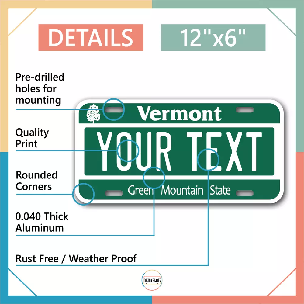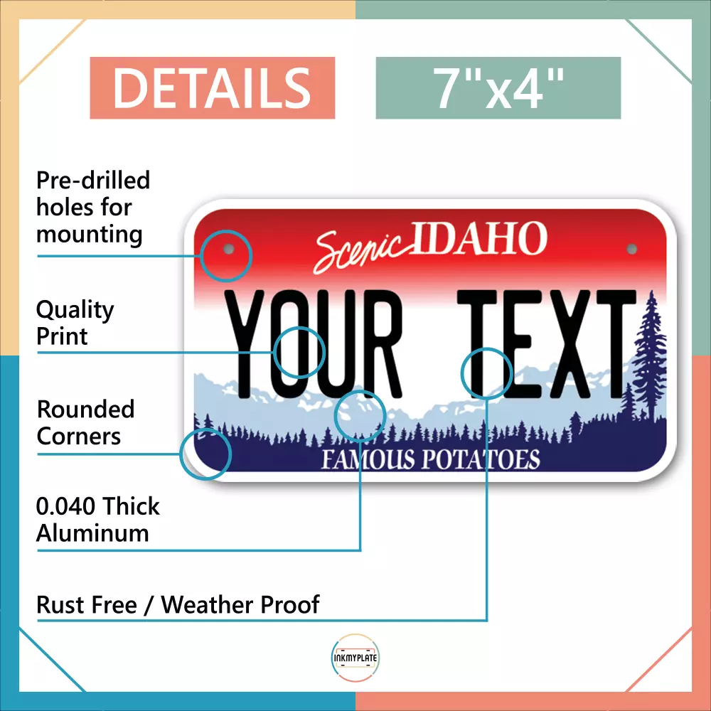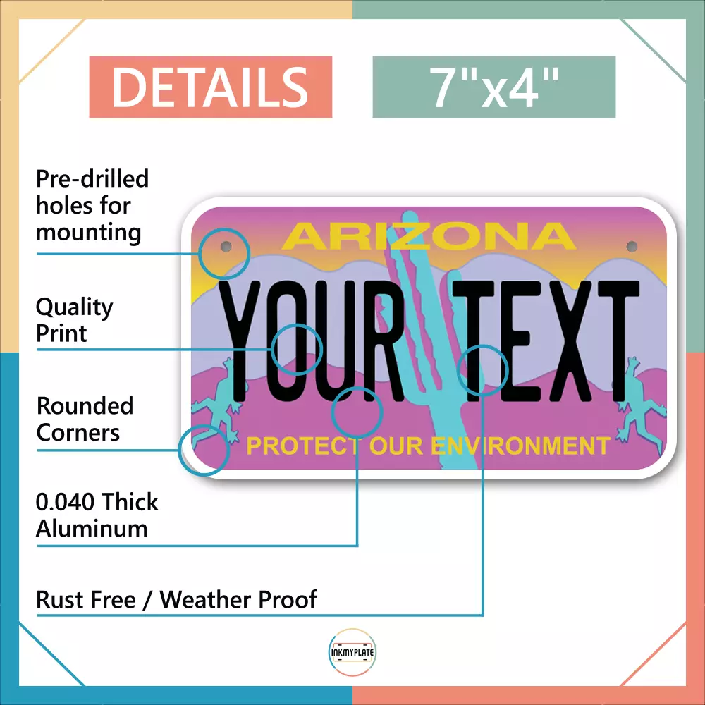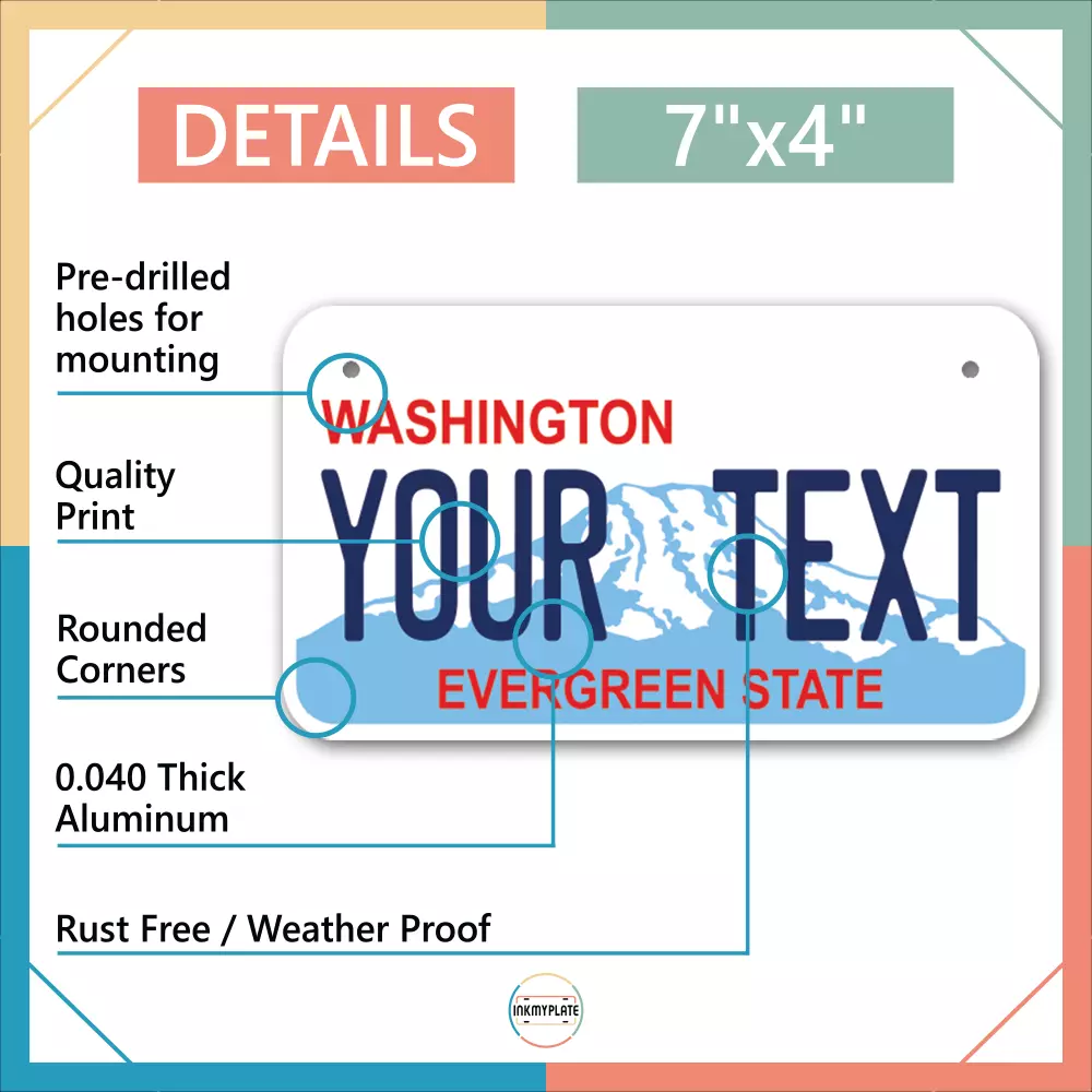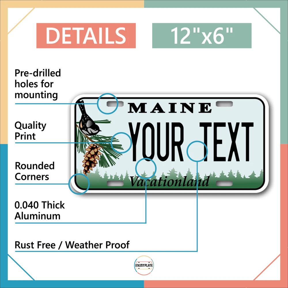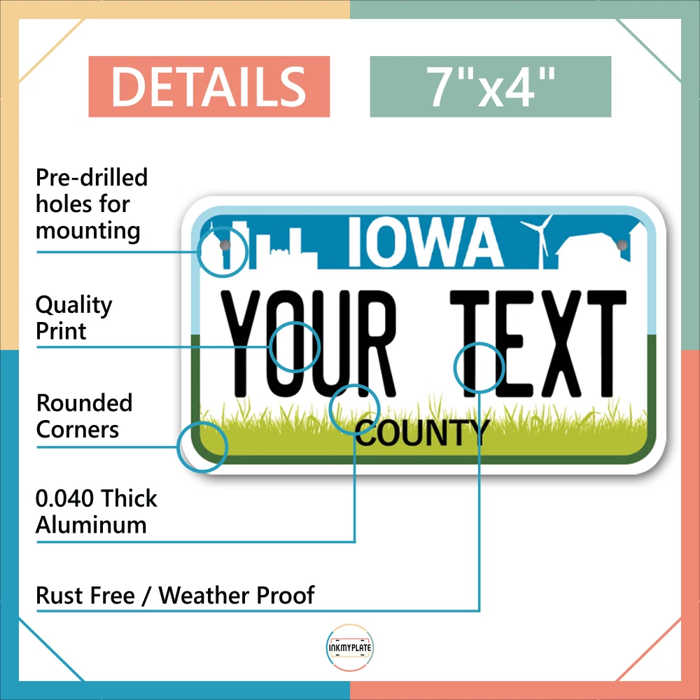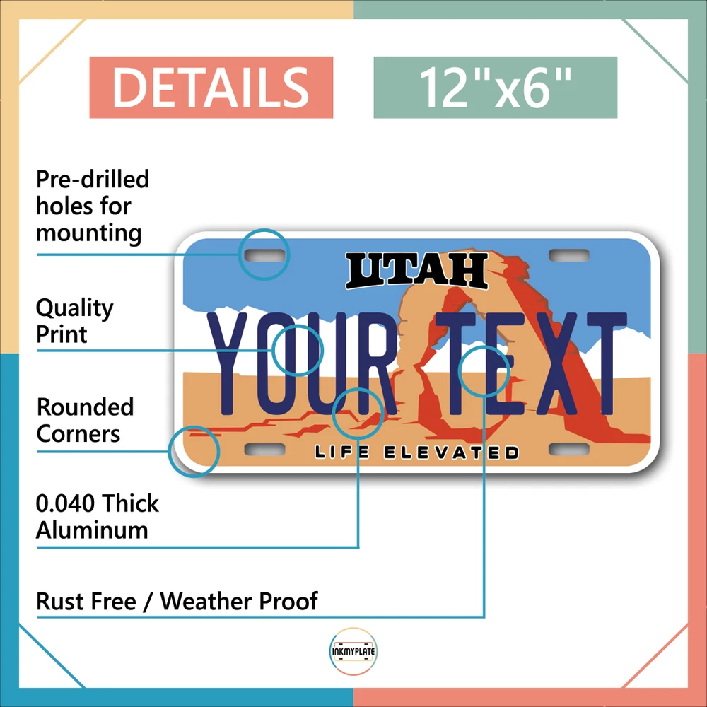 Our LICENSE plates are the most unique souvenirs from the United States, Choose between 50 states and 3 different sizes. Cannot be used in place of a state issued plate. IMPORTANT DESCRIPTION • Plates are made using High quality thick 040 rust free Aluminum. • Our plates are printed flat, not raised. The customizing is done using the latest UV Laser technique for weatherproof and high-quality finish. • 100% made in USA. • Standard car plate has four holes and can be used for trucks, motor homes, and more • M otorcycle plates have 2 holes on top for mounting and can be used on ATVS, Mopeds, Snowmobiles, wheelchairs and golf carts • B ike plates have two holes on top and can also be used for toy cars, wagons, electric toy cars, tricycles and more • Write your text in the personalization section. The text will be copied and pasted on the license plate as sent, so make sure of the spelling, punctuation, capitalization, etc. If you have any question regarding your text or you would like a preview, please let us know by adding a note or contacting Alabama | Alaska | Arizona | Arkansas | California | Colorado | Connecticut | Delaware | Florida | Georgia | Hawaii | Idaho | Illinois | Indiana | Iowa | Kansas | Kentucky | Louisiana | Maine | Maryland | Massachusetts | Michigan | Minnesota | Mississippi | Missouri | Montana | Nebraska | Nevada | New Hampshire | New Jersey | New Mexico | New York | North Carolina | North Dakota | Ohio | Oklahoma | Oregon | Pennsylvania | Puerto Rico | Rhode Island | South Carolina | South Dakota | Tennessee | Texas | Utah | Vermont | Virginia | Washington | West Virginia | Wisconsin | Wyoming