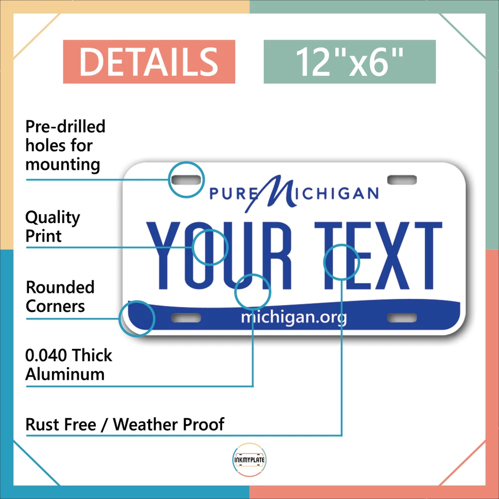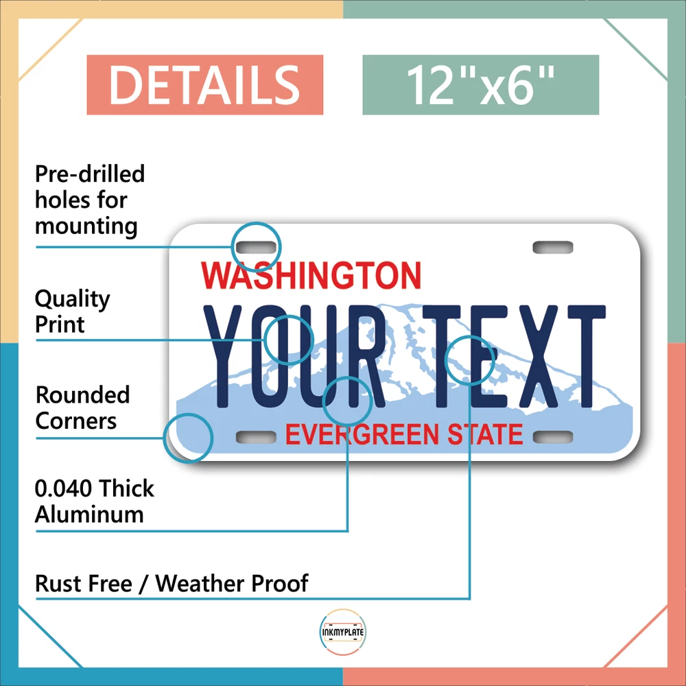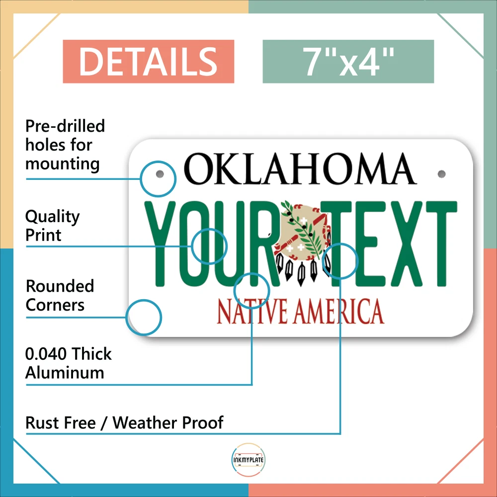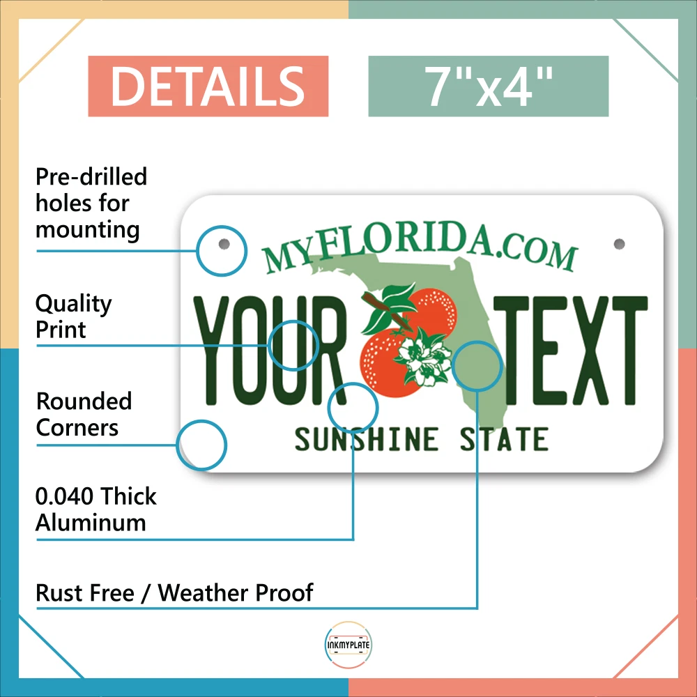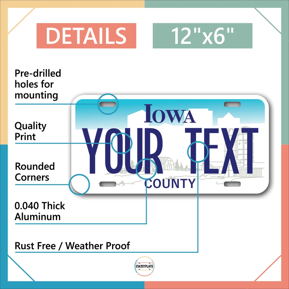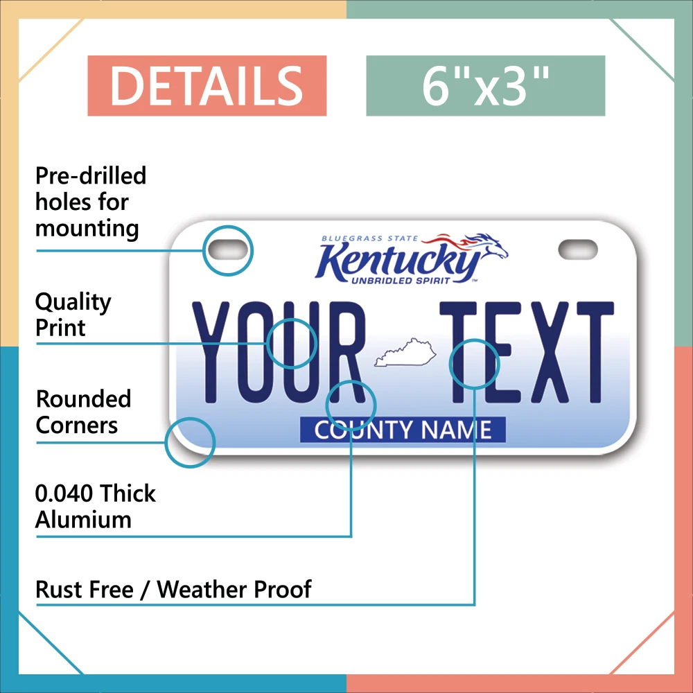 Our LICENSE plates are the most unique souvenirs from the United States, Choose between 50 states and 3 different sizes. Cannot be used in place of a state issued plate. IMPORTANT DESCRIPTION • Plates are made using High quality thick 040 rust free Aluminum. • Our plates are printed flat, not raised. The customizing is done using the latest UV Laser technique for weatherproof and high-quality finish. • 100% made in USA. • Standard car plate has four holes and can be used for trucks, motor homes, and more • M otorcycle plates have 2 holes on top for mounting and can be used on ATVS, Mopeds, Snowmobiles, wheelchairs and golf carts • B ike plates have two holes on top and can also be used for toy cars, wagons, electric toy cars, tricycles and more • Write your text in the personalization section. The text will be copied and pasted on the license plate as sent, so make sure of the spelling, punctuation, capitalization, etc. If you have any question regarding your text or you would like a preview, please let us know by adding a note or contacting Alabama | Alaska | Arizona | Arkansas | California | Colorado | Connecticut | Delaware | Florida | Georgia | Hawaii | Idaho | Illinois | Indiana | Iowa | Kansas | Kentucky | Louisiana | Maine | Maryland | Massachusetts | Michigan | Minnesota | Mississippi | Missouri | Montana | Nebraska | Nevada | New Hampshire | New Jersey | New Mexico | New York | North Carolina | North Dakota | Ohio | Oklahoma | Oregon | Pennsylvania | Puerto Rico | Rhode Island | South Carolina | South Dakota | Tennessee | Texas | Utah | Vermont | Virginia | Washington | West Virginia | Wisconsin | Wyoming
