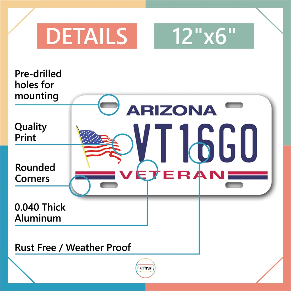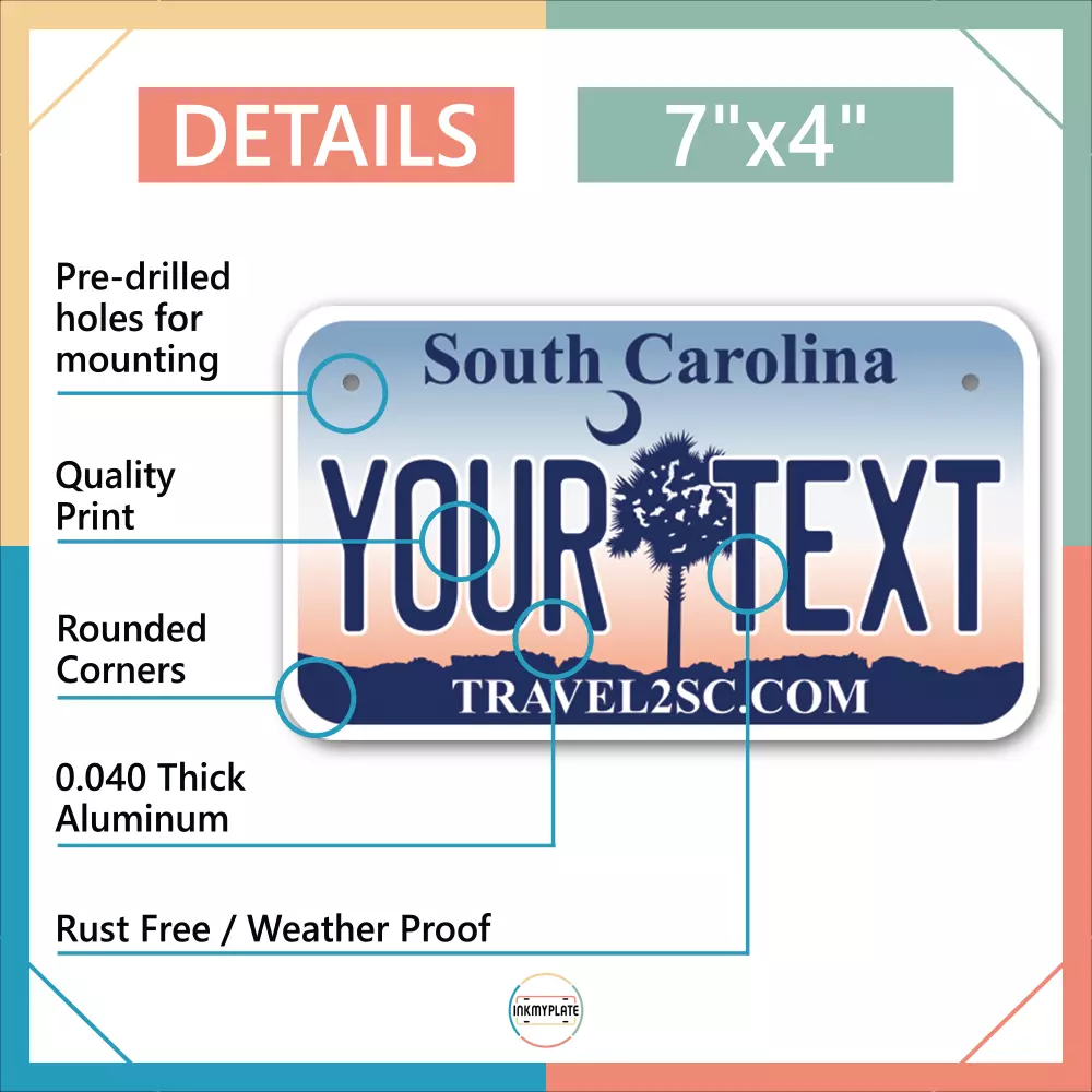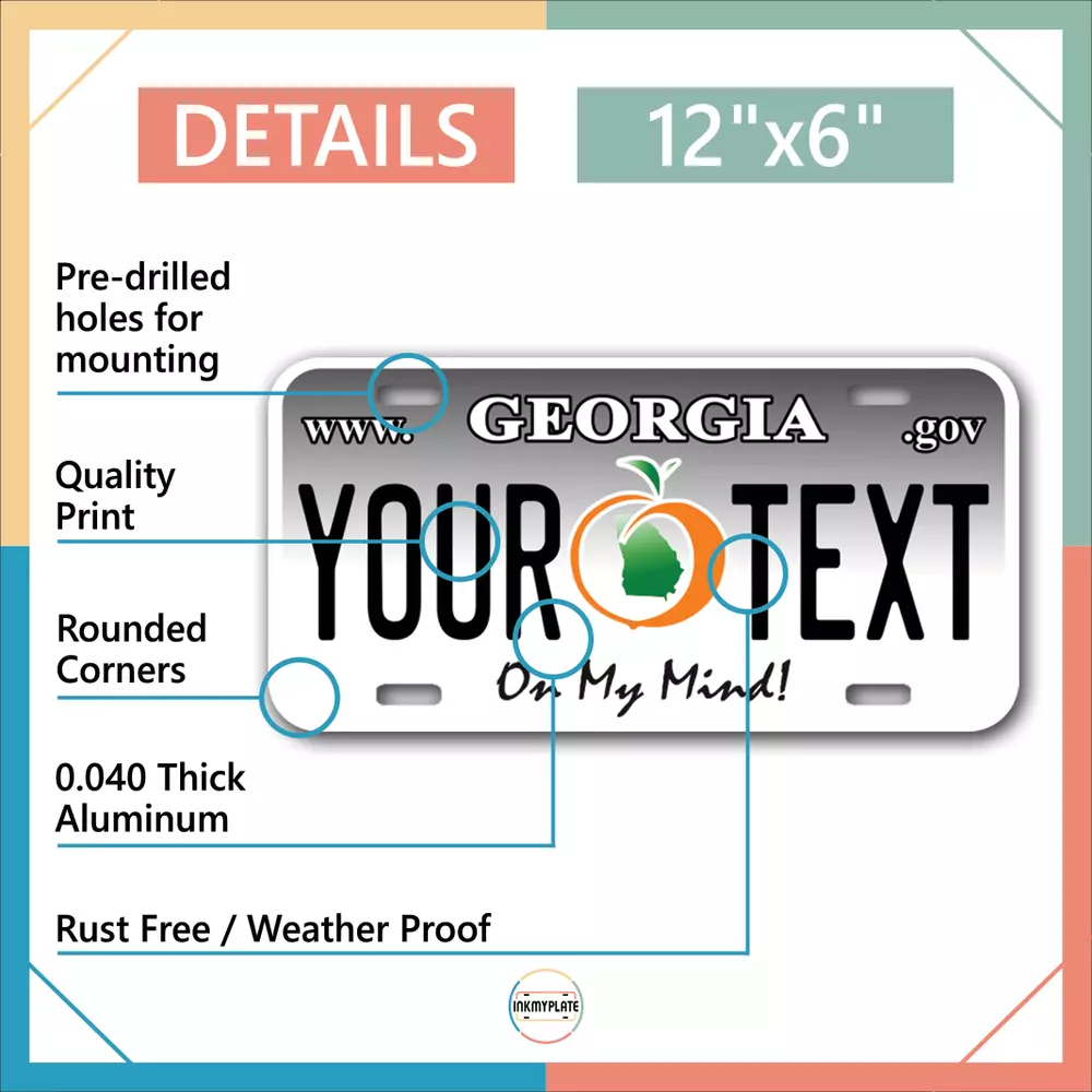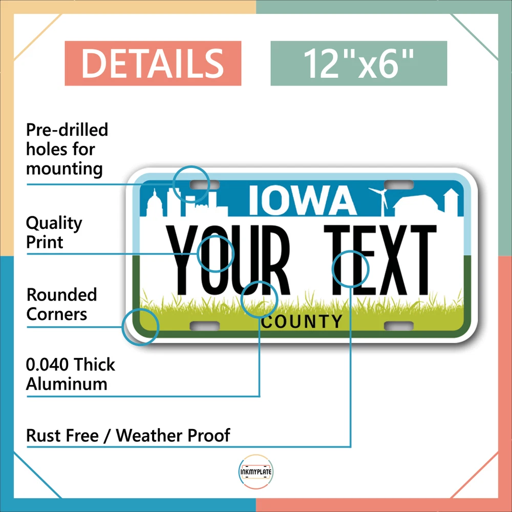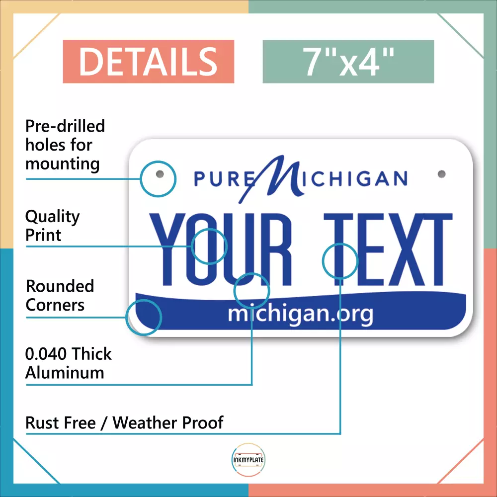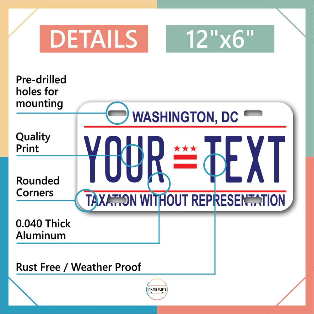 Our LICENSE plates are the most unique souvenirs from the United States, Choose between 50 states and 3 different sizes. Cannot be used in place of a state issued plate. IMPORTANT DESCRIPTION • Plates are made using High quality thick 040 rust free Aluminum. • Our plates are printed flat, not raised. The customizing is done using the latest UV Laser technique for weatherproof and high-quality finish. • 100% made in USA. • Standard car plate has four holes and can be used for trucks, motor homes, and more • M otorcycle plates have 2 holes on top for mounting and can be used on ATVS, Mopeds, Snowmobiles, wheelchairs and golf carts • B ike plates have two holes on top and can also be used for toy cars, wagons, electric toy cars, tricycles and more • Write your text in the personalization section. The text will be copied and pasted on the license plate as sent, so make sure of the spelling, punctuation, capitalization, etc. If you have any question regarding your text or you would like a preview, please let us know by adding a note or contacting Alabama | Alaska | Arizona | Arkansas | California | Colorado | Connecticut | Delaware | Florida | Georgia | Hawaii | Idaho | Illinois | Indiana | Iowa | Kansas | Kentucky | Louisiana | Maine | Maryland | Massachusetts | Michigan | Minnesota | Mississippi | Missouri | Montana | Nebraska | Nevada | New Hampshire | New Jersey | New Mexico | New York | North Carolina | North Dakota | Ohio | Oklahoma | Oregon | Pennsylvania | Puerto Rico | Rhode Island | South Carolina | South Dakota | Tennessee | Texas | Utah | Vermont | Virginia | Washington | West Virginia | Wisconsin | Wyoming