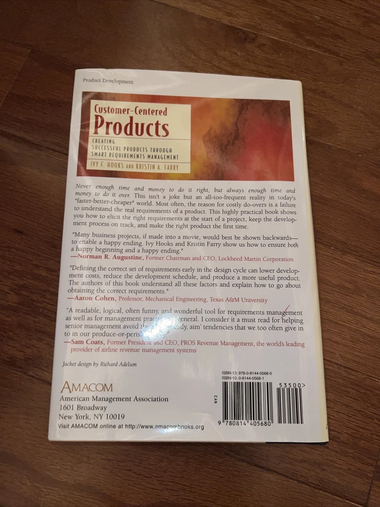 This book titled "Customer Centered Products: Creating Successful Products Through Smart Requirements Management" written by Ivy F. Hooks and Kristin A. Farry is a must-read for anyone interested in business and economics. It is published by Amacom and has 304 pages filled with valuable insights on customer relations, general management, and production & operations management. The hardcover book measures 9 inches in length, 6 inches in width, and 1.1 inches in height. It is written in English and weighs 20.8 ounces. This book is perfect for those looking to enhance their knowledge on how to create successful products that are customer-centered.