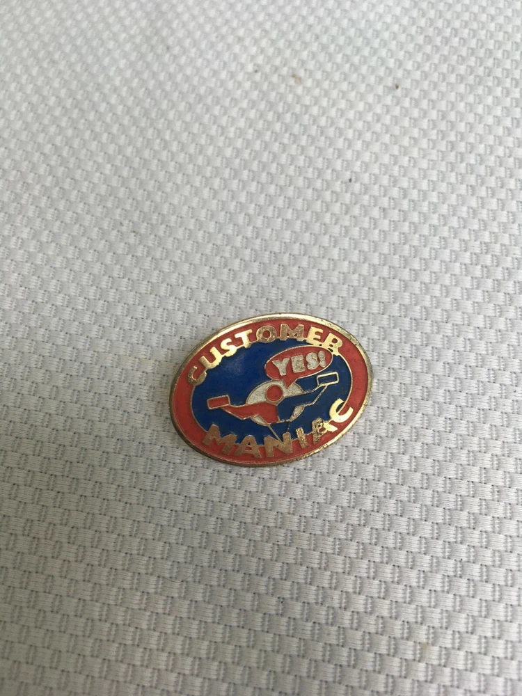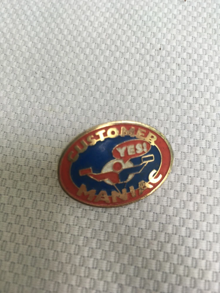 Customer Maniac Lapel Hat Pin Metal, Gold Tone, Enamel Measures about 1 Inch Good Condition Please see photos as they are included as part of the description. I do combine shipping on multiple items. Please request an invoice on multiple items before paying. Based on weight and location. A5-^^ I do offer a 60 day return policy with no cost to the buyer.