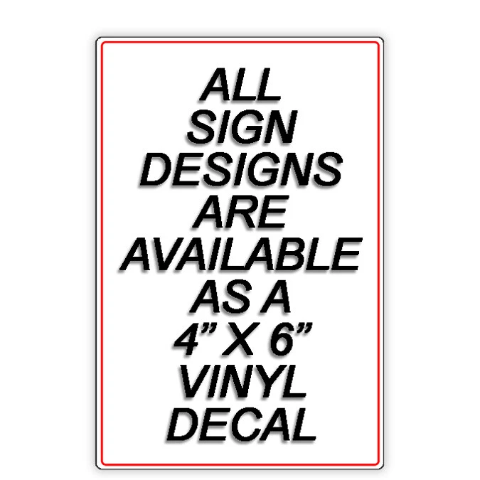 Available As A Vinyl Decal Or Aluminum Sign EVERYTHING THAT WE SELL IS PRINTED AND SHIPPED IN THE UNITED STATES SINCE 1998 Thank you for supporting a family owned business Decals are 4" X 6" Decals do not have holes Additional quantity discounts on decals are available Decals are shipped USPS First Class Mail with tracking CUSTOM DESIGN DECALS ALWAYS AVAILABLE Signs Are Available In Five Versions 5" x 7" 8" x 12" 12" x 18" Treated With Ultra UV Protection To Prevent Fading Printed directly onto the metal sign Signs do not have stickers, decals, paint or vinyl lettering Won't fade, crack, peel, chip or rust 5" x 7" (.025 thickness) Signs have square corners, two strips of mounting tape and no holes 8" x 12" (.025 thickness) Signs have rounded corners WITH 1/4" MOUNTING HOLES 8" x 12" (.025 thickness) Signs have rounded corners WITHOUT 1/4" MOUNTING HOLES - MOUNTING TAPE IS ATTACHED TO THE BACK OF THE SIGN 8" x 12" (.032 thickness) Signs have rounded corners and two 1/4" mounting holes 12" x 18" (.032 thickness) Signs have rounded corners and two 1/4" mounting holes PREMIUM QUALITY Made In The USA FAST SHIPPING 100% COMPLETE SATISFACTION GUARANTEED Your item will arrive quickly and in perfect condition. If there is anything about the transaction that doesn't meet your expectations, or if your item is damaged in shipping by the post office, please send us a message and give us the opportunity to address your concern We promise to correct all problems to your complete satisfaction as quickly and easily as possible.