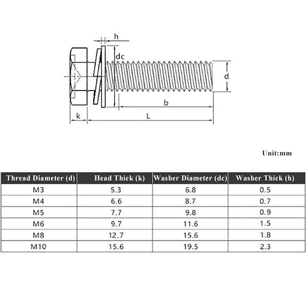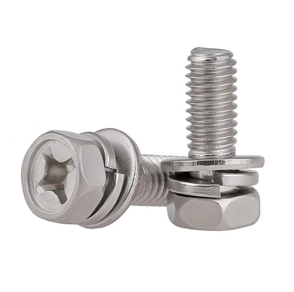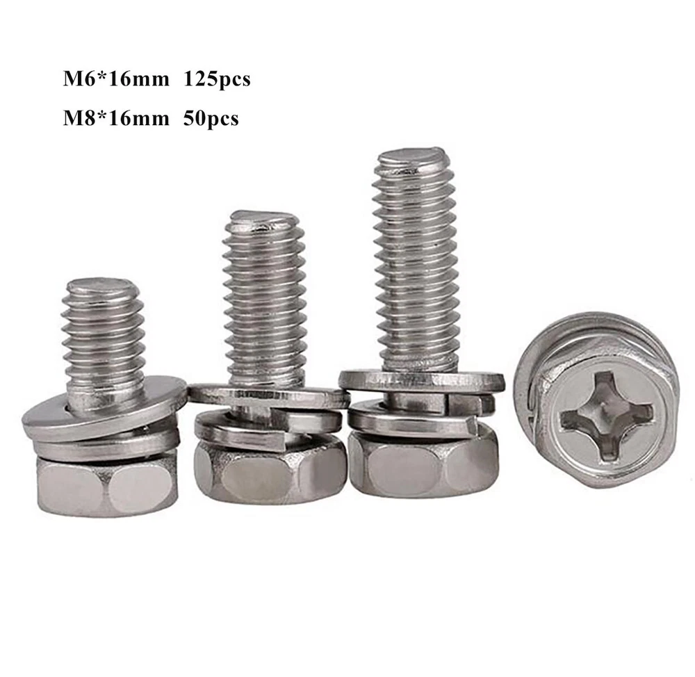 Phillips Pan Head Machine Screw + Flat Washer + Spring Washer 3pcs Kit Material: Carbon Steel Surface Treatment: Ni-Plated Pls refer to photos 1/2/5/6 Order Sizes and Quantity: M4*10mm 100pcs M4*12mm 200pcs M5*10mm 200pcs M5*12mm 100pcs Phillips Hexagon Head Screw + Flat Washer + Spring Washer 3pcs Kit Material: A2 304 Stainless Steel Pls refer to photos 3/4/7 Order Sizes and Quantity: M6*16mm 125pcs M8*16mm 50pcs