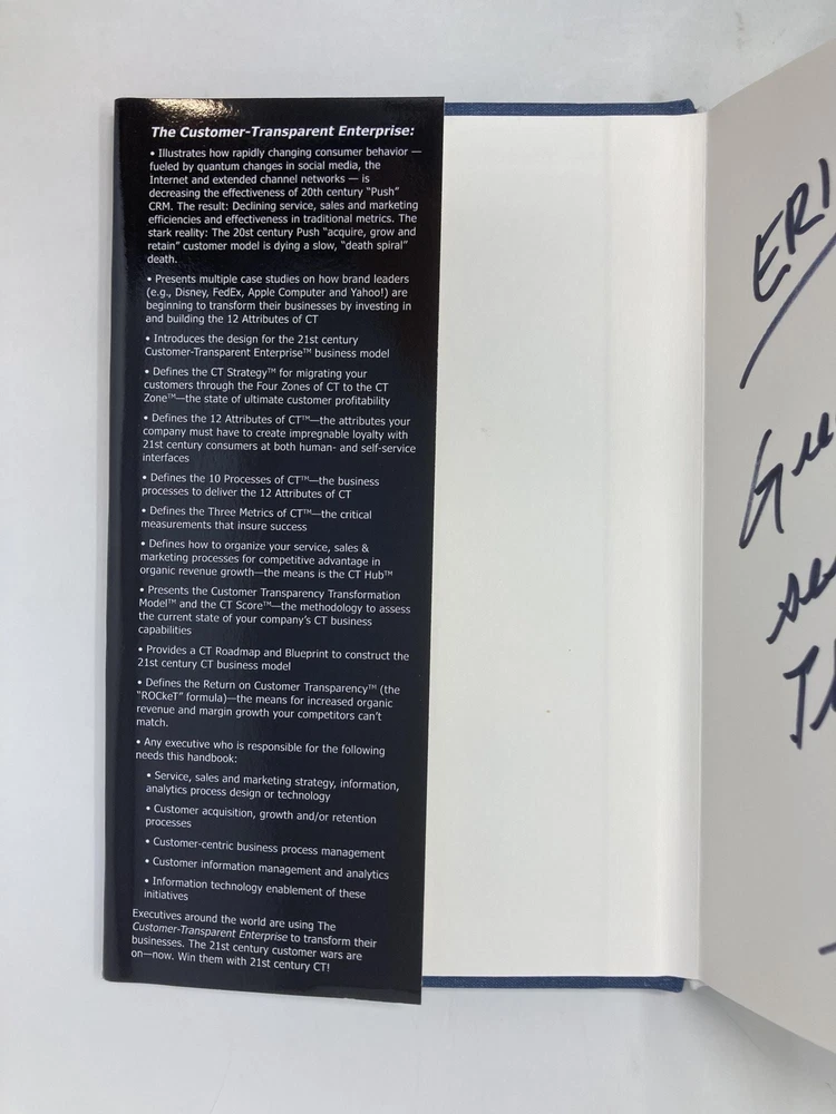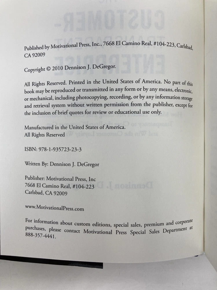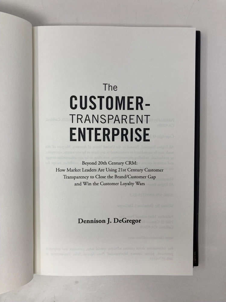 The Customer-Transparent Enterprise: Beyond 20th Century Crm: How Market Leaders Are Using 21st Century Customer Transparency to Close the Brand/Custo Author: Degregor, Dennison J. Title: The Customer-Transparent Enterprise: Beyond 20th Century Crm: How Market Leaders Are Using 21st Century Customer Transparency to Close the Brand/Custo Publication: Motivational Press LLC, November 2010 Edition: First Edition Description: First Edition, First Printing. Published by Motivational Press, 2010. Octavo. Blue boards stamped in gold. Signed and inscribed on flyleaf. Book is like new; clean with no writing or names. Sharp corners and spine straight. Binding tight and pages crisp. Dust jacket is like new with very light shelf wear. 276 pages. ISBN: 9781935723233. 100% positive feedback. 30 day money back guarantee. NEXT DAY SHIPPING! Excellent customer service. Please email with any questions or if you would like a photo. All books packed carefully and ship with free delivery confirmation/tracking. All books come with free bookmarks. Ships from Southampton, New York. Seller ID: 147692 Subject: Business We Buy Books! Collections - Libraries - Estates - Individual Titles. Message us if you have books to sell! This listing was created by Bibliopolis.