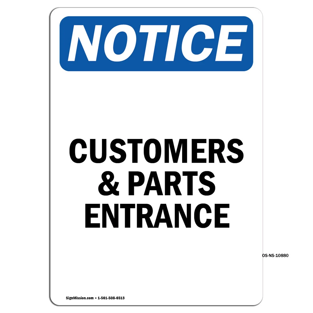 Universal 2 eBay Template by Finest Design Vinyl Banners Aluminum Signs Safety Signs Yard Signs Designer Aluminum Signs Novelty Signs Vinyl Banners Aluminum Signs Safety Signs Yard Signs Designer Aluminum Signs Novelty Signs Description Customers And Parts Entrance OSHA Notice Sign Metal Plastic Decal Make Sure You & Your Business are OSHA & ANSI Compliant. Is your business or work space 100% covered and up to code with current signage and labels? Never leave yourself exposed to lawsuits, fines, or reprimands - the integrity of your business and safety of others depends on it. Choose from Thousands of Signs. We have signs in all different shapes, sizes, and colors for almost every single business, workplace, manufacturing plant, production facility, or construction zone. Check out all our first aid signs, danger signs, keep door closed signs, electric panel hazard signs, storage signs, authorized personnel signs, lab chemicals signs and thousands more. Choose from: Aluminum, Rigid Plastic Signs or Adhesive Labels. Our signs are extremely durable yet flexible for even the most intense indoor or outdoor conditions. SignMission’s full color products are fabricated right here in the United States. Vinyl decals are equipped with super strong adhesive so that you can easily apply it to glass windows, aluminum, stainless steel, sanded wood, plexiglass and many more materials and sidings. Aluminum & rigid plastic signage materials are the perfect choice for mounting on walls, doors, fences, construction and caution areas. All of our materials surpass industry standards and will provide years of durability and longevity. 6 Month 100% Money Back Guarantee. Thousands of happy and satisfied businesses worldwide have turned to SignMission for all of their sign needs no matter what industry they’re in or what compliance needs they have. In the highly unlikely chance that you’re not 100% satisfied with your new sign or decal then simply send it back for a full refund or replacement within 6 months of the ship date. Go ahead order your Notice Sign Today!
