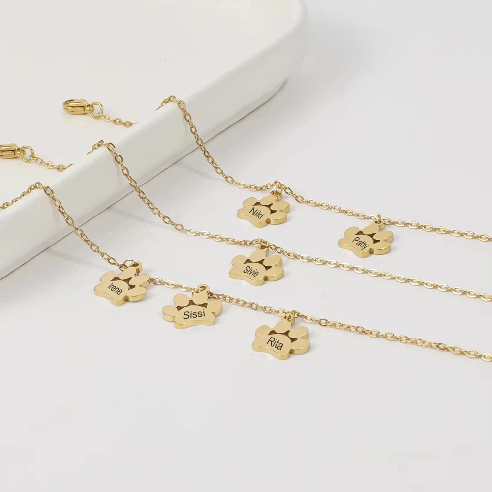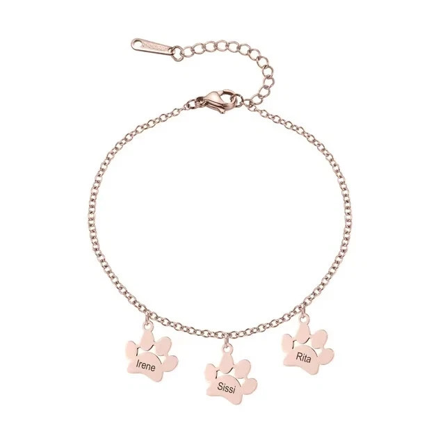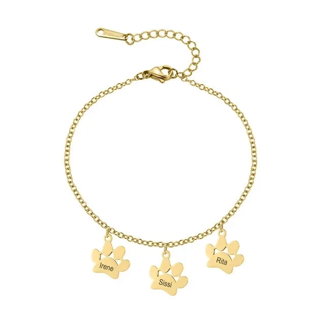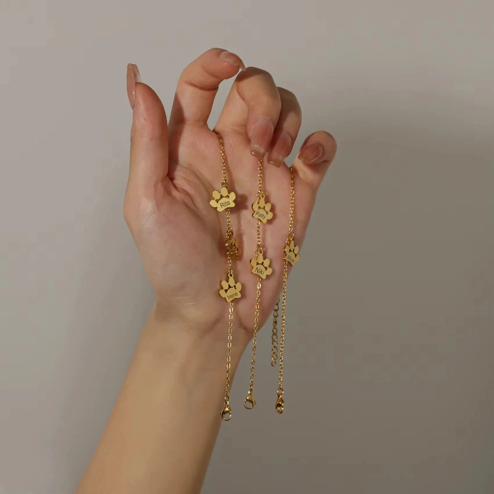 Customized 1-4 Name Paw Bracelet Jewelry Pet Gift Material: Metal Metal Type: Stainless Steel Color: Gold, Silver, Rose Gold Bracelet Type: Link Chain Chain Type: Link Chain Clasp Type: Lobster Chain Length: 5.9 in., 6.7 in., 7.5 in. Shape: Paw Font Style: 20 Font Styles Gender: Women