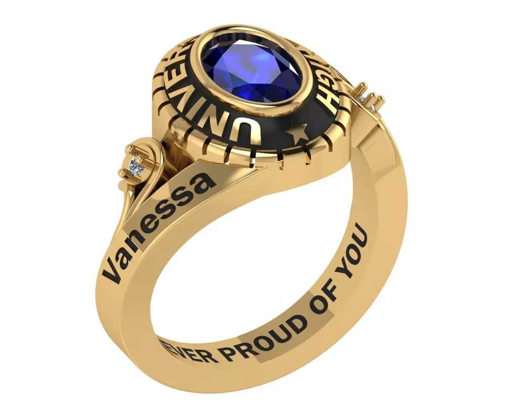 RizaJewelry Designed by RizaJewelry , this ring is made with sterling silver with your choice of platinum, gold, rose gold or gun metal plating finish , or solid 10k white gold , yellow gold or rose gold at your choice . It makes a unique graduation gift. It features multiple customized fields from your birthstone, name, year, and an engraved personal message on the inside. We have hundreds of vectors/symbols for you to choose from. You can also send us your own logo to add to the ring. From raw metals, stones, plating, we use only the best materials to make your ring, you will feel the solidness of the metal and luminous stones and attention to details when you have it in your hand. RizaJewelry, brings bold, authentic designs to your traditional high school and college class jewelry. Our team of professional jewelry designers work with technology experts to bring your dream jewelry designs to life! Commemorate and celebrate your graduation with this exclusively designed class ring! It is 100% custom-made for you to carry on your memories of high school and college through the rest of your life! ๐Ÿ ๐จ๐ง ๐Ÿ ๐ƒ๐ž๐ฌ๐ข๐ ๐ง ๐‘๐ž๐ฏ๐ข๐ž๐ฐ/ ๐Ÿ‘๐ƒ ๐Œ๐จ๐๐ž๐ฅ ๐๐ซ๐ž๐ฏ๐ข๐ž๐ฐ We will send rendering of the 3D model (finished look of the ring) for your approval shortly after the order is placed. A designer will be assigned to you to offer advise on designs & help you make changes. This service is only available from RizaJewelry . ๐“๐ฎ๐ซ๐ž ๐‚๐ฎ๐ฌ๐ญ๐จ๐ฆ๐ข๐ณ๐š๐ญ๐ข๐จ๐ง Other than the hundreds of logos/vectors we offer, you can send us your own logo /clip art to add to the ring. Please message us through Etsy Messages to send a picture of your own logo /clip art. This service is only RizaJewelry . ๐…๐ฎ๐ฅ๐ฅ ๐‚๐ฎ๐ฌ๐ญ๐จ๐ฆ๐ž๐ซ ๐’๐ฎ๐ฉ๐ฉ๐จ๐ซ๐ญ Please contact us through eBay Messages if you find anything wrong with your ring or simple reply to the message where we sent you the 3D. We take full responsibility for any initial defect. ๐’๐จ๐ฅ๐ข๐ ๐๐ฎ๐š๐ฅ๐ข๐ญ๐ฒ Quality is our top priority. The rings have substantial silver / gold weights. You will feel the value of the ring not only from the metal, but also the best quality stones, lustrous plating and precise letters/vectors. A great keepsake for years to come! ๐†๐ข๐Ÿ๐ญ ๐–๐ซ๐š๐ฉ Each ring comes with a nice ring box, a jewelry care kit, a golden ribbon, and a gift bag that fit the graduation theme. ๐…๐š๐ฌ๐ญ ๐ƒ๐ž๐ฅ๐ข๐ฏ๐ž๐ซ๐ฒ We usually ship earlier than the promised date. We suggest you to order earlier than later. ๐…๐ฎ๐ฅ๐ฅ๐ฒ ๐๐ž๐ซ๐ฌ๐จ๐ง๐š๐ฅ๐ข๐ณ๐ž๐ From metal types, birthstone colors, plating finishes, and vectors, free text composing, we offer a wide range of choices for your fully custom made ring. ๐‚๐จ๐ฉ๐ฒ๐ซ๐ข๐ ๐ก๐ญ๐ž๐ ๐ƒ๐ž๐ฌ๐ข๐ ๐ง๐ฌ Each style is created by RizaJewelry and are only available from Jour RizaJewelry stores. We prohibit any counterfeits and intellectual property infringement with legal measures.