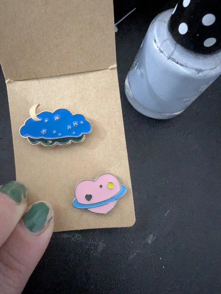 A cute clouds with moons, star, and hearts enamel pin set. Perfect for any teens, fan of space, or just like bright cute colors. This set comes with 2 pins and the nail polish is in the one picture for size reference. These are smaller pins perfect for a small decor addition to any bag, shirt, or lapel without being bulky or distracting.