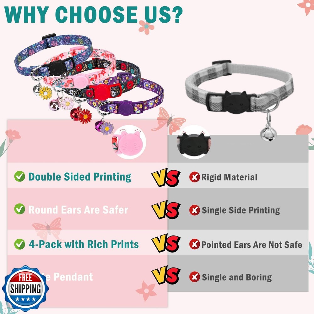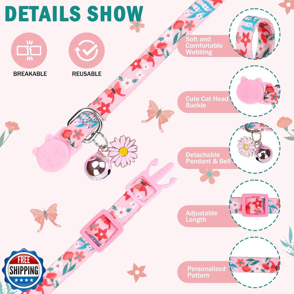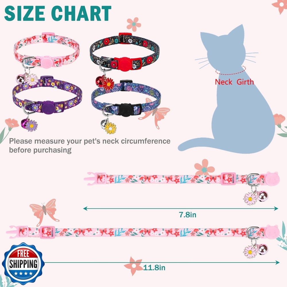SCENEREAL Cute Cat Collars with Bells Breakaway, 4 Pack Floral Daisy Pendant Spring Summer Pet Collar for Girl Boy Cats, Adjustable Safety Pink Kitten Puppy Collars Flowers Set Size 8-12" Features 4 PIECES SET BREAKAWAY CAT COLLARS : This kitten collar includes 4 different colors cat collars (black, blue, pink, purple) with floral prints, suitable for any season, especially for spring and summer. REMOVABLE BELL AND CHARM: The breakaway cat collar comes with a removable bell and charm to add elegance and cuteness to your pet. In addition, the bell can help you identify your cat's location more easily and keep them safe! SAFETY DESIGN: Our customized cat collars are equipped with a safety breakaway buckle, which will automatically release when the collar is under certain pressure to prevent strangulation, ensuring your pet's safety when out and about. ADJUSTABLE SIZE: The personalized cat collar has an adjustable range of 7.8"-11.8" and a width of 3/8". Simple design and adjustable size fits most size and breed of cats. COMFORTABLE AND DURABLE: These cute cat collars are made of high quality fabric and delicate handcrafted to ensure durability and comfort. In addition, you can easily hand wash and tumble dry at low temperature to keep your pet cat collar always fresh. The cute design will be a holiday gift for your boy cat girl cat finger), also suitable for all kinds of parties, festivals, weddings and other occasions. Shipping Free & Fast Shipping: We offer free shipping to most of the USA with a normal delivery time of 3-7 days. However, due to the current situation, additional delivery time (up to 3 weeks) may be required for some items. Alternative Carriers: We may use alternative carriers (e.g., USPS, FedEx, UPS) to ensure your package arrives safely and on time. Due to the use of multiple carriers, we are unable to provide a tracking number automatically. Handling Time: Orders are processed and shipped within 1-2 business days of receiving cleared payment. Shipping Restrictions: Shipping to Alaska, Hawaii, Puerto Rico, Guam, and other US territories may incur shipping charges or delivery restrictions. Please contact us before ordering, or your order can be refunded/cancelled. State Restrictions: Certain items may not be shipped to California due to state regulations. Contact for Tracking Updates: If you require tracking updates or have any concerns about the delivery of your order, please feel free to contact us, and we will be happy to assist you. Return Policy 30-Day Hassle-Free Returns: If you are not completely satisfied with your purchase, you can return the item for free within 30 days of receiving it for a full refund or exchange. Easy Return Process: Contact us, and we will provide you with a prepaid return shipping label and detailed instructions. No Restocking Fee: There are no restocking fees for returns. However, the buyer is responsible for return shipping costs if the return is not due to a seller"s error. Refund Processing: Refunds will be processed within 1 business day of receiving the returned item in its original condition. Feedback Your feedback is extremely important to us. We strive to provide the best products and customer service possible. If you are satisfied with your purchase, please take a moment to leave us a positive review. If you have any concerns or issues with your order, please contact us before leaving negative feedback. We are committed to resolving any problems and ensuring your satisfaction. Contact Us If you have any questions or concerns, please feel free to reach out to our customer support team. You can contact us through the eBay messaging system. We are available Monday to Friday, 9:00 am to 5:00 pm EST, and we will do our best to respond to your inquiry within 24 hours. Thank you for supporting our small family business!