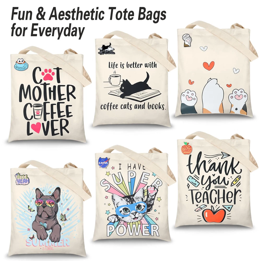 Description Specification: Material: Unbleached Canvas Cotton Size:40 x 36cm/15 x 14 inch Package Include: 1 x Canvas Tote Bag and 1 x Brooch Pin Cute Enamel Brooch Pins: Each canvas bag has a Corresponding theme Unique Design enamel pin Unbleached Canvas: Canvas tote bags are made of Heavy Duty 100% cotton canvas material, durable and practical, natural unbleached color, no toxic and safe, reuse is more convenient Multiple Structure Design: Tote bag with the main pocket to storage your cosmetic, other daily supplies, three inner small pocket to store your phone, keys, wallet so on the valuable item meet of your different needs Canvas Tote Bags Dimension: 40 cm/15 inch x 36 cm/14 inch (L x W), with handle - 60 cm/24 inch; Total length of 24" handles are long enough to carry this bag on your shoulder, capacity is very large Perfect Gift Ideas: Canvas bag with colorful printing design, easy to match with daily clothes, it is great to present for your daughter、Friend、Coworker、Mother、Sister、Mother-in-Law、Aunt valentine day、birthday、Mother's Day、Friendship Please hand wash and air dry if you need to wash it