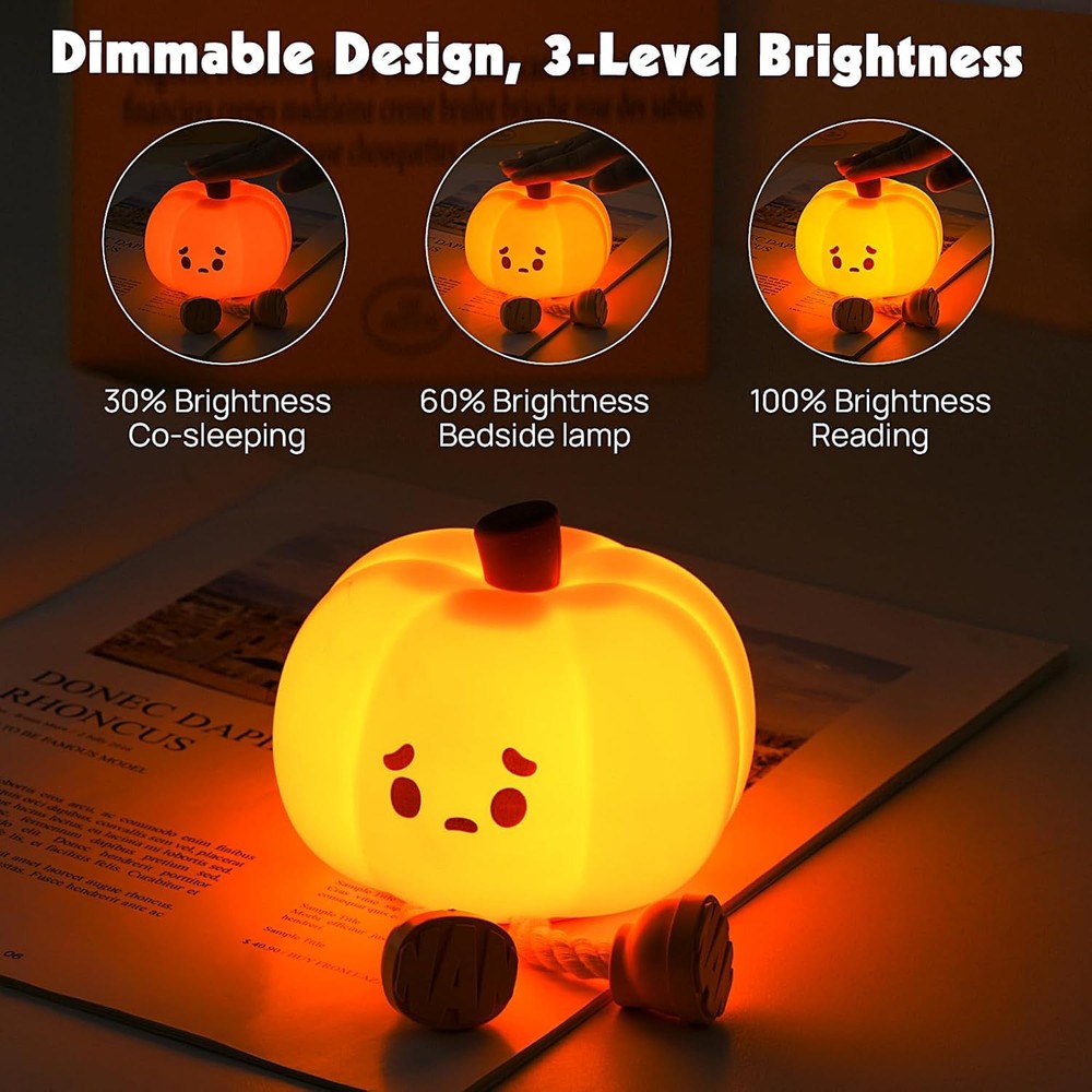 LED Unique Pumpkin Lantern Night Light Design is a charming and whimsical accessory is a rechargeable light that is a fun and interesting design, Kawaii table light Shaped like Pumpkin features and made of high-quality food-grade soft, BPA-free silicone, water-resistance & drop-resistance,USB fast charging cable,The soft, warm light emitted by the Pumpkin night light creates a cozy atmosphere, making it perfect for a bedside table or as a decorative piece in a child's room. Silicone Material: Light up pumpkin material is squishy and gives off a nice soft glow with 3 brightness settings that can be assed by tapping the pumpkin tummy and a 30 minute auto shut off feature, The battery lasts over a week. A tap turns it off, cute lights for bedroom offers perfect light to see. and his feet hold your while it charges overnight. Cool night lights for adults thing is too dang cute! it makes you smile. Cute pumpkin night kawaii light duck night light children is not only portable and wireless,but also this baby night lamp is nursery night light for breastfeeding so cute and practical children's night lights and night light. Which with built-in 1200 Ah battery, companion sleeping light and rechargeable bedside lamp baby room ensure protect your eyes. The pumpkin night light is not only as a camping light, flashlight and emergency light, but also reading, breastfeeding, and preventing falls during the night, Best for your children, friends or yourself. Also a ideal for Birthday, New Years, Christmas Halloween,children's day,Valentine's day,Babyshower day, home office and Day, party decoration, Housewarming,Wedding ,send Nephews and Nieces, Baby,partner,boy-friend ,girl friend,husband,wife roommate. that is cool things for your house.