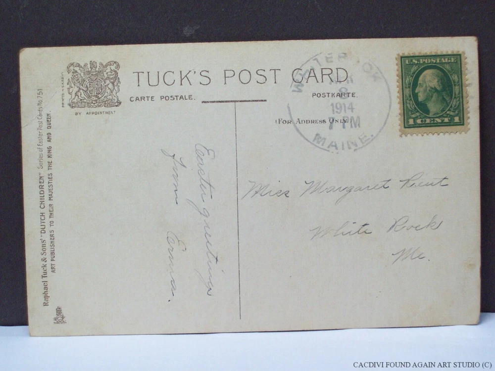 Cute Dutch Girl Easter Postcard Bunny Rabbit Eating Tulips Red Flowers Chick Old Please check the pictures to examine the detail, checking the pictures and item description for condition. If you like pins, jewelry, postcards, patches, matches, please check my other listings. Click here for more listings! DESCRIPTION: This Easter Card features a representation of view of a Dutch landscape with windmills and sailboat. In the foreground there is a young girl. She is afraid of the bunny rabbit hiding behind the pot of red tulips. In the top left corner there is a little yellow chick. MESSAGE: General CAPTION: May Your Easter Be Joyful PUBLISHER: Ralph Tuck and Sons Dutch Children No 751 STAMP: One cent Washington CANCEL: 1914 Whiterock Maine CONDITION & TERMS By bidding / purchasing buyers understand & accept that: items are represented to the best of my ability, are used or aged, and may contain unseen faults the buyer will take full responsibility for. If items can be combined, please wait and make one combined payment. All items are as found and I do not sell reproductions. Due to age, history, there is surface wear. This item is preowned, not new, and contains imperfections. Due to variations between computers, color may vary. The corners are lightly bumped with creases. This postcard is an almond color from age with spots. Take note of the size listed in the description since prospective may be difficult to judge. Please contact me prior to bidding to clarify any questions or concerns. See my other listings for more great items! SHIPPING Free shipping when you choose USPS First Class Package when shipped within the USA. Delivery time is a estimate that does not consider weather delays, holidays, or unexpected events. Note to Florida Residents State Sales Tax will be added to purchases, for other states eBay collects the sales tax and remits it. International purchasers it is your responsibility to be aware of any import or customs fees your country may apply to your incoming packages. I will not falsify information on the customs forms. International purchasers will make payment by Paypal only. The International Shipping I offer is First Class Package International or Priority Mail International. Please click on to the shipping and payment tab to use the international postage calculator. An additional charge will be added to the postage rate if you would like your item to be shipped Registered Mail. If you have any questions please contact me early before the listing nears its end. Click onto the Contact link below. Other Items Contact Thank you for looking! inkfrog terapeak