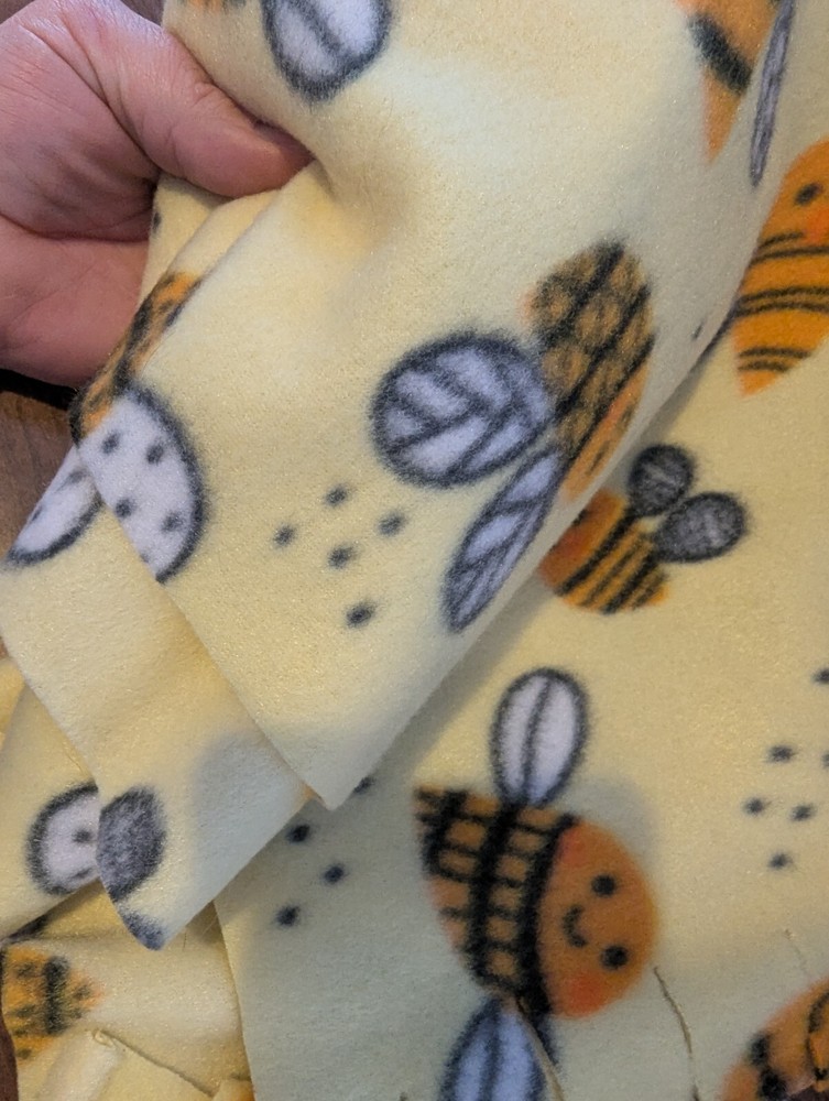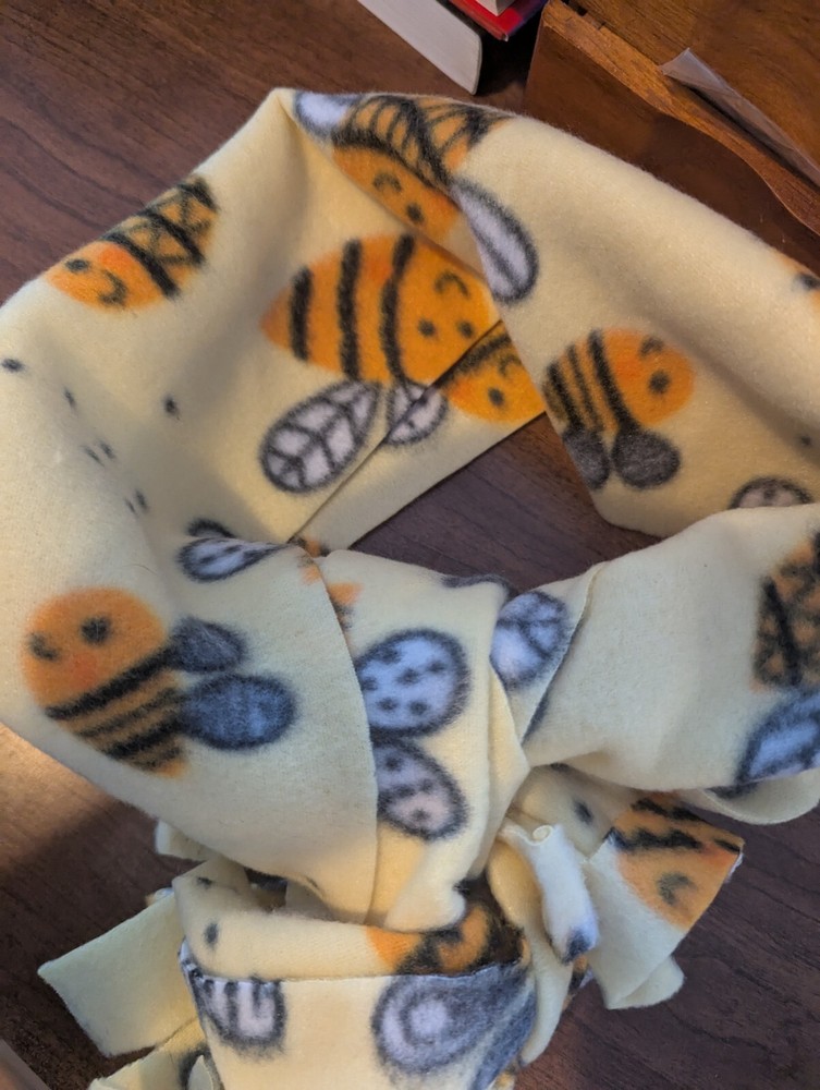 A thick winter scarf, fleece material made from a cotton and polyester blend. Features cute bee pattern on the scarf. This scarf is handmade and has never been worn, it's new. Has cute fringe at ends of the scarf. I tried to show it all in pictures, it's a bit longer so can be wrapped twice.