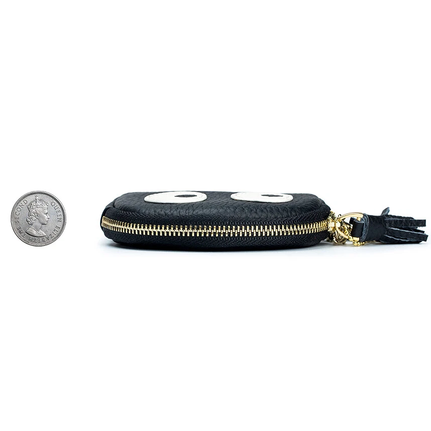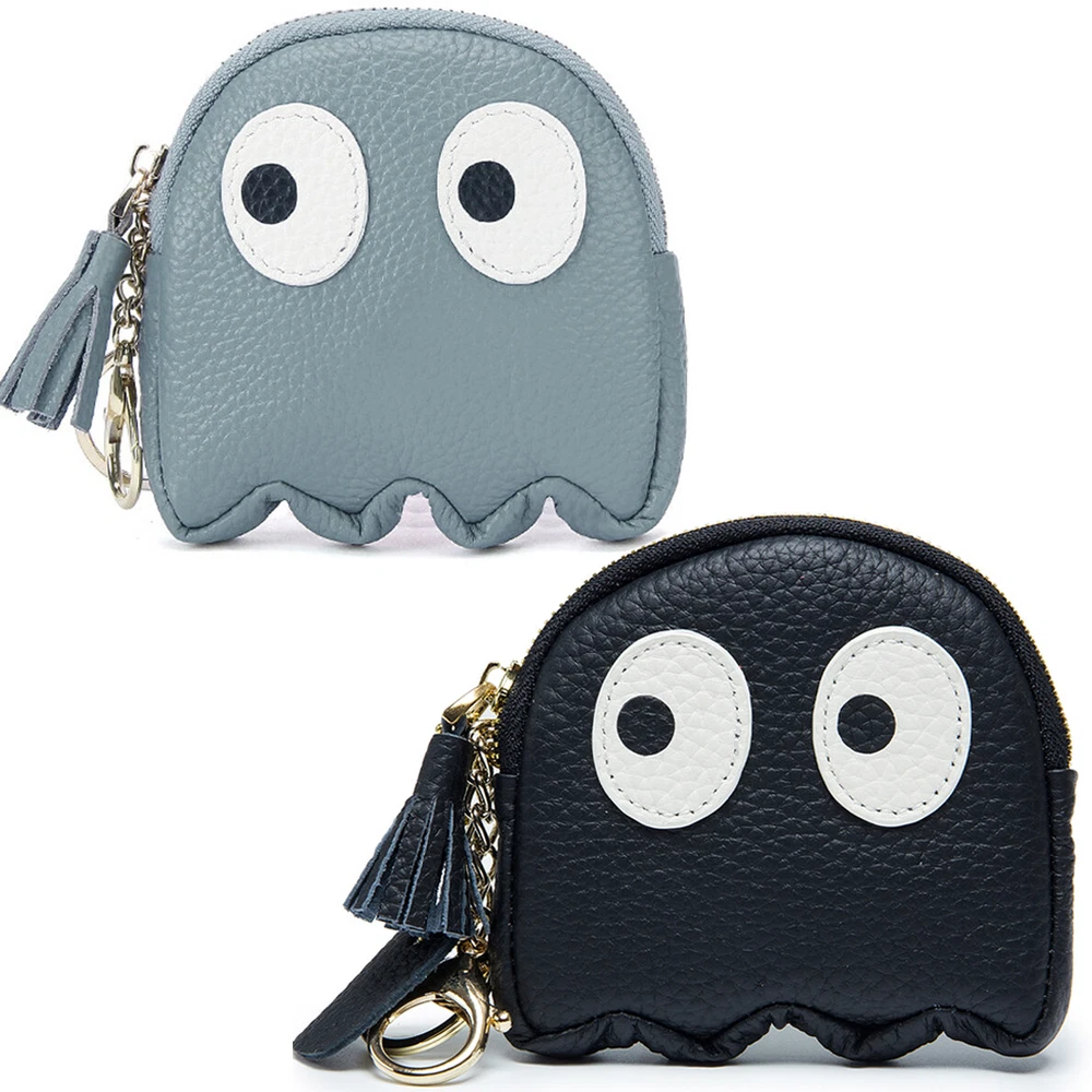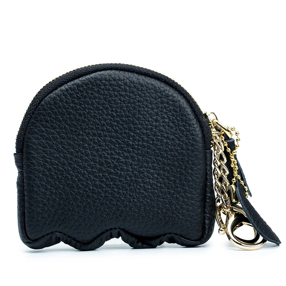 Reliable Quality: Top cowhide genuine leather soft to touch and easy to clean up, purely handmade. Professional Design: Small size 10*10*1.5cm and the weight is about 64g. Deft Design: 1 main pocket, 1 card slot,2 key chains, you can arrange credit card, driver's license, bank card, cash, change, lipstick, keys, etc. Attractive Design: Lovely cartoon ghost shape design. Reliable Reputation: If you are not satisfied with our product or service for any reason, please contact us, we will resolve it.
