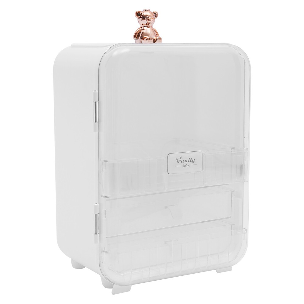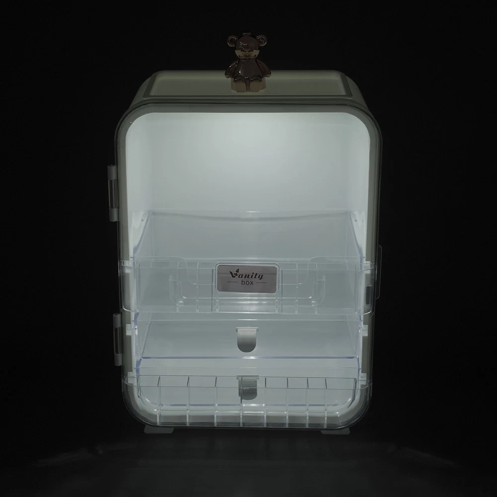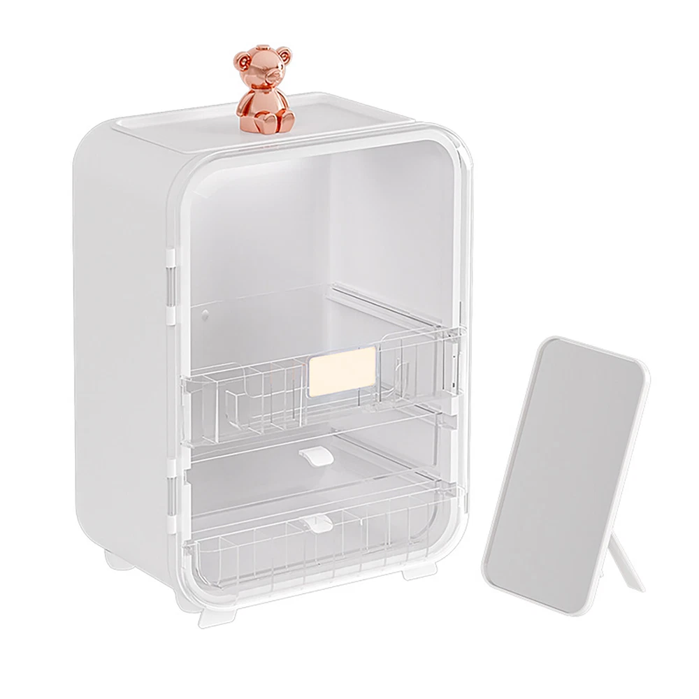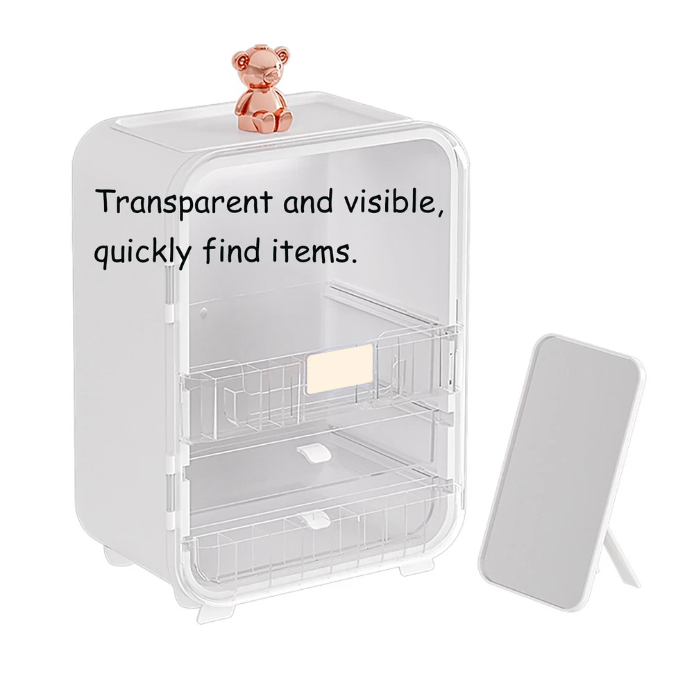 This makeup organizer is a game-changer! The cute bear design and built-in mirror make it stylish and functional. It holds so much without cluttering my space—lipsticks, palettes, even skincare bottles fit perfectly. The LED light is a nice touch for morning routines, and the sturdy build keeps everything secure. My vanity looks so tidy now—love it!