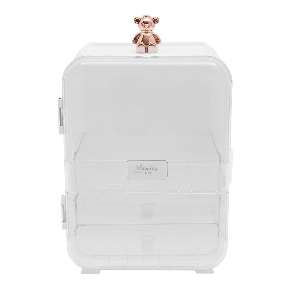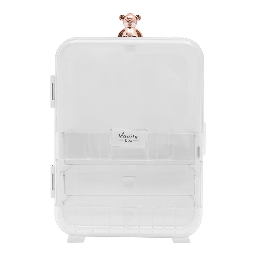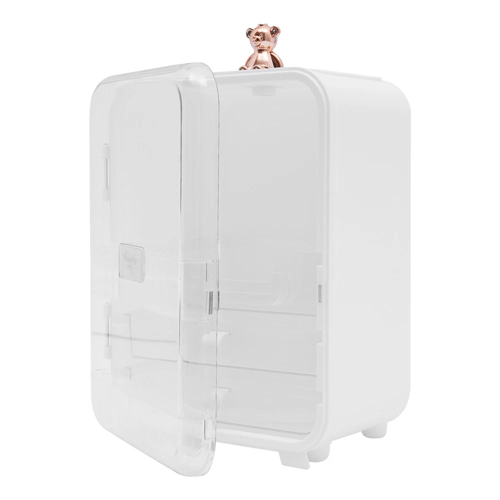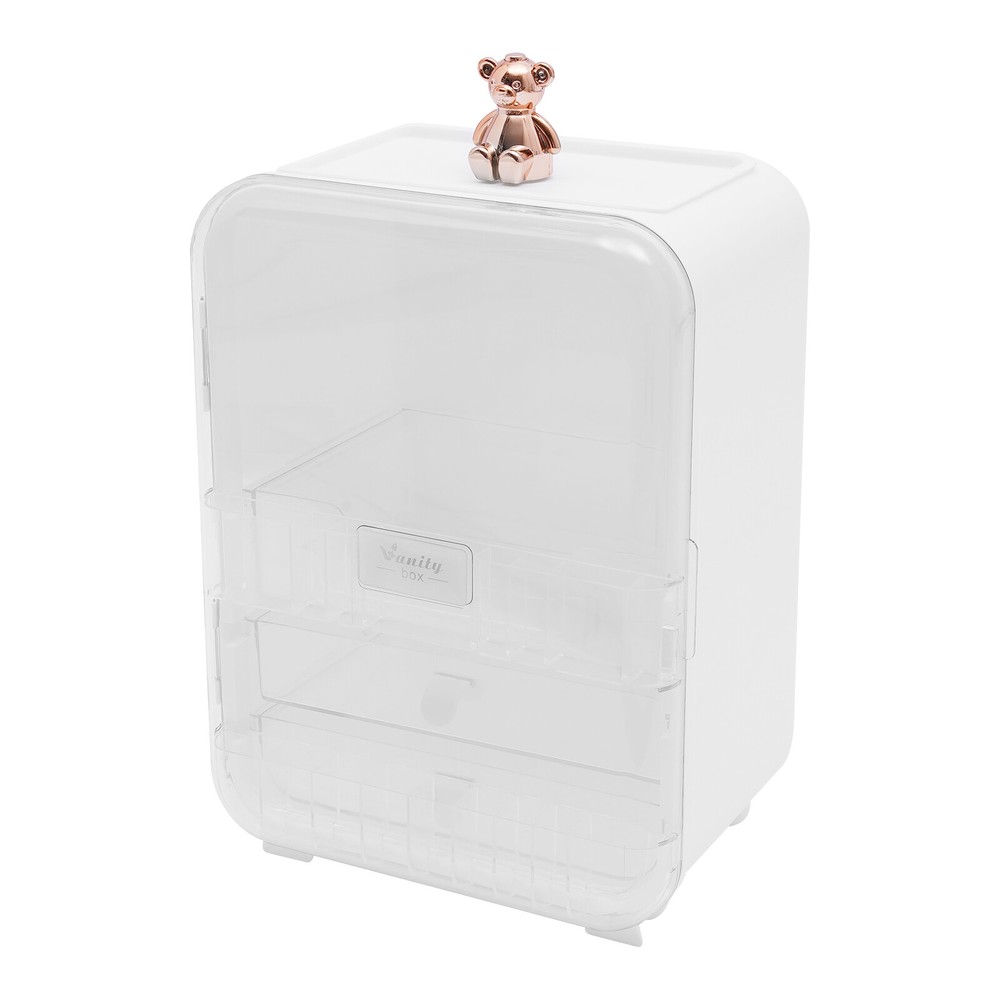 This makeup organizer is a game-changer! The cute bear design and built-in mirror make it stylish and functional. It holds so much without cluttering my space—lipsticks, palettes, even skincare bottles fit perfectly. The LED light is a nice touch for morning routines, and the sturdy build keeps everything secure. My vanity looks so tidy now—love it!