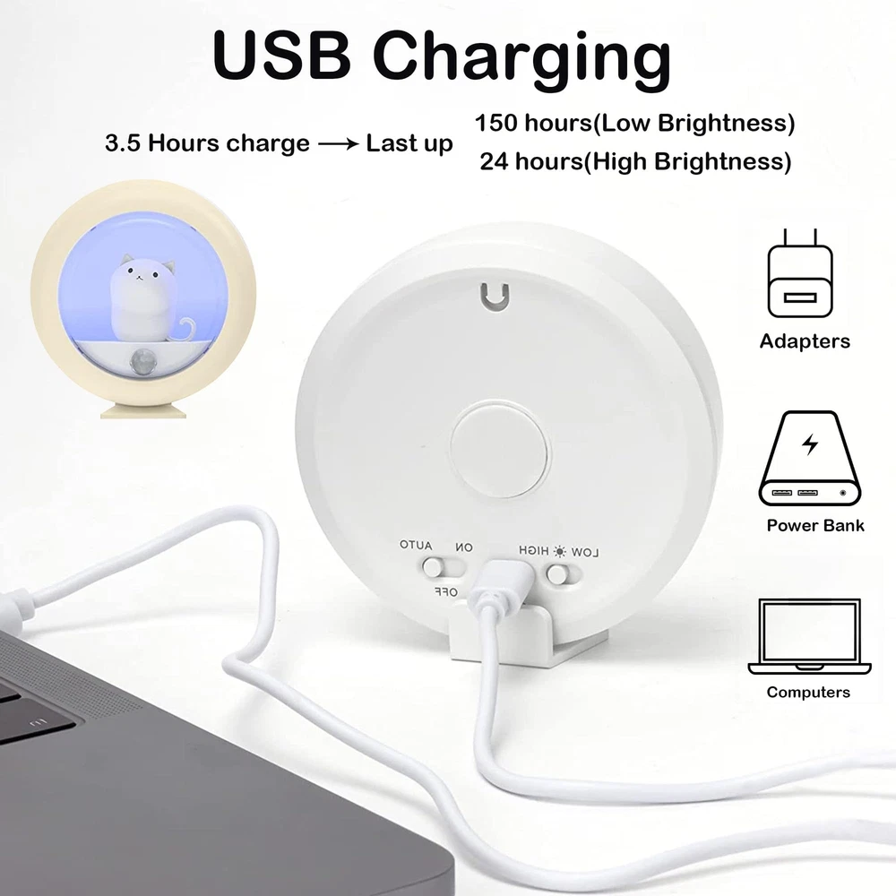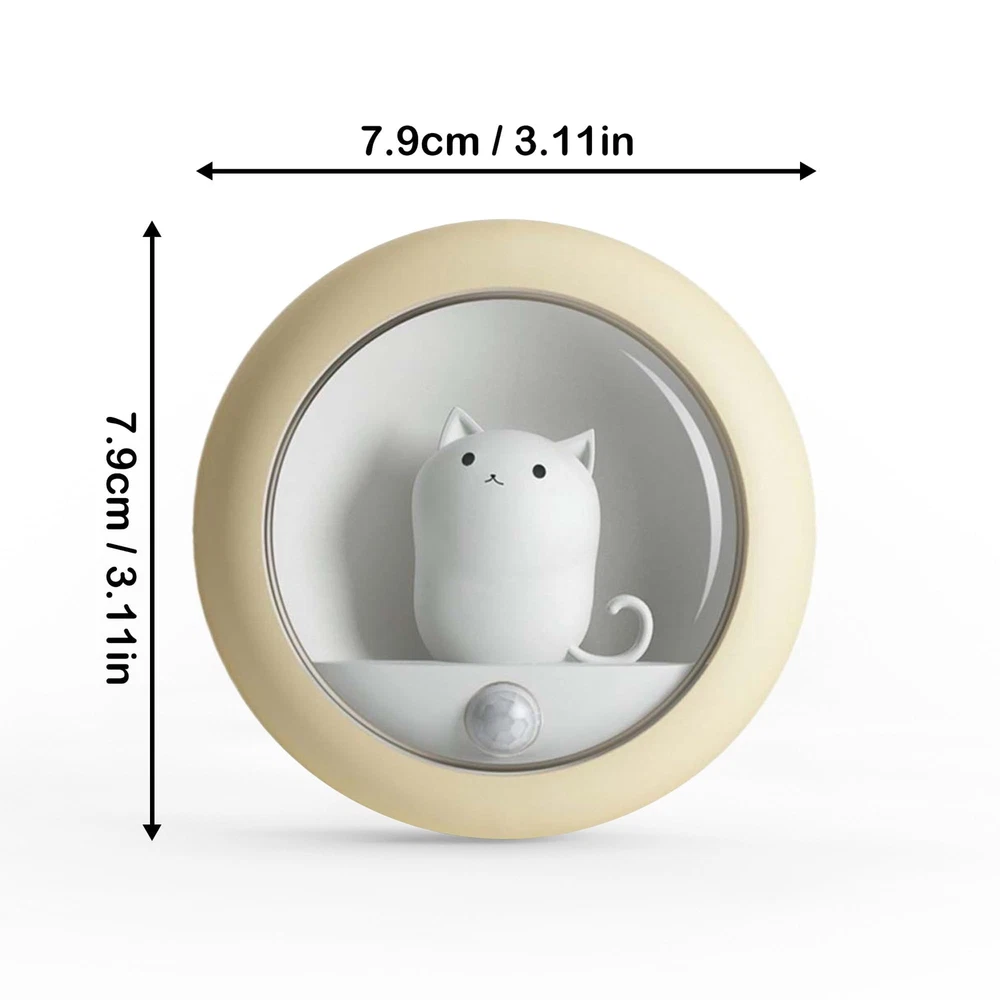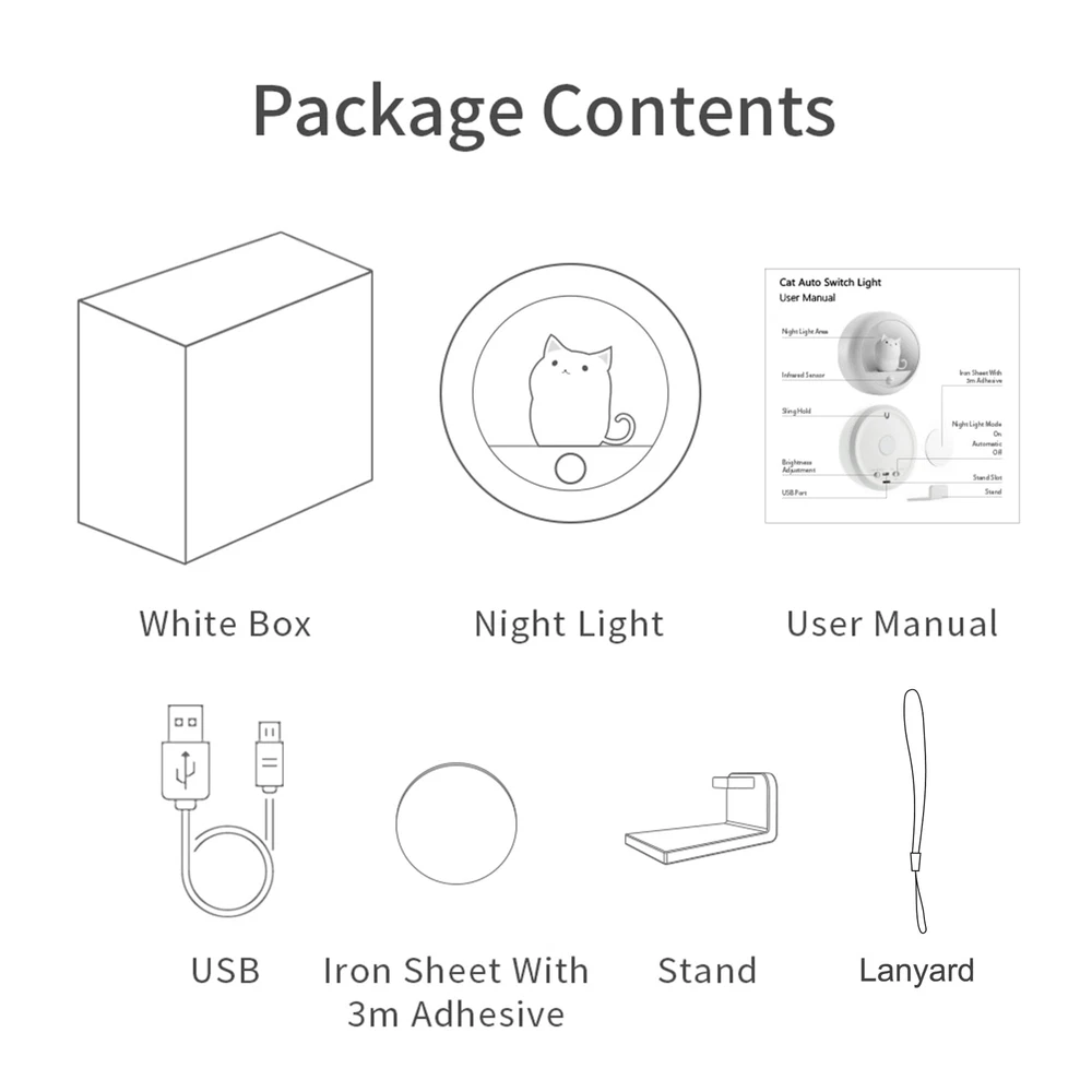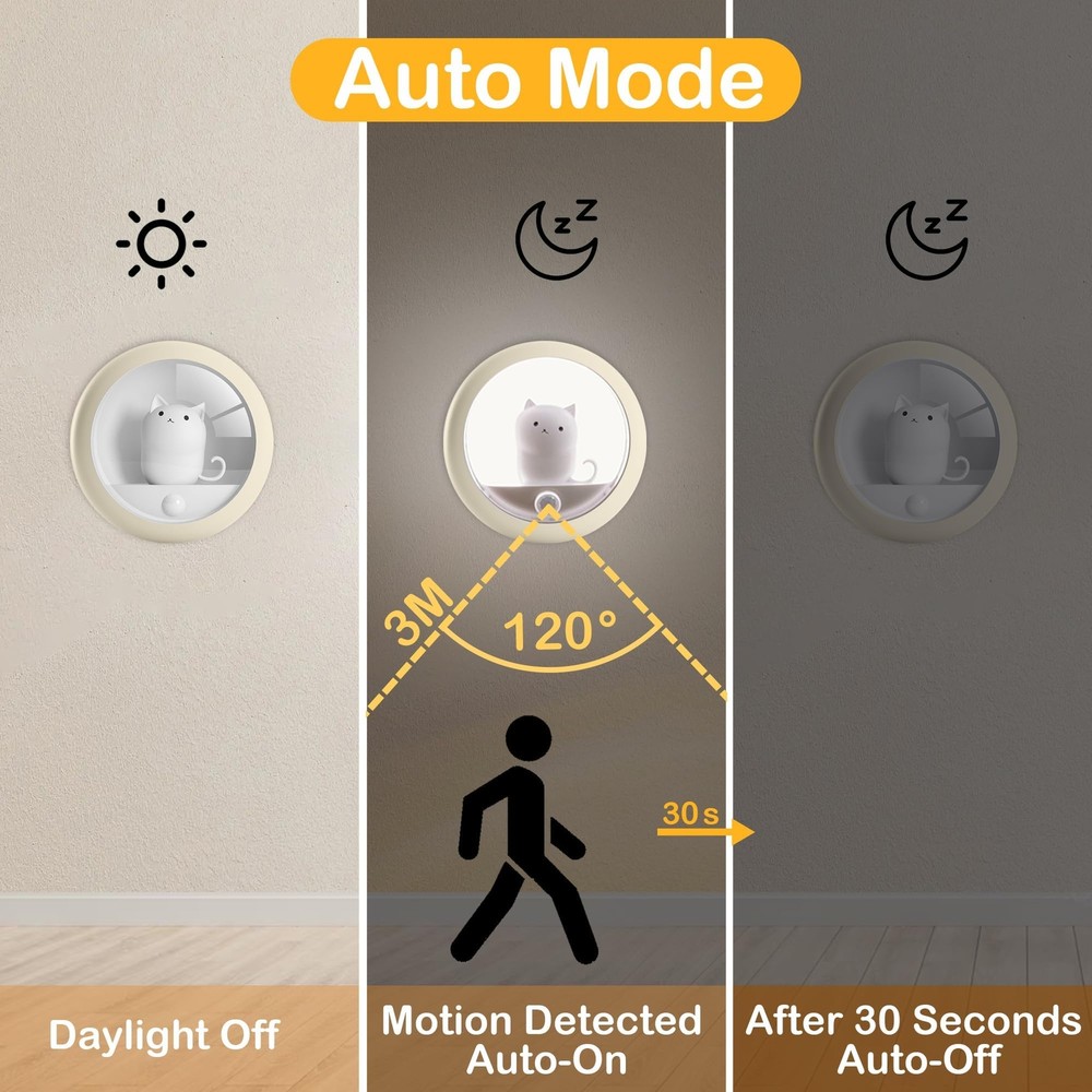 【Motion Detection】A sensor night light should have built-in sensitive motion infrared sensor capabilities to automatically turn on when it detects movement within 3 meters and within a 120° fan area. It will automatically turn off after 30 seconds (±5s) if no motion is detected.This ensures that the light only activates when someone is nearby, saving energy and enhancing security 【3 Modes & 2 Brightness】A sensor night light should offer three lighting mode: motion-activated mode/ continuous illumination mode/ Off Mode.You should have the option to set the brightness level according to their preference.HIGH brightness is natural white light, and LOW brightness is 20% 【Rechargeable Battery】This motion-activated night light charges by micro USB. Connet laptop or power bank to charge when lamp dies.A 3.5-hour charge can last up 150 hours in low brightness or 24 hours in high brightness. ( 600mAh ). Energy efficiency is crucial for a sensor night light to minimize power consumption and prolong battery life. No worries about buying and changing non-recyclable batteries frequently 【Mounting & Application】The night light has multiple mounting options .1) Magnetic Back( 3M double-sided adhesive pad and built-in magnet); 2) Hanging(inlcueded 1pc of lanyard hanging); 3) Table standing(included a stand); 4)Hold in hand. You could place it anywhere you like, such as living room, office, kitchen, hallway, attic, stairs, closet, wardrobe, etc...The rechargeable and portable design allows you to use it outdoors 【Cute Cat Design& After-Sales Service】The super cute kitten image can be used to decorate your room. And it can also be used as the best creative gift for family, friends, parents, birthdays, and Christmas. Please feel free to contact us if you have any problems about the Cat Motion Sensor. We will provide you with satisfactory after-sale service. We also provide 180 days replacement OR risk-free refund