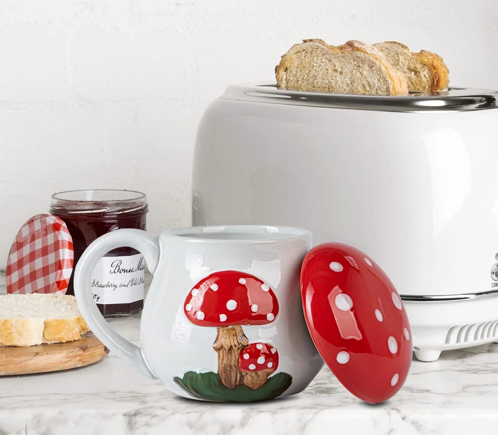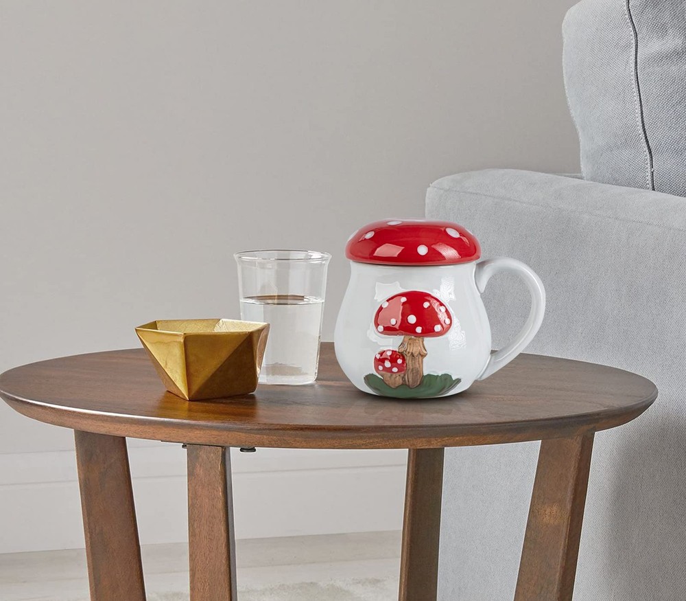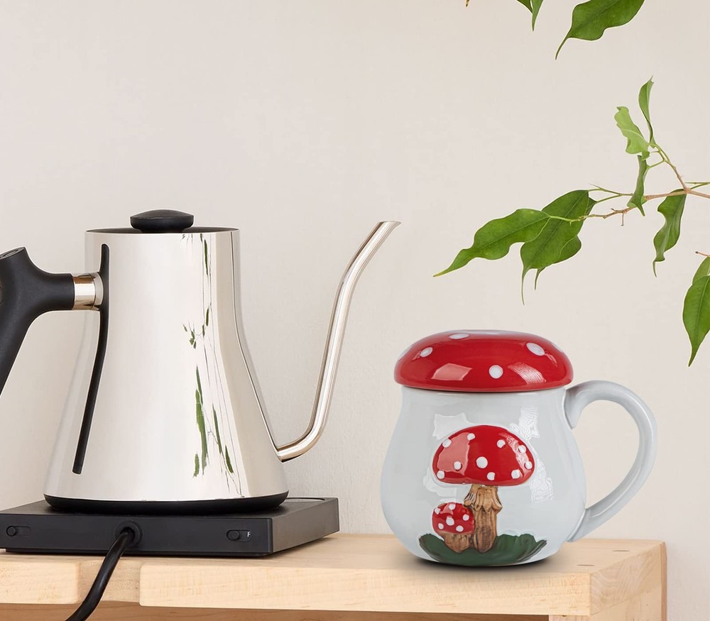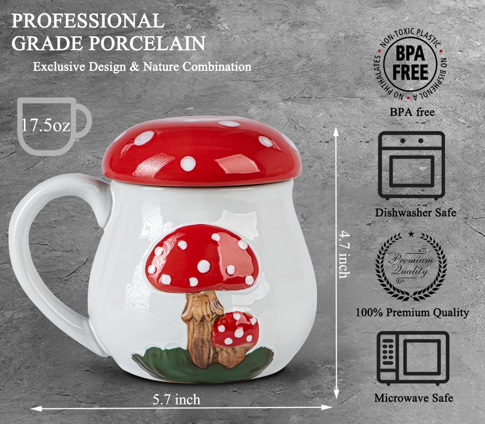 mushroom mug cup with lid 【Humanize Design】:The mushroom mug adopts Humanized design:vivid hand-painted attract the attention of people around, lid keeps warm and prolongs the life of your coffee or tea, 17 Oz capacity hold more water, big cup mouth for easy water pouring into or off and cleaning,smooth and roomy holder for good grip ,frosted bottom for non-slip. 【Mushroom Shape】 This mug is designed with a cute mushroom shape and bright red and white color for everyday use, giving you more relax and feeling comfortable when stareing at the mushroom mug on working, studying. 【Heated in Microwave】:The large coffee mugs made of high quality ceramic, more safe and healthy,can heated in microwave. ATTENTION:put on insulation gloves to take the coffee mug outafter heated in microwave. 【Cool Gifts】:The mug gift is suitable for anniversary, wedding gifts idea, Valentine's Day, bridal party gift, collection, birthday, girlfriend and boyfriend, newlyweds, parents and grandparents,holiday present and Christmas gifts,the big coffee mug always brings to appreciate and surprise, especially for mushroom lovers. ✔【100% SATISFACTION】:If you are unsatisfied with the mushroom coffee mug , Please . We will reply within 24 hours and help solve the problem until you are satisfied.