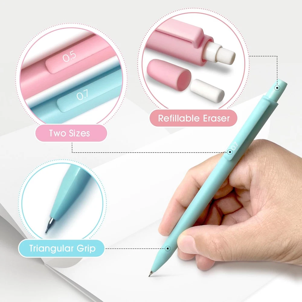 Cute Pastel Mechanical Pencil Set - 6PCS Mechanical Pencils 0.5 & 0.7mm, 6 Tubes Exquisite Set: This perfect mechanical pencil set includes 3 pcs of 0.5mm mechanical pencils, 3 pcs of 0.7mm mechanical pencils, 3 tubes of 0.5mm lead refills, 3 tubes of 0.7mm lead refills, 9pcs cap eraser refills and 3 erasers. Triangular Grip: The ergonomic triangular grip design ensures a comfortable hold and prevents slipping. Combined with a smooth barrel and lightweight construction, it provides a relaxing and efficient writing experience. Dark & Smooth Writing: Pre-loaded with strong, smooth lead that never needs sharpening. Produces clear, dark lines and includes erasers that erase cleanly without leaving traces. Two Nib Sizes: Includes 0.5mm and 0.7mm nibs, allowing for versatile use. These cute mechanical pencils are ideal for writing, painting, drafting, drawing, sketching, and more. Lovely Candy Colors: This pink mechanical pencil set is specially designed for girls and makes an ideal gift for friends, classmates, and family. For any concerns, please contact us for a prompt response within 24 hours.