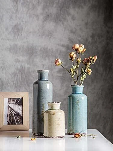 CwlwGO- Ceramic vase 3 Piece Set, Small Flower for Home Multicolored Product Details Material: Ceramic Color: Multicolored Brand: CwlwGO Product Dimensions: 3.2"L x 3.2"W x 10"H Shape: Round Multifunctional decorative vase set: Artificial flowers or fresh flowers that can be Color Choice Will Fit In With An Abundance Of Styles In Any Room , You Will Find One That Fits Your Need, Also Use The Decorative Vase As Flower Vases For Centerpieces, Fireplace Mantel Decor, Dinning Table Decorations.Decorating Your Home Brings Your Personality To Life - Show Your Style With Confidence,To Take Your Décor To The Next Level,And Impress Your Guests. Advantages: The distressed design is so stunning, Color(Teal Gray,Blue,Green),you can use it on its own as a beautiful piece, or add faux flowers, stems, bouquets and greens for a pop of color. Everyday Office Use, Living Room Decoration, Fireplace, Bathroom, Laundry Room, Coffee Table, Restaurant, Shops, Ideal Book Shelf Decor, Flower Arrangement Decoration ShootingProps, Ceramic Simple Vase, Modern Farmhouse Decor, Wonderful Table Centerpieces For Wedding, Graduation, Party. Long Lasting Quality: 100% handcrafted from high-quality ceramic, these vases exhibit excellent corrosion resistance, ensuring the safety and comfort of your flowers. (Dimensions: 3 inches long x 3 inches wide x 10 inches high; 3 inches long x 3 inches wide x 7.5 inches high; 3 inches long x 3 inches wide x 5 inches high) Additionally, this vase is available in four other colors to cater to your decorative needs. Exquisite Gifts Box Packaging: The product comes with custom foam packaging for protection and is presented in a beautifully designed gifts box. This allows you to easily gifts it to your loved ones, making it for weddings, Christmas, housewarming, birthday presents, and more. It makes for a wonderful gifts!