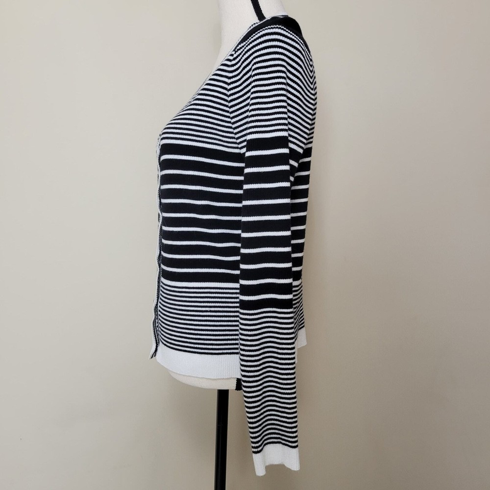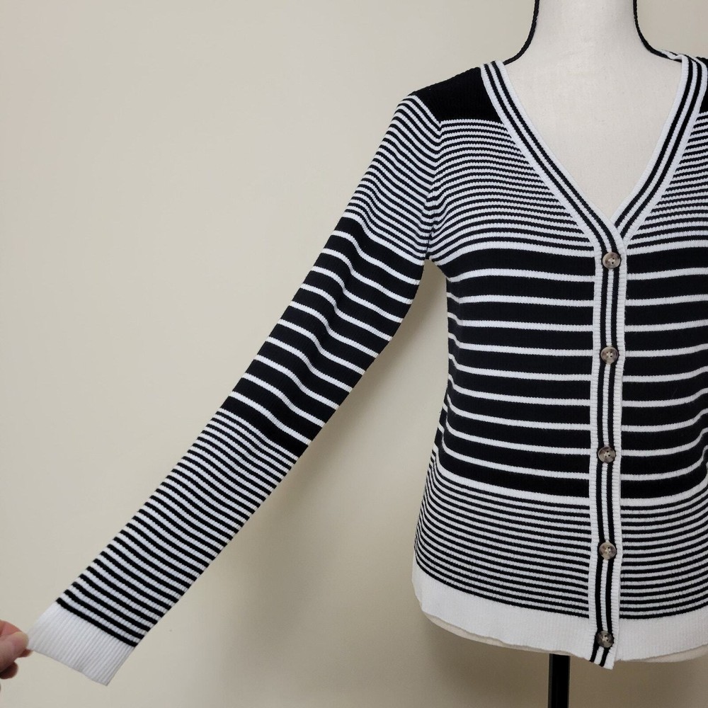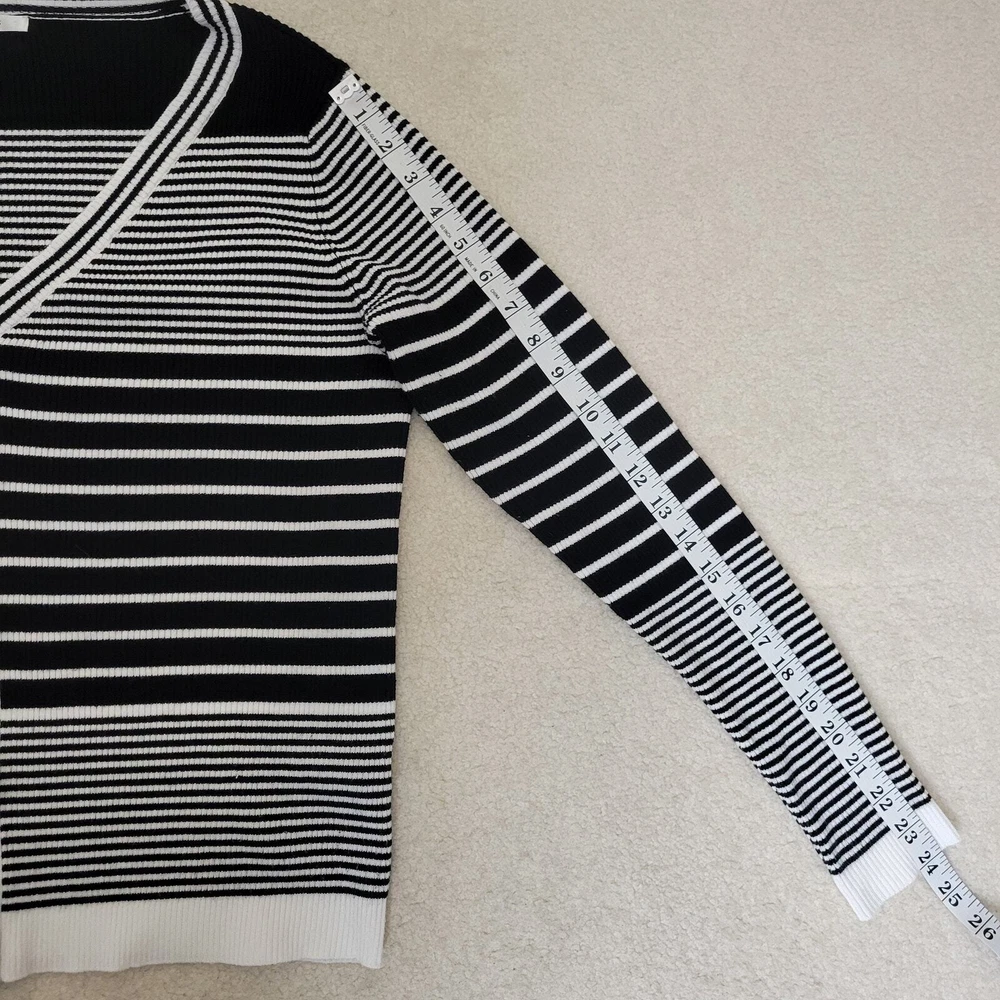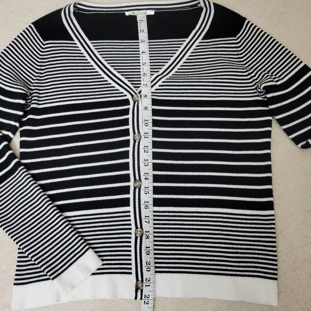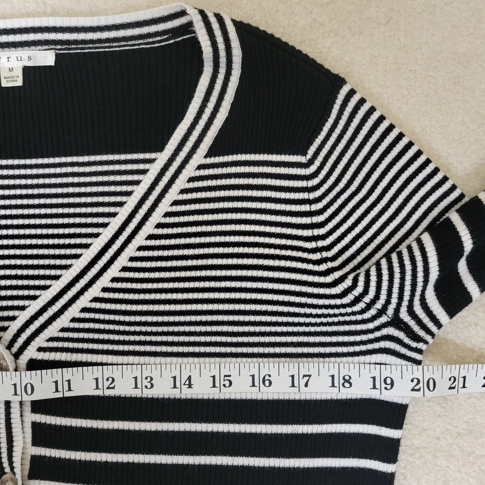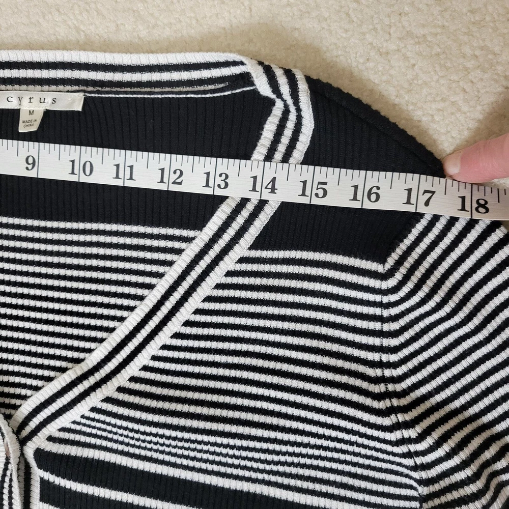 Cyrus Women's Button Front V-Neck Long Sleeve Knit Cardigan Sweater Size-Medium V-Neck Long Sleeve 5 Button Front Closure Stretch Color-Black & White Stripe Lightweight Knit 80% Rayon 20% Nylon Hand Wash/Dry Flat Measurements Laying Flat Approximate: Shoulder To Shoulder-17.5" Armpit To Armpit-20" Sleeve-24" Shoulder Seam To Wrist Lenght-22" Pre-owned In Nice Condition Every Effort Has Been Made To Accurately Describe & Photograph This Item. Some Color May Vary Depending On Lighting & Device Used To View. Please Reach Out If You Have Questions Prior To Purchase. I Am Happy To Help. Shipping From A Smoke & Pet Free Facility. USPS Ground Advantage Reasonable Offers Considered