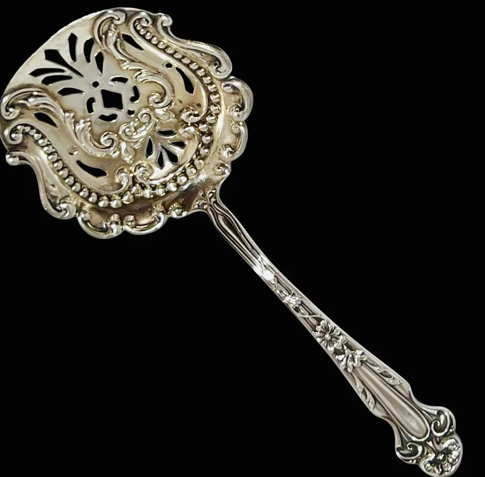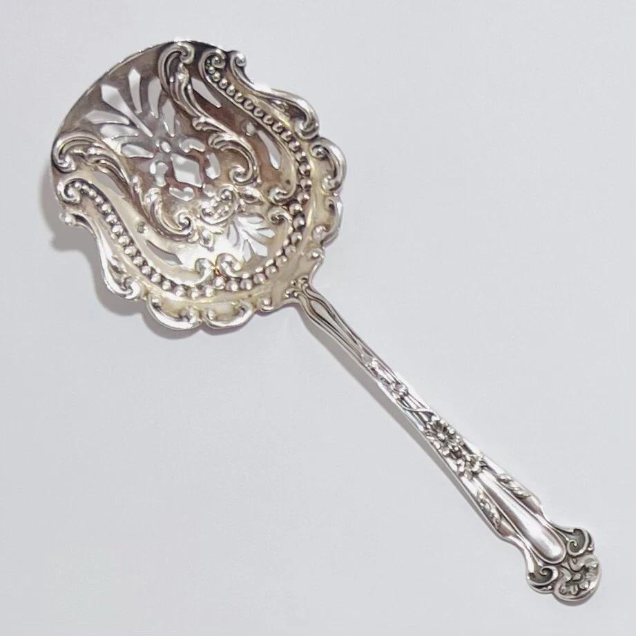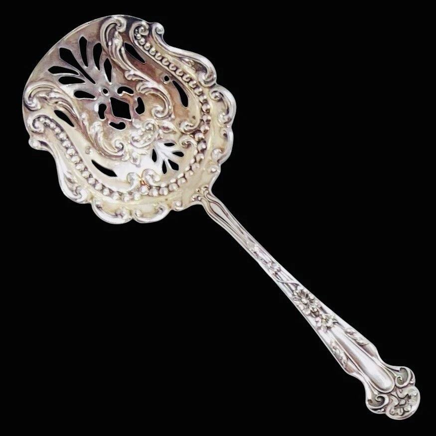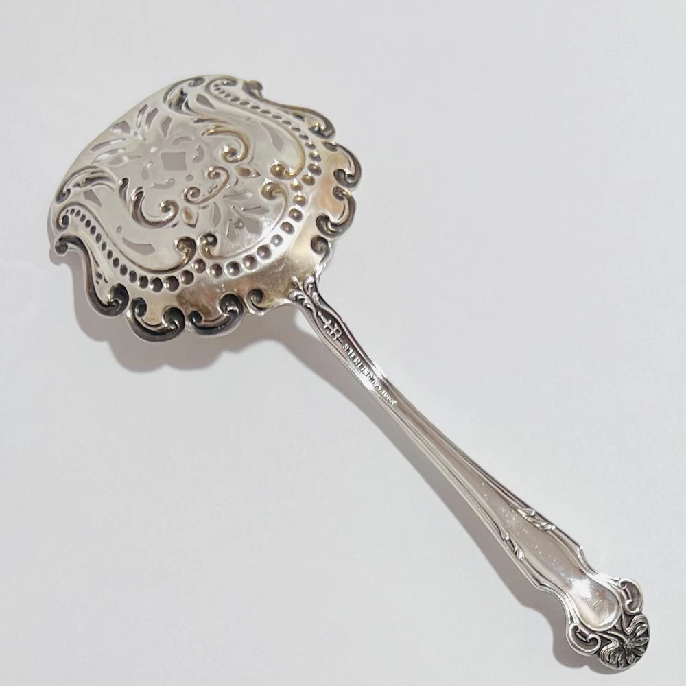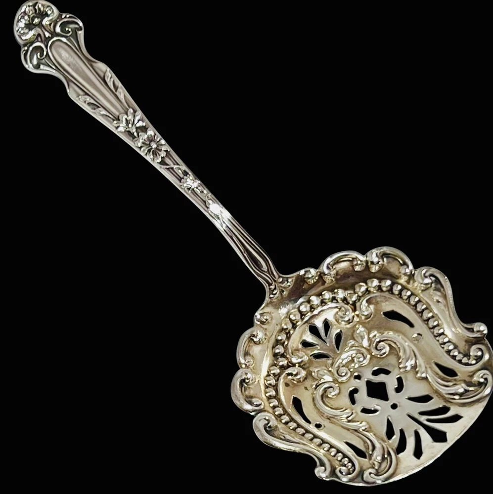 Up for bid is a Lovely DAISY Almond Nut/Scoop Spoon Sterling Silver by R. BLACKINTON & Co. Circa 1904 Length: 5" A beautiful rare serving piece decorated with a gold washed pierced bowl perfect for your next party or holiday gathering! The Daisy pattern by R. Blackinton & Co.was designed by Thomas C. Heath and Charles H. Such in 1904. The art nouveau style of this silverware has daisy flowers that run from the top of the pattern down the center with stems underneath those petals. Please review the photo gallery as it accurately depict the condition of the item you will receive. Thanks for stopping by “JG Coins & Collectibles”!