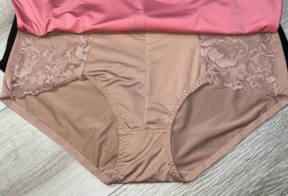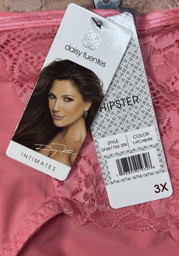 DAISY FUENTES Women’s 3-Pair Brief Hipster Underwear Panties Lace Nylon Blend Size 3X NEW With Tags! 3-Pack WOMEN’S Size Available: 3X STYLE: #DF877AX Description: 90% Nylon, 10% Elastane Color: Peach / Beige / Black Hand Wash Only Imported