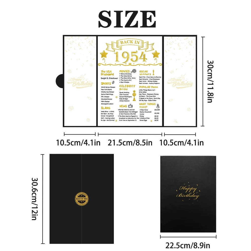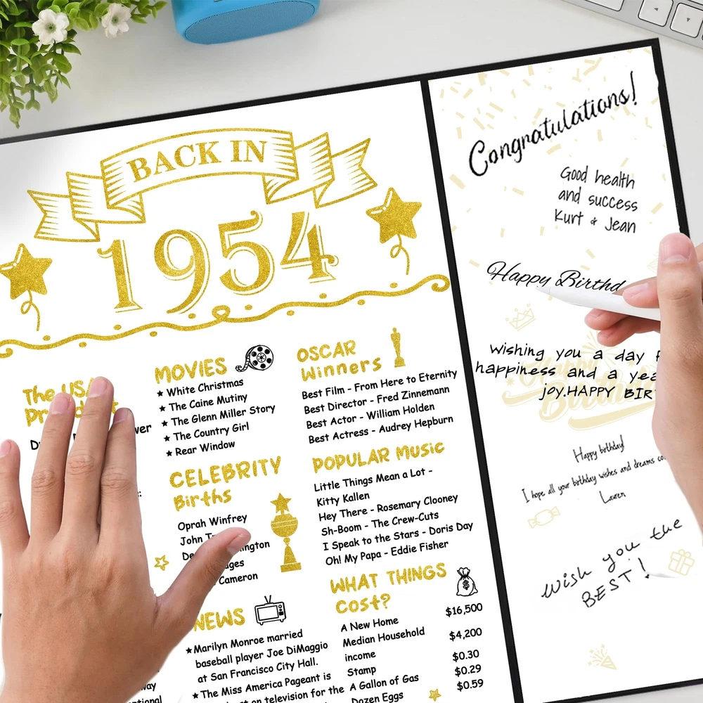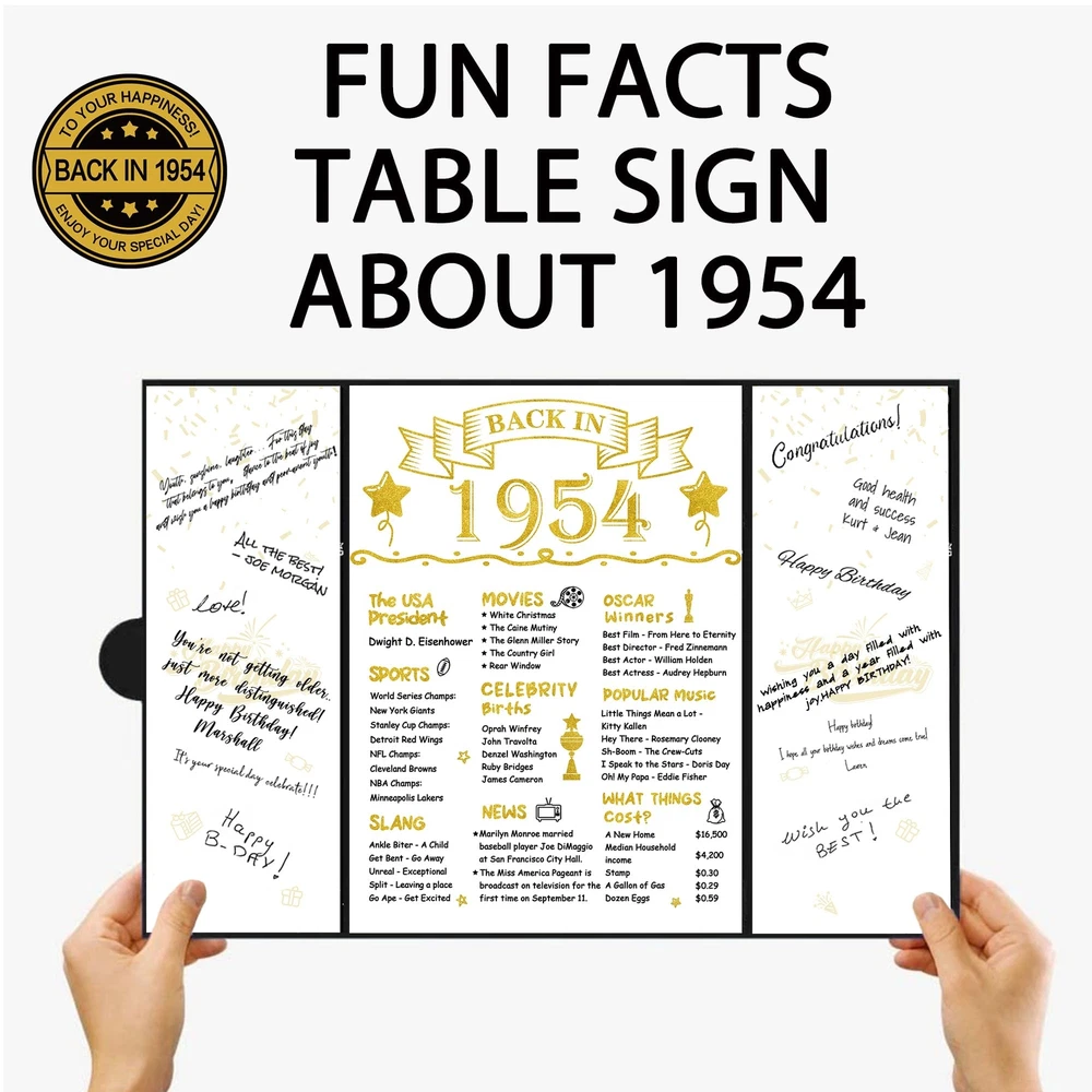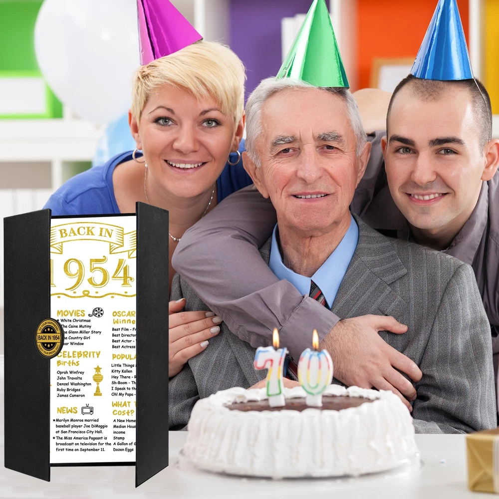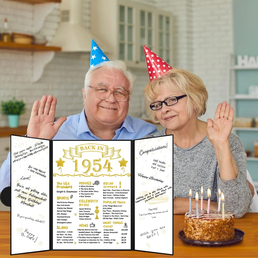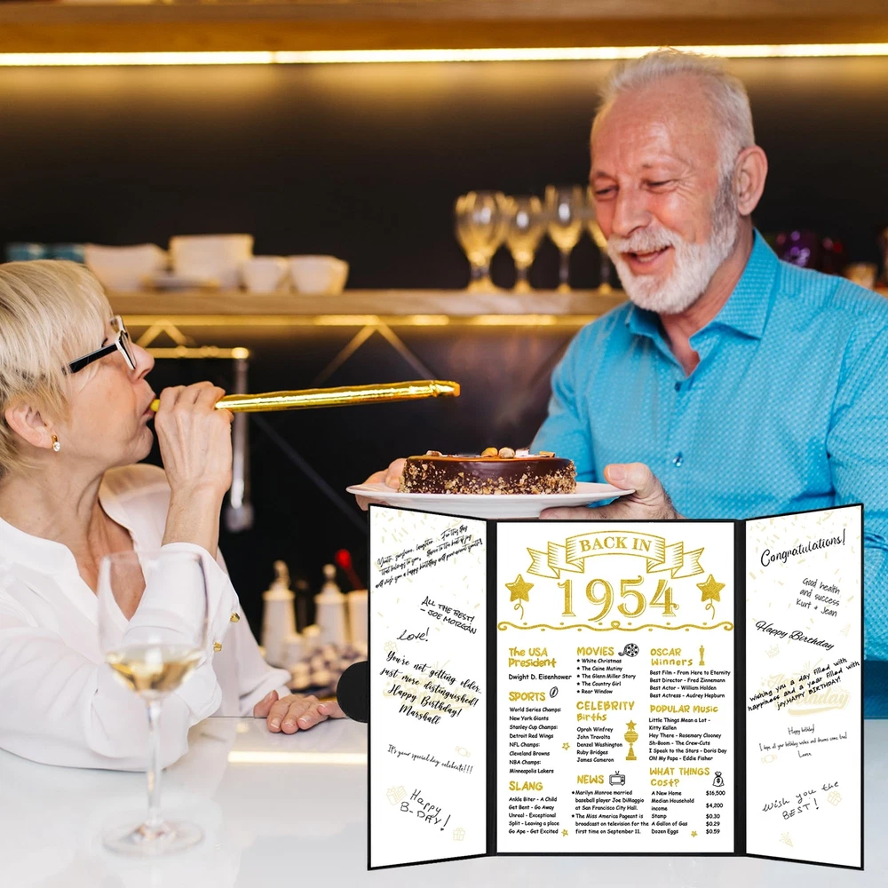 【Package Included】 - You will get a Black Gold Back in 1954 guest book(without pen). It doesn't need to assemble and is a practical tool to sign the names or blessings of the guests at the 70th birthday party. Makes an excellent centerpiece and conversation starter at any party. 【70th Birthday Gift】 - It is an excellent way for your guests, friends, family, and coworkers to create a sincere and timeless souvenir instead of the often impersonal and forgotten ordinary gifts. Our happy 70th birthday certificate guest book can be beautifully displayed and appreciated for years to come because of the durable finish. 【Perfect Size】 - The cover of Back in 1954 70th Birthday certificate sign is approx. 45.6 x 30.6 cm/ 18 x 12inches; the left and right inner page is approx. 10.5 x 30cm/ 4.1 x 11.8inches; the middle inner page: approx. 21.5 x 30 cm/ 8.5 x 11.8inches. It is a fun party decoration idea for your or your parents’ 70th birthday. 【Unique Design】 - The framed cover of the vintage 1954 70th birthday card board is professionally designed with pearlescent frosted paper, with a gilded round badge. There are three parts of the inner page for signature. The internal middle page contains thefun facts which happened in 1954. Easy to write on and won't smear or easily tear. You can sign the best blessing and wishes for your friends, family, or colleagues as a perfect gift. 【Wide Application】 - Decorating your home and party with our black gold back in 1954 70th Birthday Certificate poster will be a big hit at your 70th birthday party. This turning 70 years party decoration is easy to match with other party supplies, creating a warm vibe for your party. Perfect as a decoration for birthday parties for you, your family, friends, or coworker. The 70th birthday guest book can be displayed anywhere in the home or office as cherished reminders of the special day.