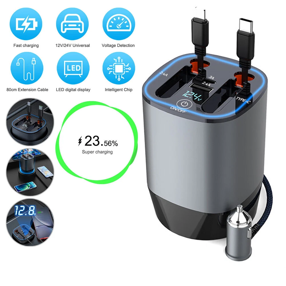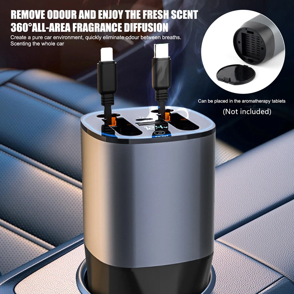 SAFE & SECURE SHOPPING 100% SATISFACTION GUARANTEED FAST SHIPPING Store Categories Store Categories You may also like DC 12-24V 100W 4IN1 USB Type-C Retractable Car Charger Phone Fast Charge Adapter Product Description Features: Four in one interface: Type-C cable+8 PIN cable+USB-C+USB-A four interface charging MAX 100W fast charging: Type-C expansion cable supports MAX 100W fast charging Comes with a retractable cable: Comes with an 80CM long retractable charging cable for easy storage and free adjustment of length Atmosphere lights: Three colors of atmosphere lights, embellishing the car space Aromatherapy compartment (aromatherapy tablets need to be provided by oneself): There is an aromatherapy tablet compartment at the bottom, where you can place your own aromatherapy tablets to freshen the car air Nylon woven cigarette lighter power cord Voltage display: Real time display of current voltage to understand changes in car voltage Specifications: Material: ABS+PC Extension line length: 80cm Input voltage: DC 12-24V Atmosphere light: blue, red, purple (can be turned off) Power output: TYPE-C: 5V/2A, 9V/2A, 12/1.5A. (Supports mobile phone charging display Max 100W) For iPhone: 5V/2.4A, USB: 5V/2.4A Package include: 1* Car multifunctional charger Shipping Returns Contact Us Payment Shipping We ship most of our orders within 24 hours, and may up to 48 hours. If you want faster shipping way, please contact us before making a payment. Sometimes due to problems with our transportation company system, your shipping information may be delayed to update. We recommend that you try again after 3-4 days. If you still haven't checked the shipping information, you can contact us via ebay message. Returns 1. 30 days warranty from the purchased date. Please contact us via email before returning the defective item. 2.Our warranty does not extended to any product that are physically damaged or that are not under normal operating conditions as result of misuse or improper installation on the buyer/user's part. 3.Return items should include the original packaging and all accessories. buyers MUST contact us for the returning address. 4.In all cases, buyers pay shipping fees at their own cost to return products for exchange or refund. We will be responsible for the postage of replacements. Refund will be made upon receipt of the returned item. Contact Us Pls contact us if you have any problems,we will try our best to solve for you Payment We accept all verified payment from eBay. Copyright © 2022 Tongtool