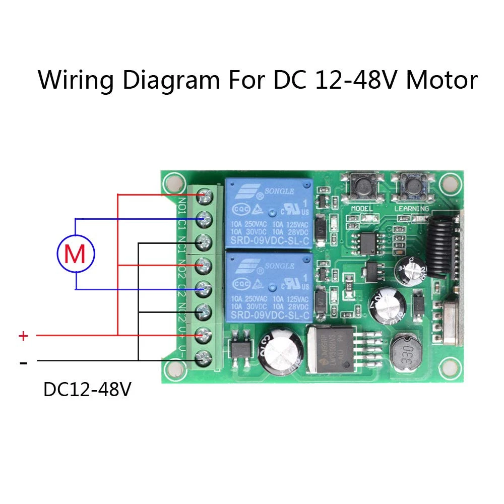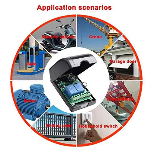 About Receiver: Working voltage: DC12V-48V Quiescent condition: Less than 6mA Working temperature: -40 Degree +80 Degree Receiver sensitivity: more than -105dBm Working frequency: 433mhz Output voltage: DC and AC is optional Output current: Less than 8A Max load current: 10A Size:3.35*2.24*1.02inch About Working way: Working way changed by Model button 1.Momentary: press model button 1 time. Relay: Press and hold -> On; Release -> Off. 2.Toggle: press model button 3 time. Relay: Press -> On; Press same button again -> Off 3.Latched: press model button 2 times. Relay: Press -> On; Press other button -> Off. Delay 5 seconds: press model button 4 times Press remote control A button, the relay A actuates and keeps working 5 seconds. The same as relay B . About Learning and clearing Method: Learning: Learning: press learning button 1 time ,the LED indicator flash then press the transmitter button A , LED indicator flsah 3 times and off ,button A learning successfully. press learning button 2 times ,the LED indicator flash then press the transmitter button B ,LED indicator flsah 3 times and off ,button B learning successfully. Clearning: Hold press learning button about 8 seconds,,indicator from ON to OFF,then press remote ,Relay did not Respond ,it means clearning code successful. About Transmitter: 2.Working Voltage:DC6V 3.Operating frequency :433MHz 4.Remote Distance: 20-50M 5.Operating Current: 13 mAh 6.Encode: EV1527 code 7.Size: 5.7 x 3.2 x 1.1cm Package Includes 2 x Transmitters 1 x Receiver Product parameters:Working voltage: DC12V-48V ;Working frequency: 433mhz;Max load current: 10A(Output current: Less than 8A);Size: 3.35*2.24*1.02inch Easy to Use : Wireless control, easy to install,We have made transmitter and receiver working together and test it before ship it,when you get it don't need to do anything ,just install it. The wireless receiver controller, with high confidentiality, stable performance, easy to change working model Widely Use:the wireless remote control switch can control Lights, Motors, Fans, electrically operated Doors/Locks/Windows/Blinds/Cars or Other Appliances, Widely Used in Homes and Industries Signal:Wireless RF signal can pass through walls, floors, doors or windows. You can use or more units in the same place. You can turn on/ off the receiver with transmitter from any place within a reliable distance(Max range is up to 164ft/50m with no obstacle) 2CH for More Control:2 Channel Wireless Remote Switch,Adjustable working way, control equipment Momentary, Toggle,Latched,Delay 5 seconds