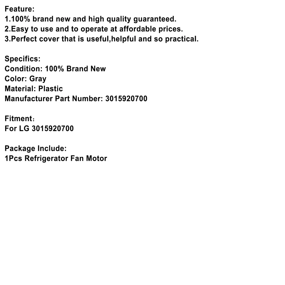 .22 to .50 Laser'Calibrator Laser Calibration Pen Red Laser Pointer Bore Sighter 16.9 USD 17.79 USD Free shipping 5% off For Samsung Galaxy S21 S22 23 Ultra Plus Anti-Spy Privacy Glass Screen Protector 10.78 USD Free shipping Fiber Optic Glock Sights For Models 17 19 22 23 24 26 27 33 34 35 38 39 45 18.8 USD 19.79 USD Free shipping 5% off 24Pcs Gun Cleaning Nylon Picks Tools Kit Rifle Pistol Clean Tool 6 Sets 13.1 USD 13.79 USD Free shipping 5% off Folding Back Up Iron Sight Flip Up Front Rear Set Picatinny Rail KAC300 19.83 USD 20.87 USD Free shipping 5% off 24" Chainsaw Saw Chain 325 pitch .058 gauge 94DL Drive Links Spare Replacement 33.13 USD 34.87 USD Free shipping 5% off DC-DC 12/24V-48V 5A 240W Step Up Car Power Supply Converter Regulator Waterproof 28.3 USD 29.79 USD Free shipping 5% off 25/50/100 Grain Like Gold Tip FACT Arrow Weight Screw Combo 1dz .246 shafts FOC 13.06 USD Free shipping RC3563 Battery Voltage Meter Internal Resistance Voltage Tester Detector 33.92 USD 35.7 USD Free shipping 5% off A/C Retrofit Valve & BPV31 Bullet Piercing Tap-Kit For Refrigerant 15.46 USD Free shipping HT-800 G1 Thread 220V Water Pump Flow Sensor Automatic Control Switch YU 20.7 USD 21.79 USD Free shipping 5% off 4Pcs Brushless DC Cooling Blower Fan 12V 5020s 50x50x20mm 0.18A Sleeve 2 Pin 15.95 USD 16.79 USD Free shipping 5% off 3D Printer Durable Extension Cable kit fit for CR-10/CR-10S Series 3D Printer YU 27.99 USD Free shipping 70MM Steering Wheel Adapter Plate For Logitech G29 G920 13/14inch Steering Wheel 10.78 USD Free shipping Squared Fan Single Cooling Fan with Heatsink For Raspberry Pi 4 Model B/2B/3B+ 10.15 USD 10.68 USD Free shipping 5% off DC12V 0.3A Refrigerator Freezer Rotary Motor Fan Assy For Samsung 3612JL-04W-S49 20.78 USD Free shipping A Fantastic Shop Send us a message Our Store Seller Profile Feedbacks Save this seller Contact DC 12V Double Door Refrigerator Fridge Fan Motor Replacement For LG 3015920700 Feature: 1.100% brand new and high quality guaranteed. 2.Easy to use and to operate at affordable prices. 3.Perfect cover that is useful,helpful and so practical. Specifics: Condition: 100% Brand New Color: Gray Material: Plastic Manufacturer Part Number: 3015920700 Fitment: For LG 3015920700 Package Include: 1Pcs Refrigerator Fan Motor About US About Our Items We strive to describe all items accurately and thoroughly, with the utmost care and attention to detail. However, to ensure a mutually satisfactory transaction, we kindly ask for your assistance in thoroughly reviewing the item description and photos, and addressing any questions before placing a bid. Customer Satisfaction We stand behind our commitment with exceptional service, a 100% money-back guarantee, and a dedication to customer satisfaction. I am readily available to address any inquiries or concerns you may have, both before and after your purchase. Our aim is to ensure your shopping experience is enjoyable and that you're delighted with your purchase. Feedback Your feedback is crucial to our business's success. If you're satisfied with your purchase and the service you received, we would greatly appreciate your positive feedback, along with an overall Detailed Selling Rating (DSR) of 5. Please take a moment to leave us positive feedback. Our eBay account is set up to automatically reciprocate positive feedback once yours is received. If you're considering leaving neutral/negative feedback or opening an eBay/PayPal case, we encourage you to reach out to us immediately. We're committed to resolving any issues to the best of our ability. Shipping Parcel will be shipped using Standard shipping method. For security purposes, items will be shipped exclusively to the confirmed address on Paypal. Please ensure your Shipping address is up to date before proceeding with payment. Estimated delivery time within the United States ranges from 3 to 10 business days, depending on your location. Returns We accept returns within 60 days from the date the buyer receives the item. If the item is found to be defective upon receipt, the customer has up to 30 days from the date of receipt to request an exchange for a new item or a refund. For returns due to a change of mind, we accept items in their original selling condition. However, if the package has been opened due to a mistaken order, it does not qualify for our return policy. Please note that the buyer is responsible for covering the cost of return postage. If you encounter any issues, please reach out to us via eBay message, and we'll respond within 24 hours. DC12V 0.3A Refrigerator Freezer Rotary Motor Fan Assy For Samsung 3612JL-04W-S49 20.78 USD Free shipping Refrigerator Evaporator Condenser Fan Motor Assembly DC 12V For LG EAU63923601 25.78 USD Free shipping DC 12V Refrigerator Evaporator Cooling Fan Motor Replacement For LG EAU63103001 37.78 USD Free shipping DC 12V Refrigerator Freezer Heat Sink Fan Motor For Omar KBL-48ZWT05-1202A 21.78 USD Free shipping 242219204 Refrigerator Evaporator Fan Motor for Kenmore Frigidaire 4546153 38.79 USD Free shipping EAU61524007 Refrigerator Evaporator Fan Motor for LG EAU60694510 AP5950081 23.79 USD Free shipping Refrigerator Handle End Cap Compatible W10917049 for Whirlpool 13.79 USD Free shipping DRCP5030LA Evaporator Fan Motor for Samsung Refrigerator DA31-00146B PS4138373 29.79 USD Free shipping 242018301 242018304 Refrigerator Condenser Fan Motor for Frigidaire Kenmore 31.99 USD Free shipping Replacement Control Jazz Board W10503278 AP6022400 For Whirlpool Refrigerator 31.76 USD 33.79 USD Free shipping 6% off Refrigerator Cooling Fan Motor Accessories For Samsung ZWF-32-140 B17123.4-5(A1) 28.79 USD Free shipping Fridge Freezing Fan Refrigerator Cooling Fan Motor For Samsung DC12V ZWF-30-3 23.55 USD 24.79 USD Free shipping 5% off