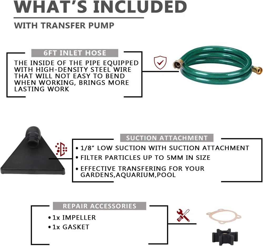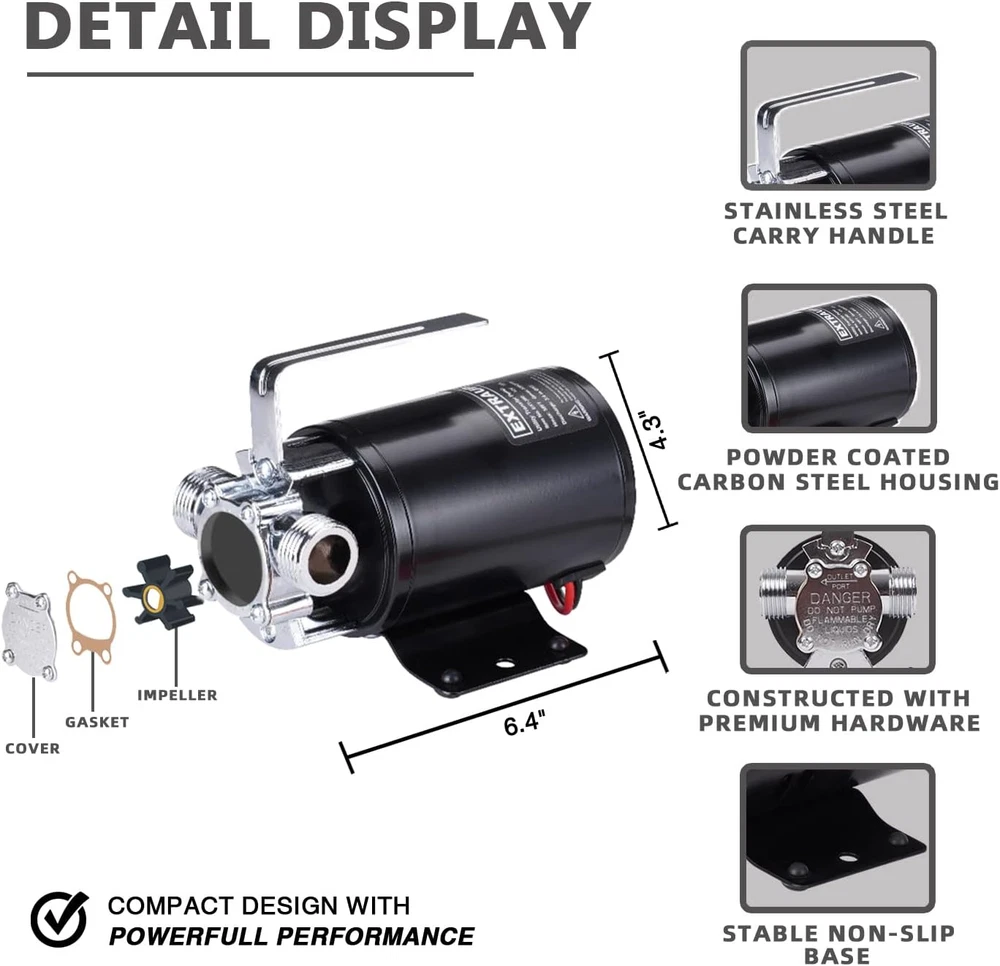 Store New Arrivals Add to Favorite View Feedback Contact DC 12Volt 330 GPH Portable Low Suction Electric Water Transfer Removal Utility Pump with Suction Hose Kit Description Item Package Quantity 1 Style 12v dc Maximum Lifting Height 39 Feet Power Source dc Color Black Product Dimensions 6.4"L x 4.3"W x 5.4"H Material Stainless Steel Country of Origin China Batteries Required? No Item Weight 5.89 Pounds Maximum Flow Rate 5.5 Gallons Per Minute Batteries Included? No Voltage 12 Volts Is Discontinued By Manufacturer No Power: 12volt DC ;Max Flow: 330gph; Max Lift: 39ft Removes Water Down To 1/8" with Water Suction Attachment (Included) Included 6' hose,Water Suction Strainer and impeller kit.This is Self-priming Pump Works great for draining water heaters,water beds,washing machines,or for filling radiant heating systems PLEASE Fill the Water in the Pump Head before First Time use! Product Description Creating Your Dream EXTRAUP is a growing brand in the pumps line and accessories. We have strong quality control system and R&D system. Our goal is to provide the good quality products to meet the clients requirement. EXTRAUP 12Volt Utility Transfer Pump Removes Water Down To 1/8" Works great for draining water heaters,water beds,washing machines,or for filling radiant heating systems. Voltage: 12V DC, 10A Power: 1/10HP Max Flow: 330GPH Max Head: 39FT 3/4" Chrome-plated Aluminum Alloy garden hose threaded connectors DETAIL DISPLAY Sainless Steel Carry Handle , take the utility pump anywhere you want to go. Power Coated Carbon Steel Housing , great for continuous duty use in draining. Premium Hardware Pump Head for against corrosition and abrasion. Non-Slip Base , it is more stable and safety in use. USER'S GUIDANCE This Pump is Non-submersible Only Be Used With Fresh Water Do Not Run Pump Dry The pump must be filled with water through the inlet before operation to aviod running the pump dry. The max vertical suction depth down to thewater source is 3ft , the outlet hose should nolonger than 25 ft . INCLUDED IN BOX 1pc x Pump Motor 1pc x 6' suction garden hose 1pc x Water suction attachment 1pc x Spare impeller/Gasket Tips: This pump is brushless water pump means you do not need to replace the carbon brushes. INSTALL ATION AND OPERATION PLACE THE PUMP on a stable surface. The pump should be less than 10' above and less than 10' to one side of the water source. TO EXTEND THE LIFE OF THE INTERNAL IMPELL Oil the pump with 1/2 tablespoon food grade vegetable oil or mineral oil with each use. Pour the oil in to the water inlet port. DO NOT RUN THE PUMP DRY! CONNECT THE HOSES (1/2” diameter reinforced hose or larger) For best operation the pump by flling the inlet hose with water and put the open end of the hose in the water you wish to pump. With a washer installed attach it to the inlet side of the pump. If this joint leaks air, the pump will not operate. Make the outlet hose as short as possible - 25' or less. INLET HOSE GOES IN THE WATER; OUTLET HOSE STAYS OUT OF THE WATER. MOTOR MUST STAY DRY . Make sure all inlet connections are tight (no air/water leaks) and the inlet hose is in the water. Make sure the end of the outlet hose is not under water. If the outlet hose is under water, the pump may not work. ABOUT US We offer the best prices around on high quality products. Our E-store includes media such as books, movies, music and games while offering electronics, toys, sporting apparel, clothing, tools, general home, garden items and more. SHIPPING We are always working hard to ensure your package arrives as soon as possible. Please understand that some factors like weather, high postal traffic, and the performance of shipping companies are outside of our control. We offer free shipping to the lower 48 states and ship within 2 business days of payment, usually sooner. We do not accept P.O. Boxes. Please provide a physical address. For shipping outside of the continental USA, we only use eBay's Global Shipping Program.The item is shipped to KY and then sent to the rest of the world. International customers are responsible for all duties and taxes. Continue to check out in order to calculate costs for shipping the item to your country. Messages regarding eBay's Global Shipping Program MUST be directed at eBay EXCLUSIVELY. RETURNS We offer a 30-Day Return Policy on items which you are not completely satisfied with. You have the option for a full-refund or an exchange of the item. No returns are available on items shipped outside of the USA. PAYMENT We accept PayPal. CONTACT US This page content is yet to come Please ad us to your favorite seller and visit again later Thank You CUSTOMER SATISFACTION We try our very best to make sure every customer is completely satisfied. If there's a problem, message us! We're happy to help. WE ACCEPT Copyright © 2021 AutoDS. | All Rights Reserved