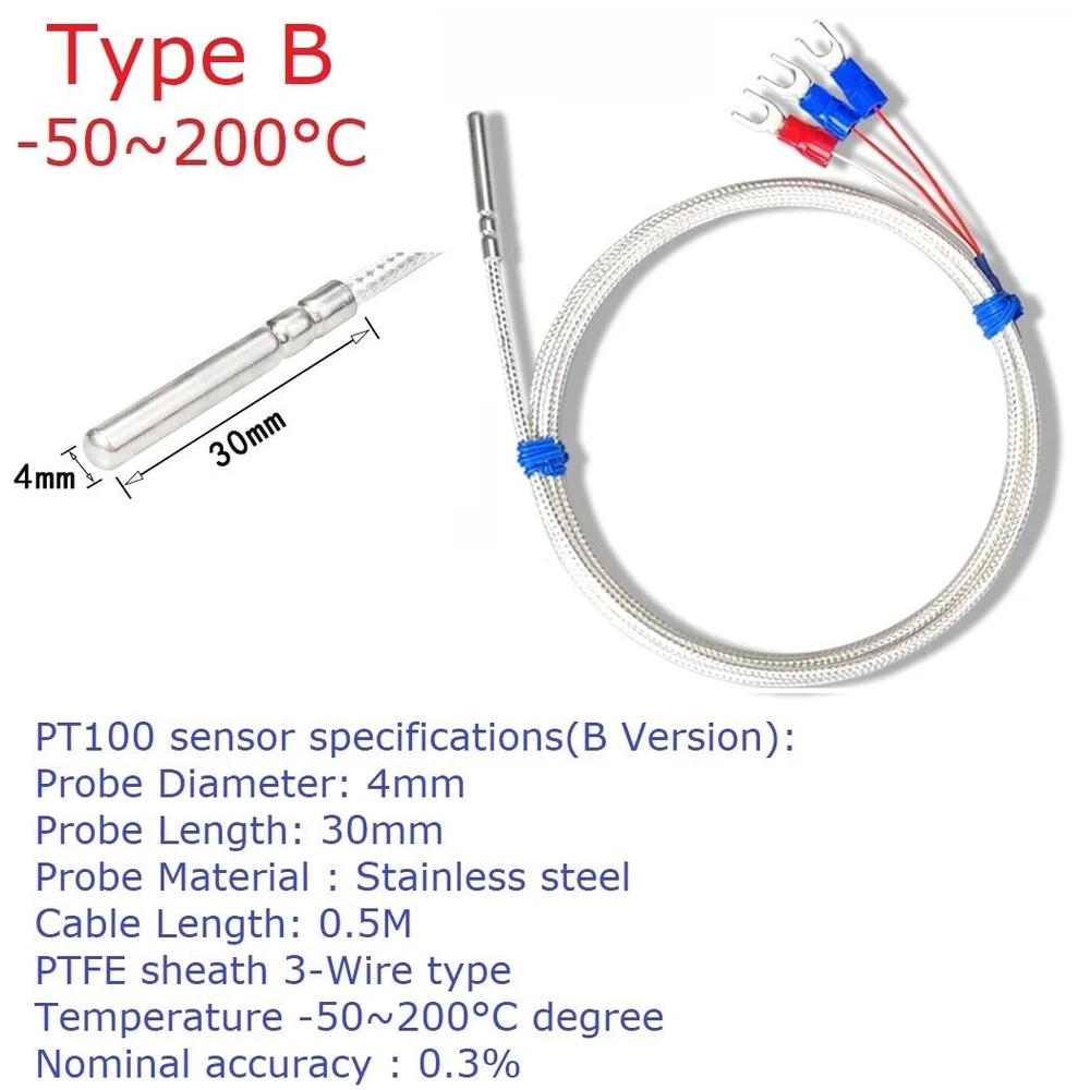 Product Name: 8ch DC 8-30V PT100 RTD RS485 Temperature Sensor Module Modbus RTU Platinum Thermal Resistance Collector -40~500C Packing list: ( Please select the product you need ): 1 PCS PTA8D08 8ch PT100 RS485 Acquisition module Description : PTA8D08 PT100 RS485 Acquisition module Description: Working voltage: DC 8~30V Working current: 14-25MA MODBUS RTU protocol, 03 read command, 06 or 16 write command. Serial port baud rate: 9600 (default), N, 8, 1 By modifying the 485 address, up to 247 modules can be cascaded (more than 16 please use R485 repeater) Can read temperature and PT100 resistance value Adapted sensor: PT100 3-wire or 2-wire sensor Temperature measurement range: A version -40℃ to +220℃; B version -40℃ to +500℃. It is recommended to select a version with a smaller range within the range that meets the measurement. Temperature measurement accuracy: 1%. Size: 136 X 92 X 32MM Weight: 166g MODBUS RTU protocol please refer to : ''PTA8D08 8CH PT100 RS485 sensor protocol'' PT100 sensor specifications(Type A): Type: PT100 Probe Diameter: 6.5mm Probe Length: 30mm Probe Material : Stainless steel Cable Length: 0.5M PTFE sheath 3-Wire type Temperature -200~550°C degree Nominal accuracy : 0.1% PT100 sensor specifications(Type B): Type: PT100 Probe Diameter: 4mm Probe Length: 30mm Probe Material : Stainless steel Cable Length: 0.5M PTFE sheath 3-Wire type Temperature -50~200°C degree Nominal accuracy : 0.3% DIN rail Box parameters: Product model: UM80 Color: Green Width: suitable for PCB board width UM80(80mm) Insulation grade: flame-retardant VO grade Backplane length: suitable for 117 mm PCB boards Net weight: 89g Installation: DIN35 and C45 rail For more information, please contact us!!! Typical application: Thermostatic Controls Industrial Systems Consumer Products Thermally Sensitive Systems Measuring instruments Indoor and outdoor temperature measurement Temperature in vegetable garden Weather forecasting, and monitoring Temperature in Computer Room Warehouse temperature 3-wire probe wiring mode: the red wire is connected to P+, and the other two wires of the same color are connected to P- and GND (the ports are not distinguished). 2-wire probe wiring mode: red wire connects to P+, blue wire connects to P- and G. RS485 bus wiring diagram: