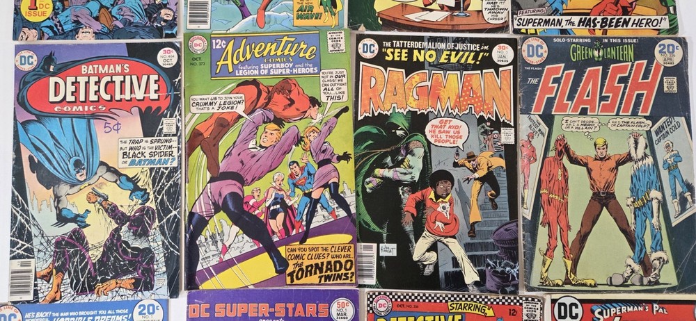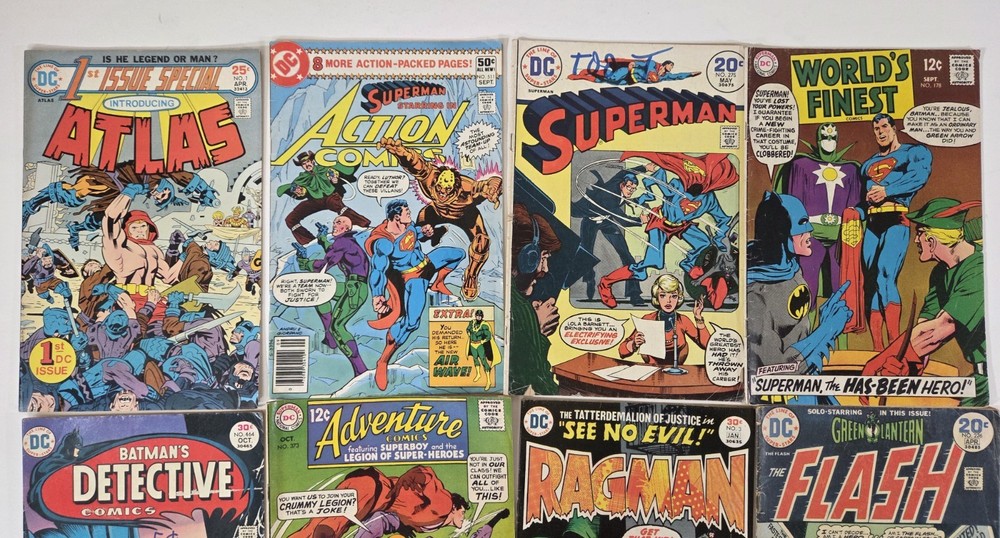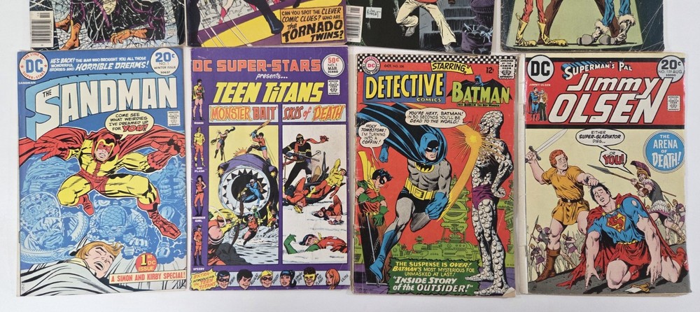 Lot of twelve reader grade Silver and Bronze DC comics. Sandman #1 The Flash 226 with Neal Adams art, Detective Comics #356 with Sheldon Moldoff and Carmine Infantino art, Kirby Atlas #1, Adventure with early Legion of Super-Heroes! World's Finest with Curt Swan and back up story with Wayne Boring. Buy now or make offer.