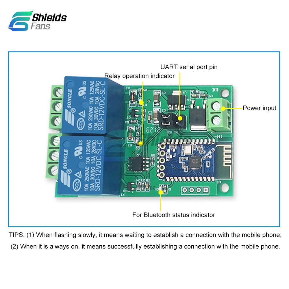 DC12V 1/2/4Channel Bluetooth Relay Module APP Control Switch IoT Smart Home New Single-Channel: 1: Widely used 2: Control distance: 10M (open environment) 3: Provide Bluetooth relay control app 4: Stable performance 5: Easy to understand The single channel Bluetooth relay module includes one channel 5V / 10A or one channel 12V / 10A relay module and spp-c Bluetooth serial port slave module. The switch of the relay can be controlled by sending instructions through the mobile phone app. It is a new and modified version, which is more practical and more stable. Function description: 1. Onboard high-performance MCU and spp-c Bluetooth 2.1 slave module; 2. Provide Bluetooth relay control app; 3. Control distance: 10M (open environment); 4. Working voltage: DC12V; 5. On board 1-way 12V, 10a / 250V AC, 10a / 30V DC relay, which can be pulled in for 100000 times continuously, with diode leakage protection and short response time; 6. Onboard Bluetooth status indicator and relay indicator; 7. UART debugging interface is reserved, which can be used to modify Bluetooth pairing password, etc. 8. Board size: 62 * 20MM 1. Connect the power supply: the in + and in - of the module are respectively connected to the positive and negative poles of 5V / 12V (subject to the actual purchase) power supply. 2. Use app to control 1-way relay. There are two apps available: one is a special app for Bluetooth relay developed by LC electronics, and the other is a general app downloaded from Android application mall 2.1. Instructions for use of special app for Bluetooth relay: 2.1.1. Install the "lcbs test program" app and Bluetooth serial port transmission tool on the Android mobile terminal. Open the app and click "search Bluetooth". The default Bluetooth names are generally bta-04, jdy-30, spp-c, etc. connect the mobile phone to the Bluetooth module, enter the password and click OK (the initial password is 1234). After the connection is successful, the blue light changes from slow flashing to constant on, and then click the box to control the switch of the relay. detailed list: 1 * Relay module 2 Channel: 1. Description: The 5V dual circuit Bluetooth relay module consists of 2 5V//10A relay modules and a SPP-C Bluetooth serial slave module. The switch of the relay can be controlled by sending instructions from the mobile APP. 2. Functions: 1>. On-board loaded STM8S high performance MCU and SPP-C Bluetooth 2.1 slave module 2>. Provide Bluetooth relay control APP 3>. Control distance: 10M (open environment) 4>.Operating voltage: DC5V/12V(Optional) 5>. On-board 2 way 5V, 10A/250V AC 10A/30V DC relay, can be continuously absorbed 100 thousand times. With diode purging protection, the response time is short. 6>. On-board Bluetooth status indicator and relay indicator 7>. Reserve UART debug interface and STM8 SWIM program download interface 8>. Board size: 40*64.5mm 3. Operation description: 1>. Connection power: the IN+ and IN- of the module are connected to the positive and negative poles of the 5V power supply 2>. Use APP to control 2 way relay Bluetooth Relay General APP Usage Description: 2.1>. Android mobile phone installation APP “BlueSPP-37”, Bluetooth serial port transmission tool, used to send relay control instructions. Click “switch”. Then press the gray square in the interface, and then input the name and content of the 2 relay control instructions (the instruction format is HEX) respectively. 2.2>. Open “BlueSPP-37”, APP, click "connect". The mobile phone is connected to the Bluetooth module. After the connection, the blue light turns from slow flash to steady light. Click on the gray square can send instructions to control the switch of the relay. 3>. Additional functions (as USB relay) instructions: Prepare a USB to TT serial module, TTL module GND, TX, RX respectively relay module GND, TX, RX. On the computer, open the serial port debugging software (such as SSCOM32, select baud rate is 9600, send sixteen A0 (HEX) form A0 0101 A2 and A0 0201 A3, you can turn on the first, second way relay separately. The A0 0100 A1 and A0 0200 A2 are sent in the form of sixteen (HEX), and the first, second road relay can be closed respectively. Take the example of opening the relay as an example: 4 Channel: Description: Usage: Telecommunication Voltage: 5V Power Source: DC Theory: bluetooth relay LC 12V Bluetooth 4-channel relay module equip with SPP-C Bluetooth 2.1 slave module and 8 bit high performance MCU, you can control the relay with cellphone APP directly. Protect Feature: Epoxy Contact Load: Low Power Model Number: bluetooth relay module The function and characteristics: 1, On-board N76E003/STM8S003 and SPP-C Bluetooth 2.1 module 2, The relay can be controlled with APP 3, Effective control distance(on open area): 10m 4, Power supply: 12V 5, On-board 12V, 10 A / 250 v AC 10 A / 30 v DC relay, absorb 100000 times continuously, Module with diode effusion protection, short response time 6, On-board optocoupler isolation components, anti-interference ability is strongly 7, On-board Bluetooth indicator and relay indicator LED 8, On-board preserved UART debug interface(Baud rate is 9600) and MCU program interface Interface: IN+, IN-: 12V power input TX, RX: UART communication SWIM, NRST: MCU program interface LED D2/D3/D4/D5(red): Relay indicator LED D1(blue): Bluetooth state indicator, the description of D1 as below: (1)It's means wait for establishing connection with the APP when D1 blink slowly (2)It's means the Bluetooth connect with the APP successfully when D1 on all the time colour:blue Material:PCB size:62.7*63.2mm Package Contents: 1* Module Payment Method Returns Policy Shipping Feedback Contact us Payment Method 1.We accept PayPal payment ONLY, and must be received within 5 days from the date of purchase. 2. It is easy and safe for you to pay by credit cards, debit cards, bank transfers and PayPal account balances. 3.Buyers are responsible for import duties,custom fees and taxes, if any, please c