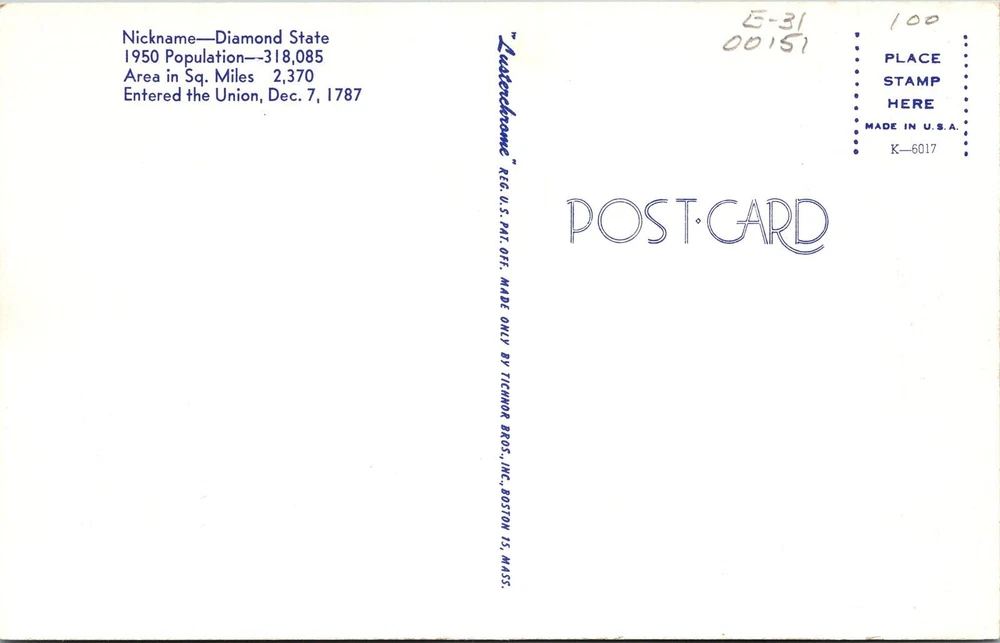 Country/Region of Manufacture: Unknown Original/Licensed Reprint: Original City: Delaware Unit of Sale: Single Unit Era: Chrome Subject: Cities & Towns Country: USA Type: Printed (Lithograph) Theme: Cities & Towns Postage Condition: See Image Region: Delaware