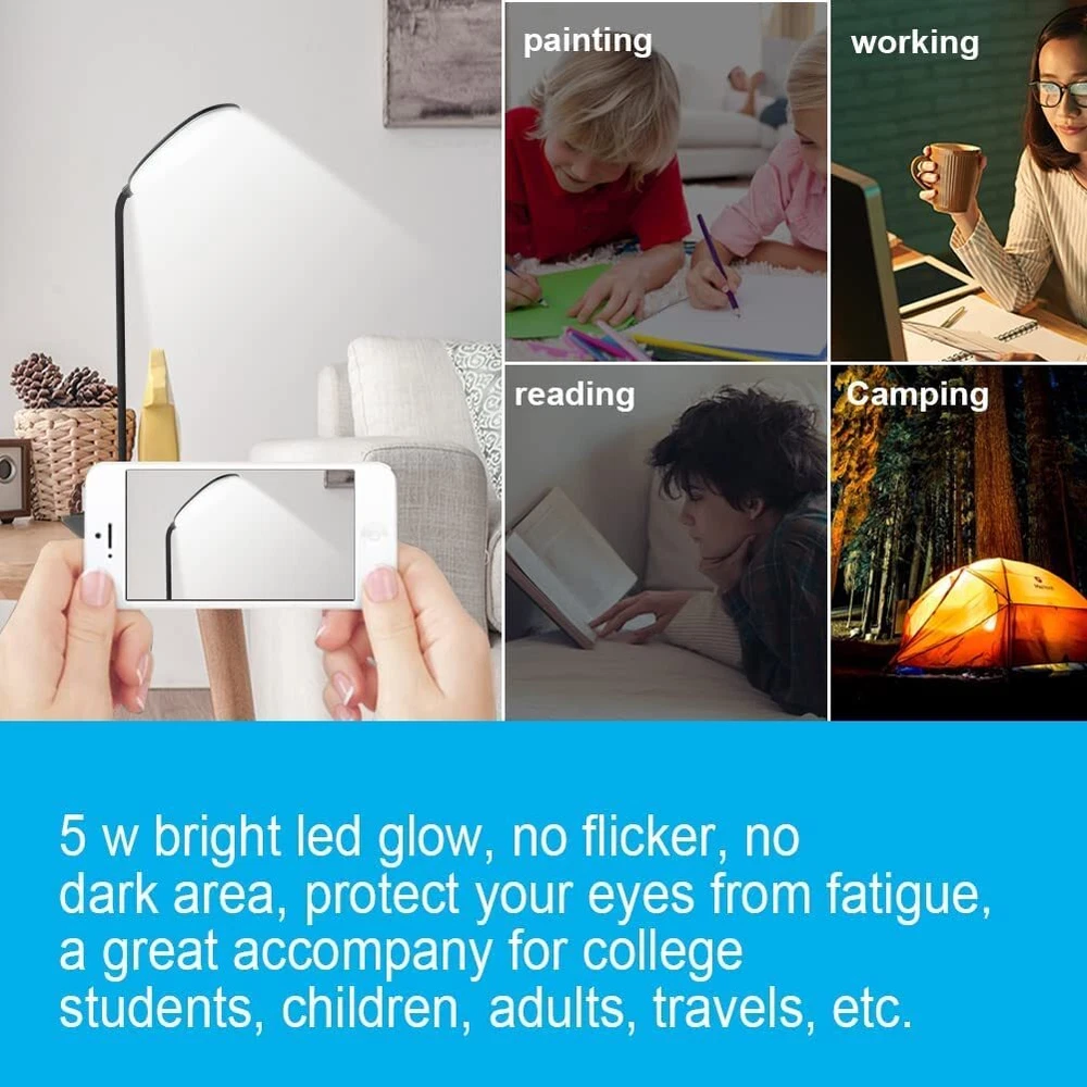 Specifications: Color: Daylight White Power: 5W Material: ABS Plastic Input: DC 5V 500mAh Battery Capacity: 1200mAh Life Time: 10000 hrs Light Source: High Light 18 LED Lamp Beads Cable Length: 1m/3.3ft Color Temperature: 6000-6500K Dimension: 4.7*3.5*14.9 inches Weight: 142g Rotation: 360 Degrees Type: Touch Control, 3-Level Brightness Duration: High 3-4 hours, Mid 6-7 hours, Low 8-9 hours Package Included: 2x Lamp Body 2x USB Cable(without adaptor) 1x Operating Manual Product Features: --Classic Design: Classic minimalist style, white frosted finish, compact and delicate. --Energy Saving: 5W LED Desk Light are eco-friendly, reduces much energy consumption. --Eye Caring: LED white reading light effectively protects eyes from fatigue, providing a comfortable environment when reading, working or surfing the Internet. --Compact and Portable: This desk lamp is in small size. The arm can be adjusted to the base. It is easy to carry around. --USB Charging Port: You can connect it on your computer, mobile power bank or any USB adaptor.( Adaptor is not packaged with the lamp. ) --Please charge it in time when the lamp become dim. More Application: As a wireless built-in battery lamp, the lamp can be used when we are reading in bedroom and study, working in office, or watching videos on computer, and can be used in camping, fishing, and some outdoor activities. It is also a good emergency lamp during power cuts and a night light when sleeping. Warranty: We provide one year warranty for all our products. If you have any question, please feel free to contact us. Battery Operated Desk Lamp: Equipped with built-in battery, no need to plug in when using, cordless and portable to take to anywhere freely, especially there is limited outlets and power outage happens( Please notice that the lamp should be charged to protect the battery's lifespan if long time no use) Dimmable Touch Control Table Lamp: Touch sensitive control with 3-level brightness adjustable, best for reading, working, studying, crafting, displaying, camping or emergency use, suitable for college dorm, office, bedroom, living room, kids room, bathroom, etc Flexible and Foldable Study Lamp: with 360°flexibility, the gooseneck lamp allows you to light up where you needed. It also can be folded into a small lamp so that it don’t take up too much space when travel Rechargeable desk lamp with USB port: Equipped with universal USB charging cable, so that you can charge this small desk lamp with USB adapter, power bank, desktop, laptop while lighting it up, saving time to wait Eye-caring and Energy Saving LED Light: 5 W bright led glow, 400 lumens at full brightness, no flicker, no dark area, protect your eyes from fatigue. 12 months warranty is provided for this portable lamp, and if you have any issue with it, pls email us to solve