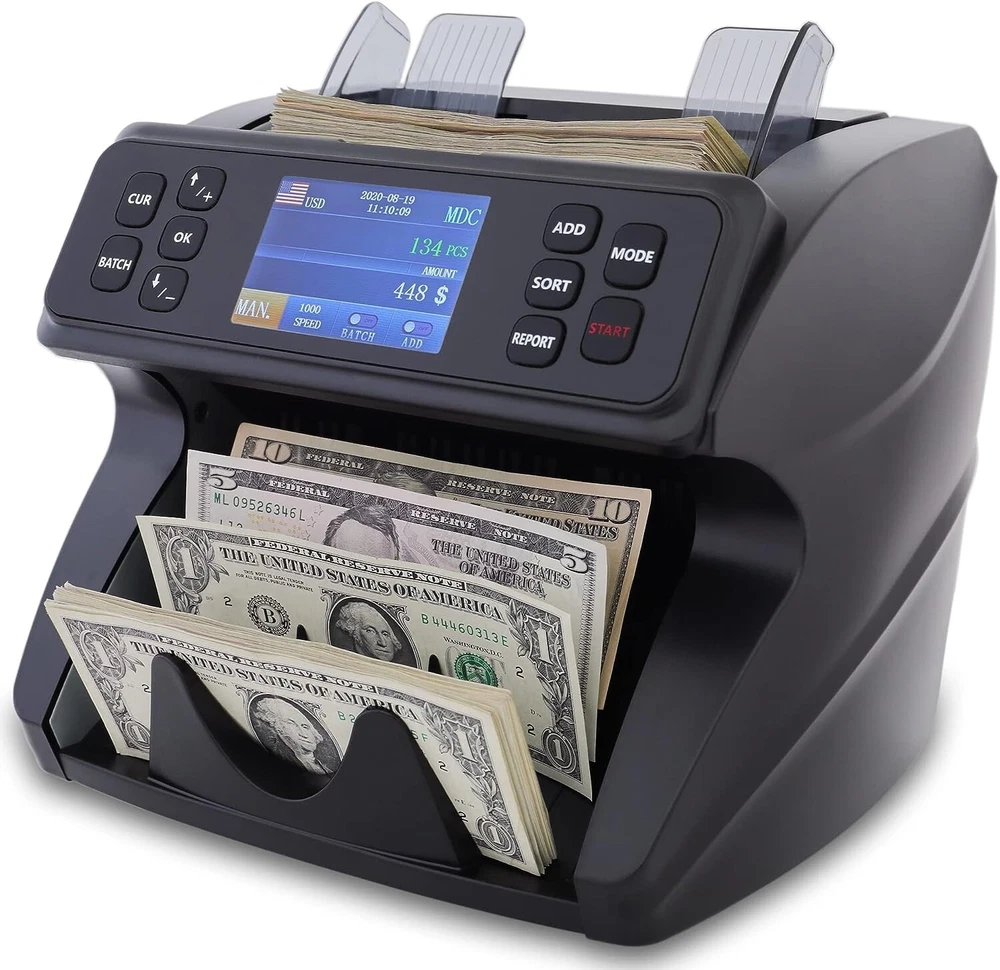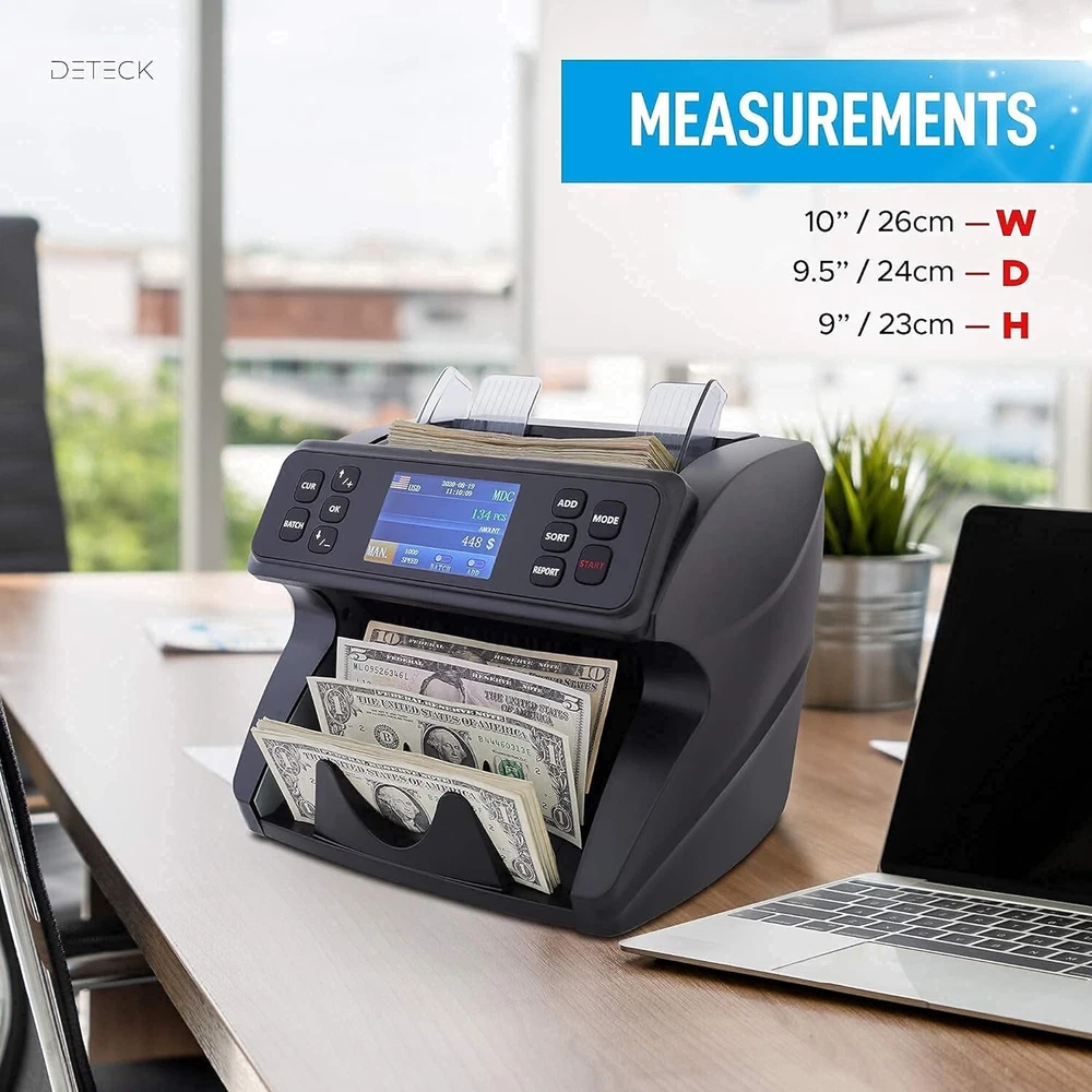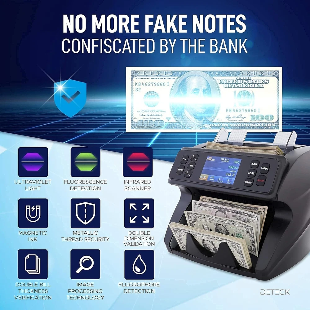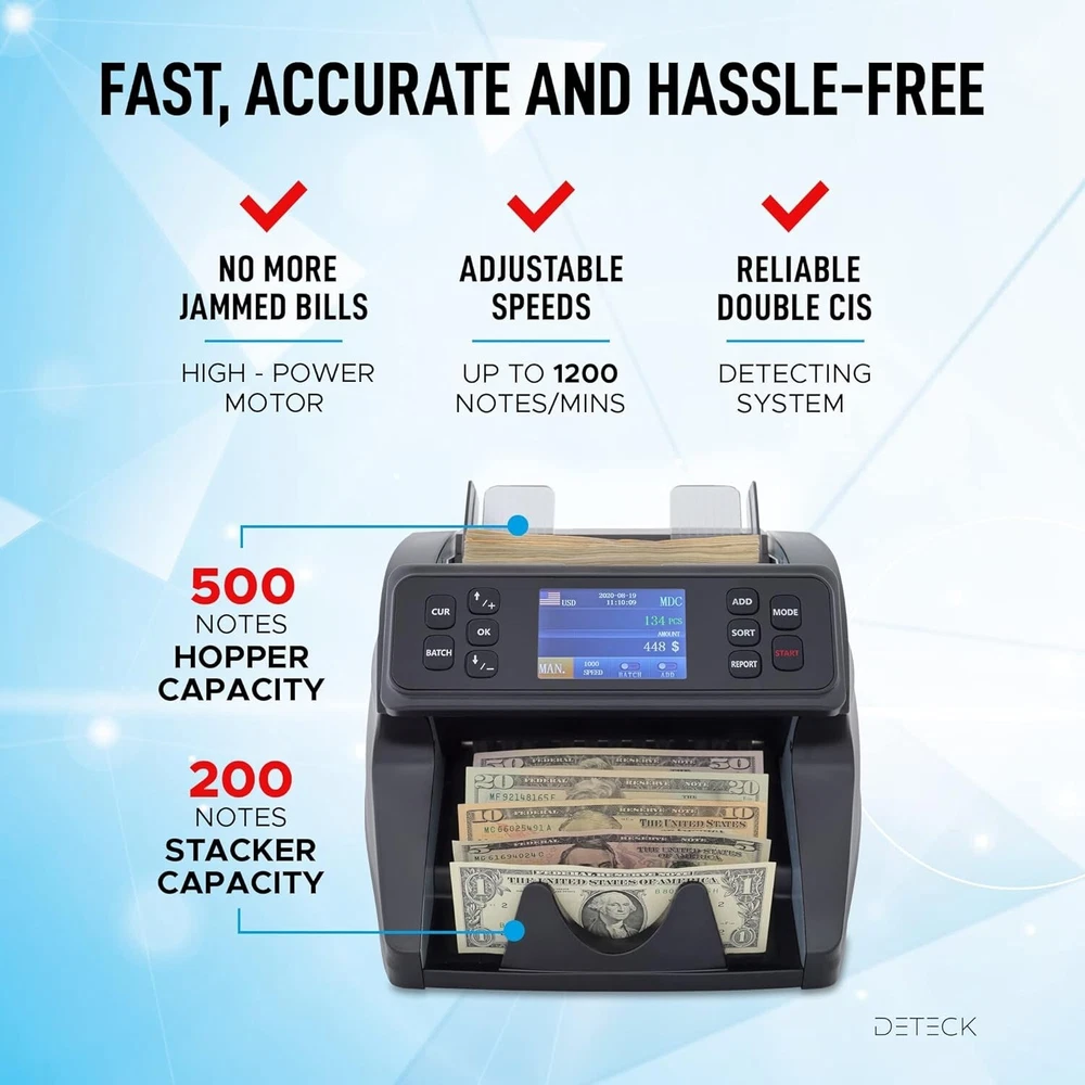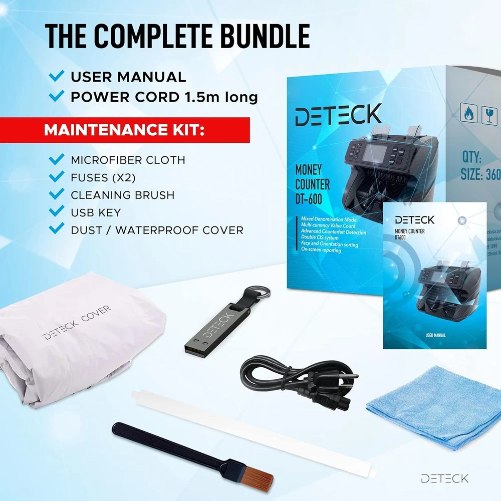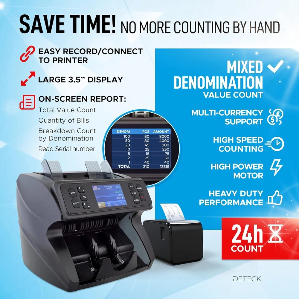 60 days returns 2-year quality warranty Lifetime free upgrade 24/7 Service and Support for you ๐ฆ๐ฎ๐๐ฒ ๐๐ถ๐บ๐ฒ ๐ฐ๐ผ๐๐ป๐๐ถ๐ป๐ด ๐๐ผ๐๐ฟ ๐บ๐ผ๐ป๐ฒ๐ - While other mixed denomination money counter constantly report errors and keep resetting, the DT600 is the perfect solution for a 100% accurate and reliable mixed denomination currency counter machine (usd,cad,mxn,eur,gbp); You can pull out a detailed on-screen report with grand total amount, quantity of bills & value by Denom. Connect easily to a printer (not incl.). We value your priorities ๐ฃ๐ฟ๐ผ๐๐ฒ๐ฐ๐ ๐๐ผ๐๐ฟ ๐ฏ๐๐๐ถ๐ป๐ฒ๐๐ โ If you deal with a large amount of cash and want to have a peace of mind, the Spark DT600 international money counter with counterfeit detector accurately scans notes for authenticity, providing maximum security using advanced sensors UV, MG, IR, MT, 2CIS and Serial number recognition; you will never have to worry again about fake bills confiscated by the bank. Operate with confidence ๐๐ผ๐ป๐๐ฒ๐ป๐ถ๐ฒ๐ป๐ ๐ฎ๐ป๐ฑ ๐ฒ๐ฎ๐๐ ๐๐ผ ๐๐๐ฒ โ Spark DT600 Money counter machine mixed denomination has a built-in high quality friction nudge rubber to cash count all type of new & worn banknote and sort by denomination, face, orientation (you have to manually remove bills while sorting otherwise check out the DT800 with Reject Pocket for uninterrupted count and sort). Counting money at the end of the day has never been smoother ๐๐ฎ๐๐ ๐ฎ๐ป๐ฑ ๐ฎ๐ฐ๐ฐ๐๐ฟ๐ฎ๐๐ฒ โ If you are tired of counting money by hand and want to save time to focus on your business without worrying about jammed or flying bills, Spark DT600 mixed bill money counter machine industry-leading roller friction system made in the USA and widened impeller will allow you to accurately count up to 1200 notes per minute with no interruption; Its high-power motor provides a heavy-duty performance at ultra-high speed around the clock. Itโs never been easier ๐ญ๐ญ๐ฌ% ๐๐ฎ๐๐ถ๐๐ณ๐ฎ๐ฐ๐๐ถ๐ผ๐ป ๐ผ๐ฟ ๐บ๐ผ๐ป๐ฒ๐ ๐ฏ๐ฎ๐ฐ๐ธ - Deteck is a US-based company, we take pride in designing & delivering only premium money machine counter for North American Businesses; this product is backed by a 3yrs full warranty against defects & lifetime tech support (1-year standard manufacturer and 2 years free extended warranty upon activation on our website - use code EW2). We have a dedicated US-based support team to answer all your questions. Take advantage of it