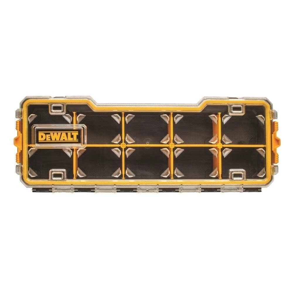 About This Product This DEWALT 10-compartment organizer with removable dividers is optimal for hand tools and small parts. Features a Polycarbonate durable lid. Side latches enable stacking to other PRO organizers. Highlights Removable dividers for inner customization 10 compartments Heavy-duty transparent polycarbonate lid Unique lid design keeps small parts from moving to other compartments Side latches enable stacking to other units including DWST14825 deep pro organizer, DWST14925 shallow pro organizer and DWST14830 20-compartment pro organizer Limited lifetime warranty Genuine DEWALT accessory Dimensions: H 2.9 in, W 6.5 in, D 17.4 in We offer FAST AND FREE SHIPPING on all USA orders We usually handle the order within 4 days (often 2-3 days), and it usually takes 3 days for delivery. It means you will receive your order no later than 7 days after payment. We use FedEx, USPS or UPS ground Please note that slight color differences may be due to differences in lighting and computer screen resolution. Local pick up is not available at the moment We DO NOT offer shipping option to PO BOX address, warehouse address, freight company address. If you have any queries, Please give us the opportunity to resolve the issue before leaving any negative feedback :(. We usually respond within 24 hours. Thanks for shopping with us. We appreciate your business! Have a nice day.