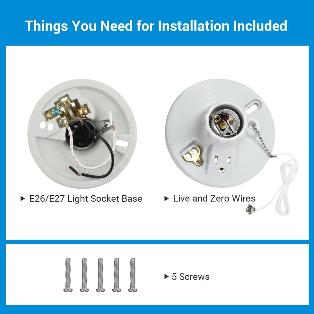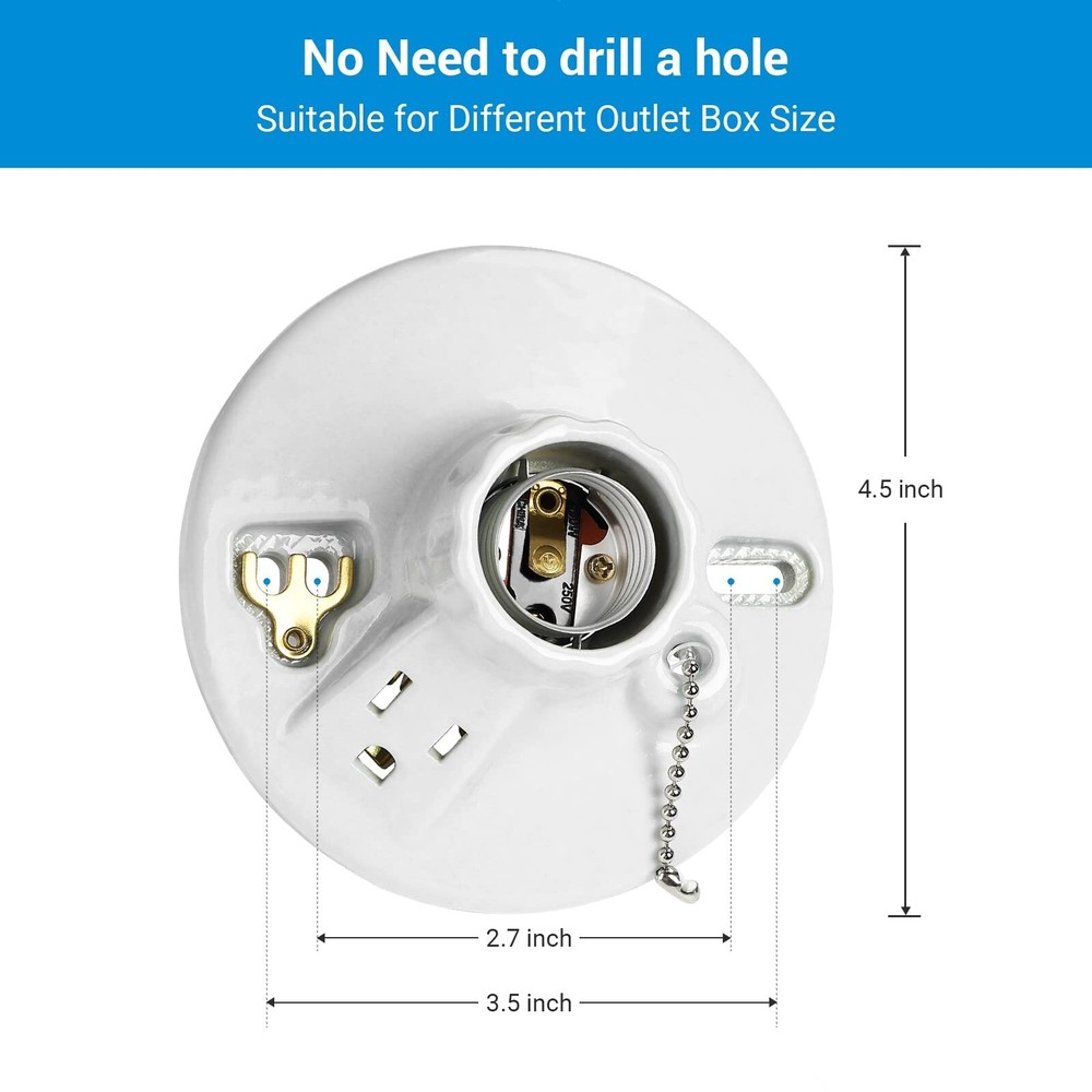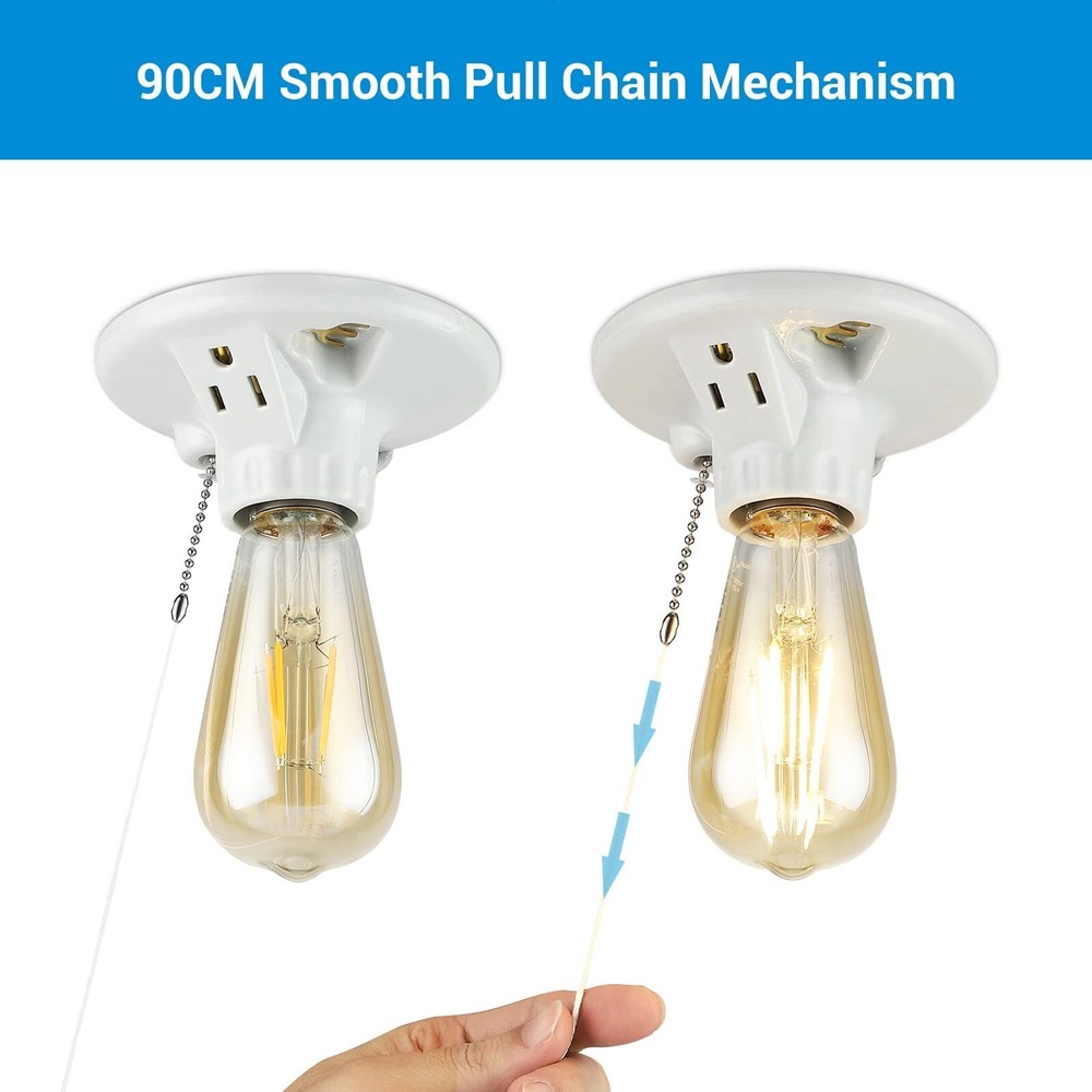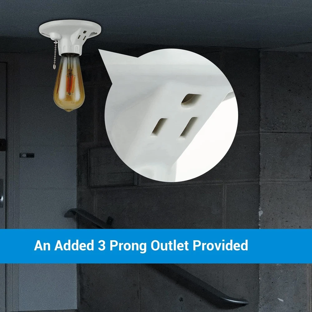 DEWENWILS Light Socket with Grounded Outlet, Porcelain Pull Chain Light Fixture, E26/E27 Base, 2 Pack, UL Listed Brand DEWENWILS Material Porcelain Color White Base Type Medium Product Dimensions 3.5"W x 4.5"H About this item STURDY LIGHT SOCKET BASE - Made of porcelain materials, the light socket offers robust quality in use, providing a new lighting location in narrow spaces, including basement, garage ,closet, attic, etc. ONE GROUNDED OUTLET - Equipped with an always-on 3 prong outlet, you can have a power place for an additional lights or appliance EASY INSTALLATION - The porcelain light socket is specially design for easy installation, saving your trouble from drilling holes, suitable for different outlet box sizes SMOOTH PULL CHAIN - Using pull chain to turn on/off the bulbs on the light socket, 90cm pull chain operates smoothly and long enough for use COMPATIBLE BULBS - E26/E27 bulb base, compatible with incandescent, CFL or LED bulbs (max. 660W), power rating: 125 VAC, 15A, INDOOR use only, UL Listed (Item does not ship to Miami&Doral, FL), have any problem please contact us !