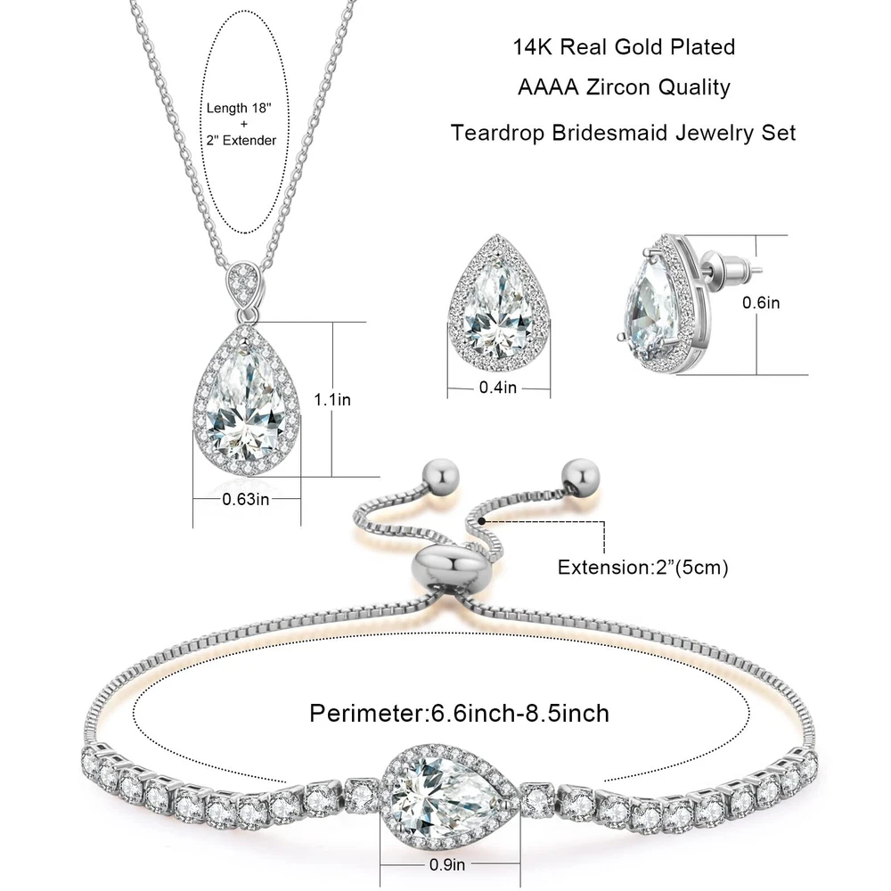 DHQH Cubic Zirconia Teardrop Necklace and Earring Set for Wedding with Crystal Link Bracelet Bridesmaids Jewelry Sets for Women Wedding Party Jewelry for Bridal Bridesmaid Product Details Color: A-Teardrop Jewelry-Silver Brand: DHQH MPN: Does not apply UPC: Does not apply EAN: Does not apply Department : womens Date First Available : February 24, 2022 Brand, Seller, or Collection Name: DHQH Metal: Copper Material: Copper Gem Type: Goldstone Clasp: Lobster Clasp Number of stones: 4 Bridesmaid Jewelry set Features: Easy to wear: Bridesmaid Teardrop necklace earrings and bracelet set is in quality material, and light to wear. After several days of accompanying the bride, you still not feel any burden on your neck or ears, giving you a comfortable wearing experience. Practical Bridesmaid jewelry set: The bridesmaid jewelry set for wedding is delicate and attractive, and you may give the set to your bridesmaids as souvenirs, then you both will remember the wedding and the happy time. Bridesmaid jewelry set Specifications: Material: copper/AAA Grade Cubic Zirconia Color: silver Quantity: 3 piece Size: as shown in the picture Package includes: 1 xBridesmaid Teardrop Bracelets 2 x Bridesmaid Teardrop Stud Earrings 1 x Bridesmaid Teardrop Necklace Notes: Manual measurement, please allow slight errors on size.The color may exist a slight difference due to different screen displays.To better maintain the jewelry set for wedding, please remove it before swimming, showering, or other water related activities.Small items included, please keep away from little children.