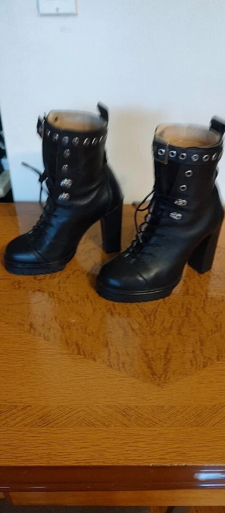 This gorgeous women's black leather platform ankle boot comes with leather buckled straps that can be used on the boots or not. Worn once for about 5 minutes but they didn't work for me since I have VERY difficult feet. 4.5" heel 2 sets of interchangeable buckle straps to place on the outside of the boot after lacing it up.