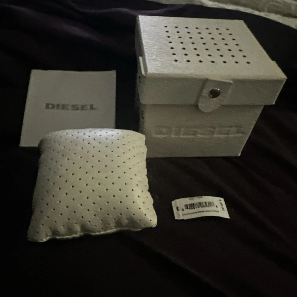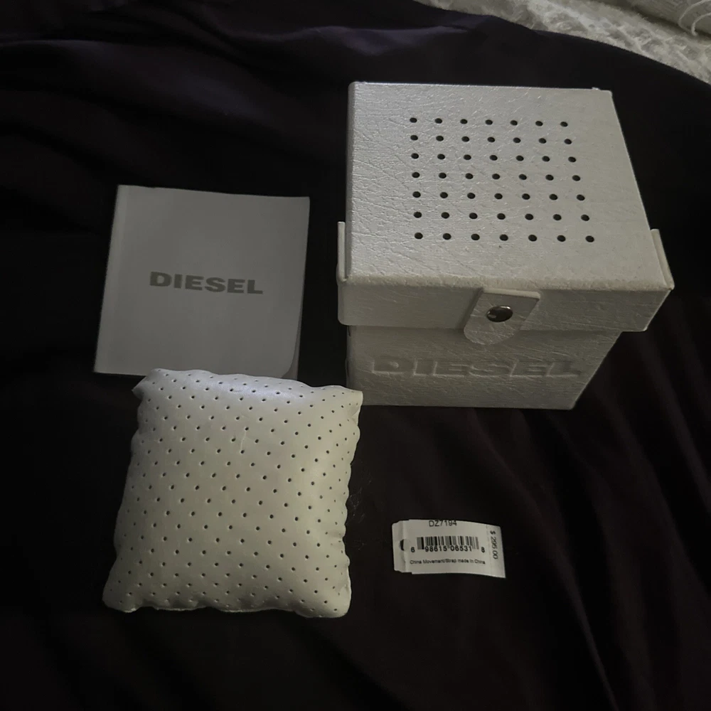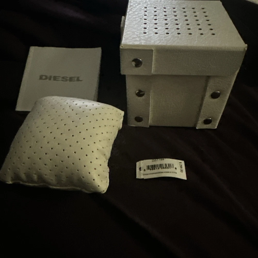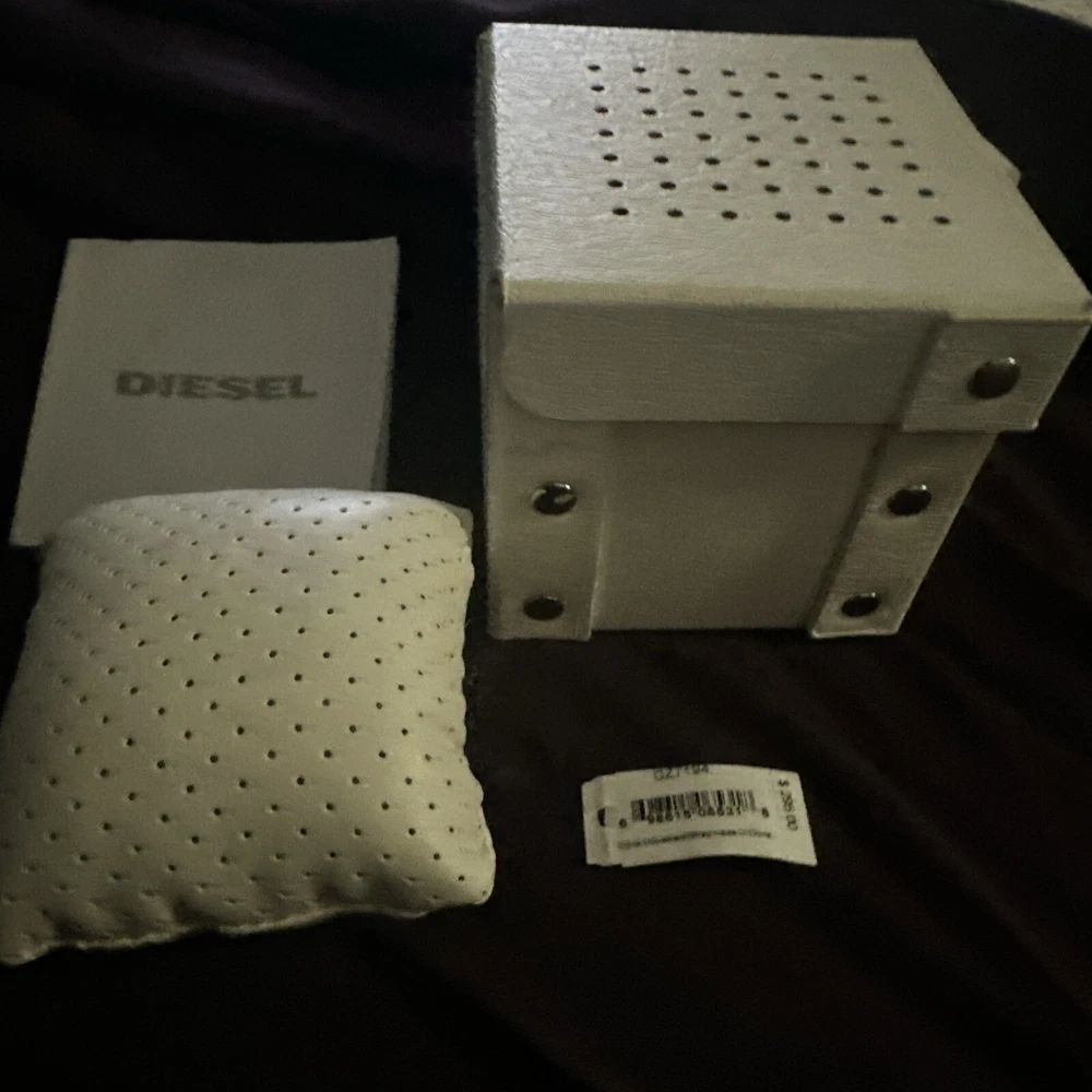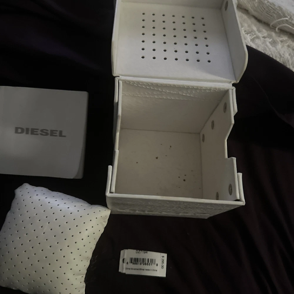 This storage box with pillow from Diesel is perfect for storing your favorite watches. The box can hold up to 3 watches and comes in a stylish white color. The faux leather, metal, and fabric materials make this box a durable and long-lasting addition to your collection. The box is perfect for those who want to keep their watches safe and organized. The pillow adds a touch of comfort to the box, making it a great addition to any room decor. This storage box with pillow is a must-have for any watch enthusiast. Box only…. No watch Signs wear view pictures of inside area etc has some faded areas on side stains inside