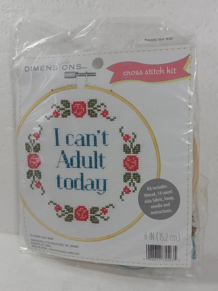 Express your creativity with this DIMENSIONS Cross Stitch Kit featuring the phrase "I CAN'T ADULT" in a small, round hoop included. This kit has everything you need to create a beautiful cross-stitch masterpiece. The brand is well-known for its high-quality products, and this kit is no exception. The hoop is bundled with the kit, making it a complete set for you to start stitching right away. The theme of the kit is words and phrases, and it features a style of small cross-stitching. This kit is perfect for those who love to create and express their unique style. Make a statement with this DIMENSIONS Cross Stitch Kit and create a beautiful piece of art that will last a lifetime.