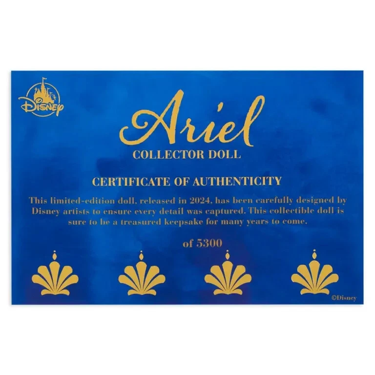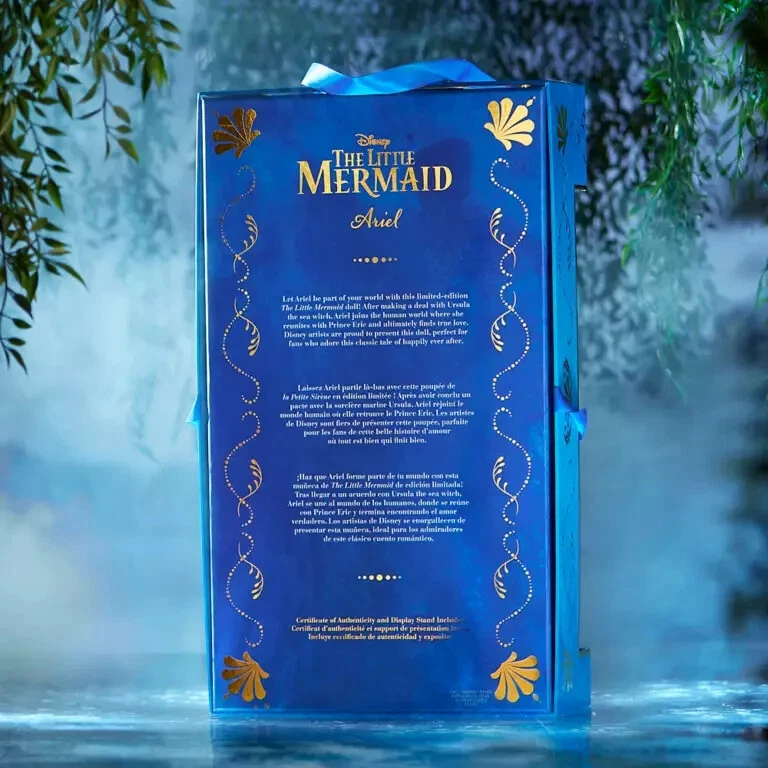Product Details Let Ariel be part of your world with this limited-edition The Little Mermaid doll. After making a deal with Ursula the sea witch, Ariel joins the human world where she reunites with Prince Eric and ultimately finds true love. Disney artists are proud to present this distinctive Ariel doll, costumed in a lavish interpretation of her on-land peasant dress. Magic in the details Limited Edition of 5,300 Certificate of Authenticity Expressive, highly detailed sculpting Poseable Satin peasant dress with cold shoulders Chain necklace with pendant Chiffon puff sleeves and ruffled neckline Satin corset with golden filigree embroidery and satin ribbon ties Brocade overskirt with contrast trim and golden filigree embroidery Faceted gemstone studs Satin skirt Slip skirt with fine lace trim Molded shoes with satin ribbon ties Satin hair ribbon Finely styled hair Rooted eyelashes Display stand included Comes in elegant window display packaging with golden foil accents, ribbon ties and carry handle Celebrating the 35th Anniversary of Disney's The Little Mermaid (1989) The bare necessities Ages 6+ PVC / ABS plastic / polypropylene / polyester Doll: approx. 16'' H Package: approx. 18 3/4'' H x 11'' W x 5 3/4'' D Imported Item No. 416143347900