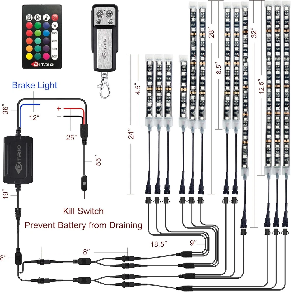 Quality & Reliability as Priorities: LED strip kits for motorcycles have difficult working conditions – fluctuating voltages, instantaneous higher currents etc., this LED strip kit focuses on how to make it work and last Maximum Brightness: LEDs with gold bonding wires – 30% higher electrical conductivity, 3.55% more light than the cost-effective material copper; 60 LEDs per meter, up to 1,000 Lumens per meter Bigger Capacities for Brighter Bikes: 3 x 3A big MOSFETs, wires of AWG 22 & 24, ensuring strips more than enough power supply even you double the strips for a bright “Christmas tree” 2 Additional Blinking Brake Lighting Styles: Besides the default solid red light as an additional brake signal, M12r now comes with 2 blinking styles, available via the 24-key remote Music Mode: An independent microphone in the control box, gold-plated pins, a 60X sensitivity, beautifully follows the rhythms of your music