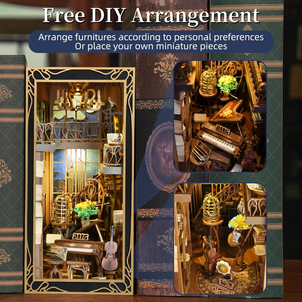 B0CJTXKZ2B 【Design Concept】Pianist with Nightingale booknook, draws its inspiration from the captivating era of the Art Nouveau movement. This artistic masterpiece is a homage to the design styles that defined the Art Nouveau period, a celebration of art, nature, and the harmonious fusion of the two. It invites you to step into a bygone era of creativity and beauty, where every intricate detail pays homage to the spirit of the New Art. 【Bring Fun to Life】Our DIY book nook kit is the perfect blend of fun and relaxation. Spend 6-10 enjoyable hours assembling this miniature dollhouse booknook, enhancing your dexterity and patience along the way. Plus, the downloadable E-manual, easily zoomed for clear part identification, ensures a stress-free experience. 【Premium Quality Materials】These 3D wooden puzzle bookends are crafted meticulously from imported, durable wood, these 3D wooden puzzle bookends guarantee lasting enjoyment. The wood's thickness and durability assure you of years of use. Rest easy knowing that our booknook kit materials are not only safe but also highly resistant to bending or breaking. 【Extra LEDs & Dust Cover】Warm LED lights distributed in the right places infuse a cozy ambiance into your miniature private dollhouse, enveloping you in the enchanting world of books. What's more, we've included a dust cover, simplifying cleaning and safeguarding your dollhouse bookshelf insert. 【Unique & Thoughtful Gift】Looking for a distinctive and heartfelt gift for an art enthusiast? Our book nook kits for adults and teens are the ideal choice. Whether they're seasoned miniaturists or beginners, this kit is sure to kindle their creativity and ignite their imagination. 【Warm Notice】Rest assured that our Booknook Bookshelf Insert Decor Alley undergoes thorough checks to ensure all accessories are complete and intact before delivery. Should you encounter any assembly questions, our dedicated support team will promptly resolve any issues. Please note: You will need to provide 2 AAA batteries.